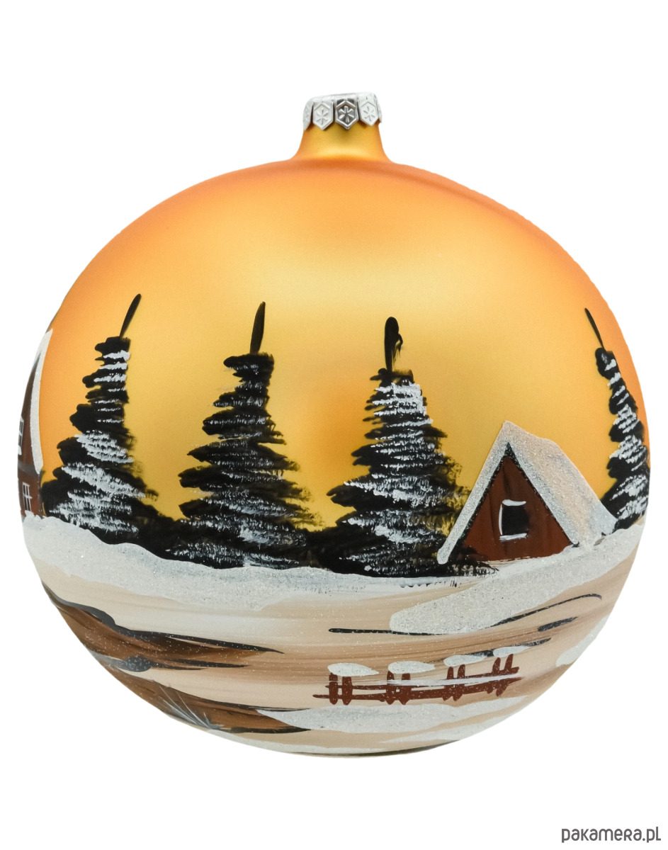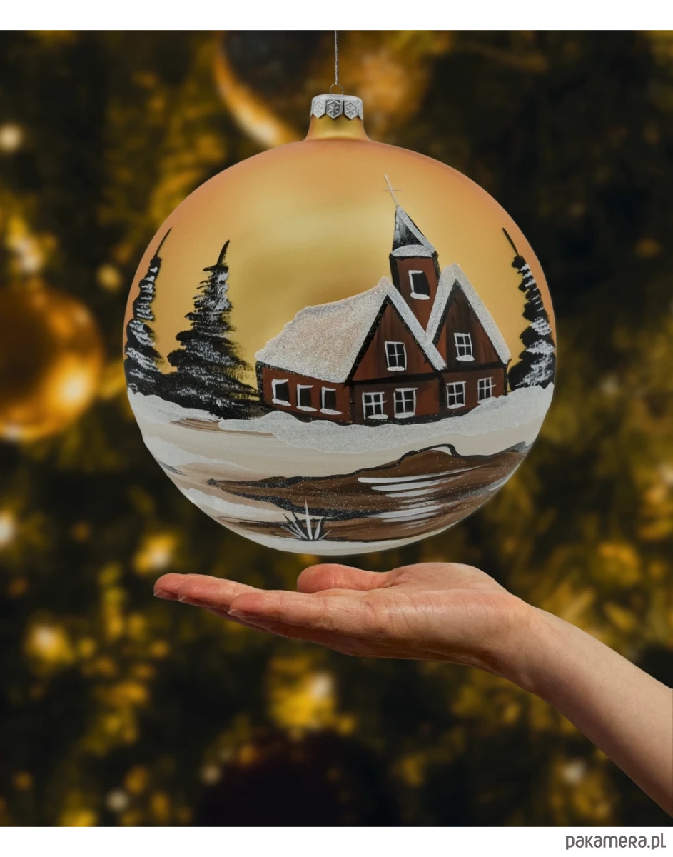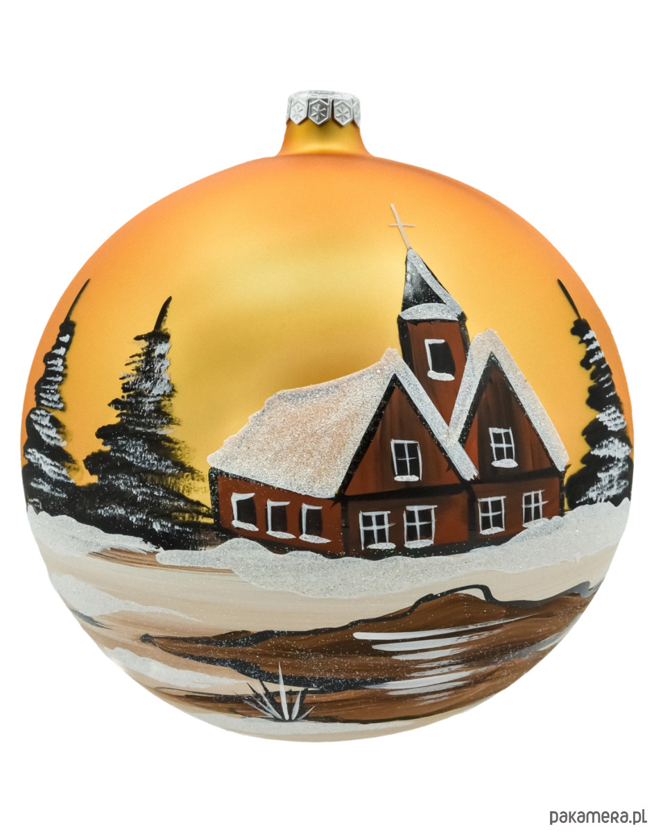 Na bombce przedstawiono malowniczy, czerwony kościółek z wysoką wieżą, pokryty śniegiem i brokatem, symbolizujący zimową idyllę. W tle widać majestatyczne drzewa otoczone śnieżnym krajobrazem, a całość rozświetla intensywny, złoty kolor tła, nadający bombce wyjątkowego blasku.