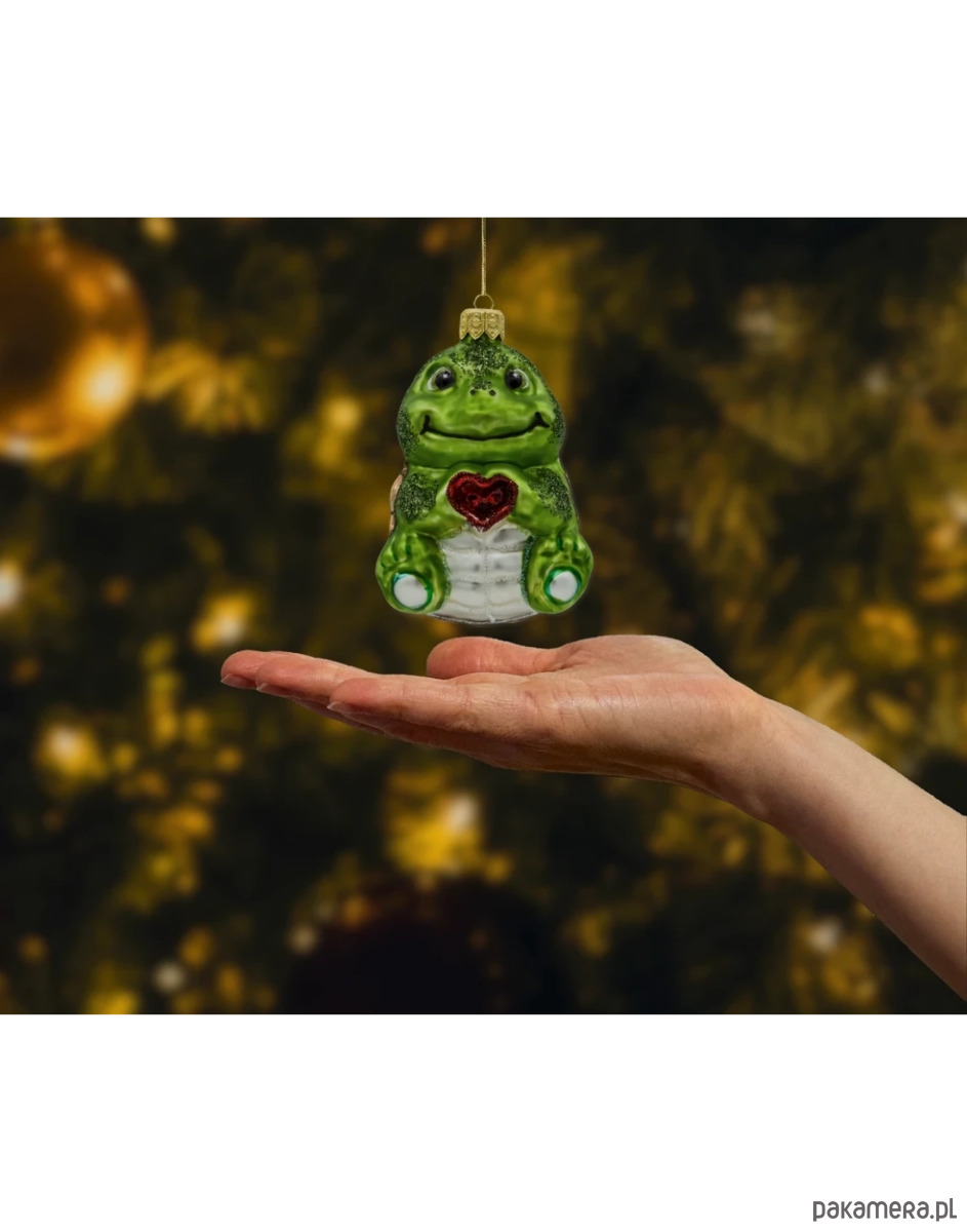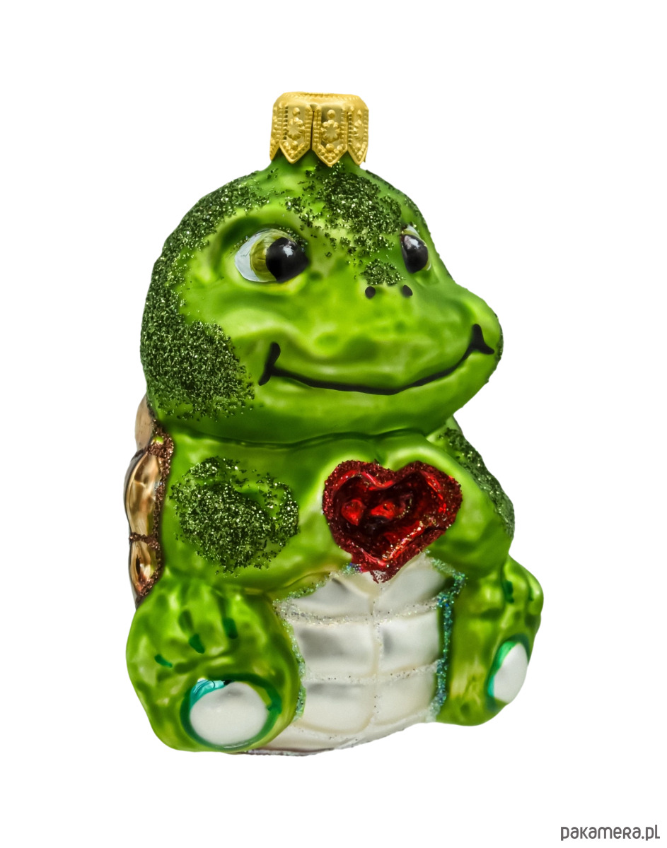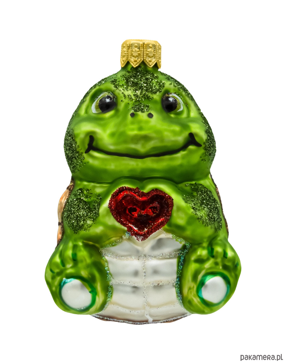 Front bombki zdobi uroczy pyszczek żółwia z szerokim uśmiechem i czarne, błyszczące oczka o pogodnym wyrazie. Jego zielony pancerz lśni głębokim odcieniem szmaragdu, z eleganckim, miedziano-złotym obramowaniem i akcentami z drobnego brokatu. Cechą charakterystyczną figurki jest wypukłe, czerwone serce umieszczone na klatce piersiowej żółwia – ręcznie malowane i ozdobione czerwonym brokatem, co dodaje mu wyjątkowego, świątecznego wyrazu.