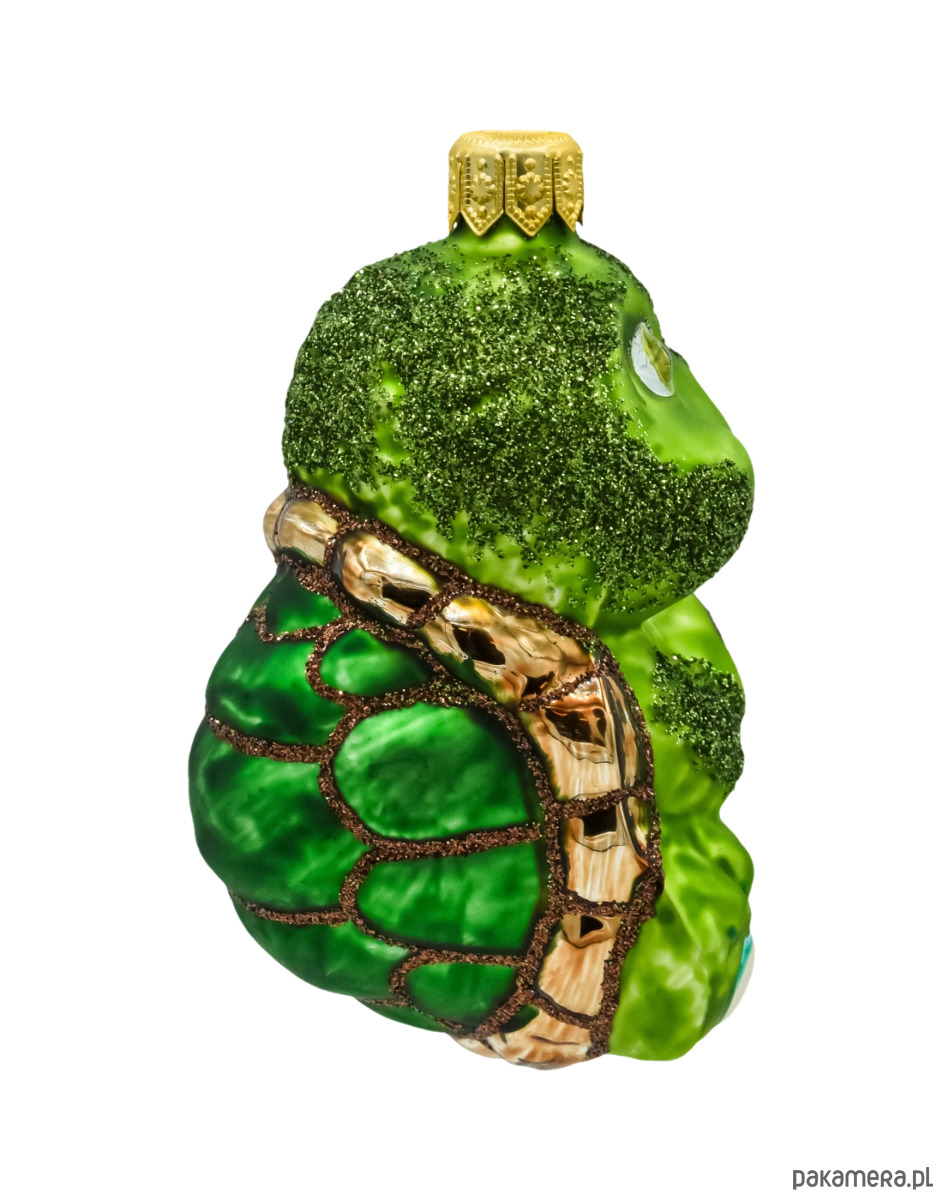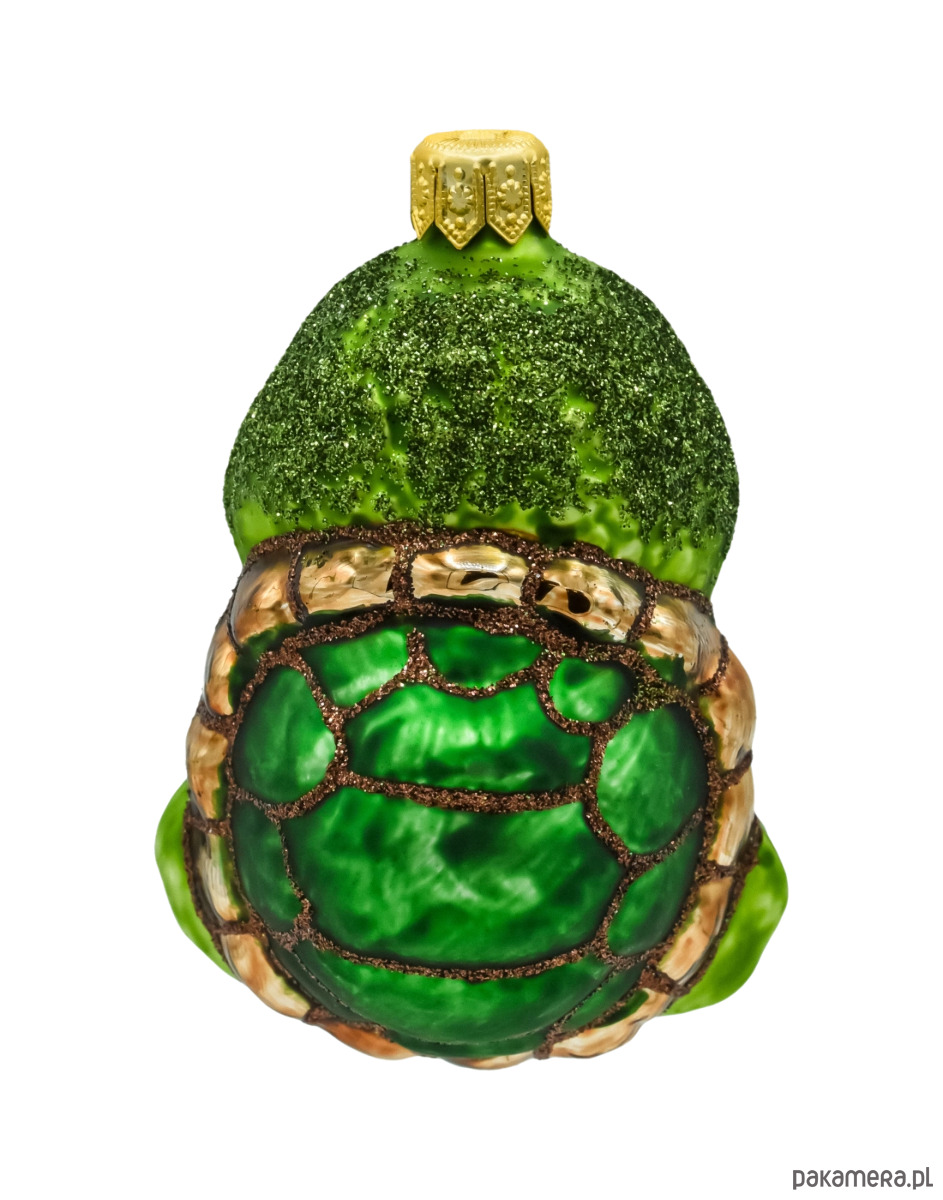 Główka i łapki żółwia pokryte są delikatną warstwą zielonego brokatu, który subtelnie mieni się w świetle, nadając całej bombce magicznego charakteru. Tył ozdoby przedstawia szczegółowo zdobiony pancerz z efektem trójwymiarowym, co czyni bombkę atrakcyjną z każdej strony.