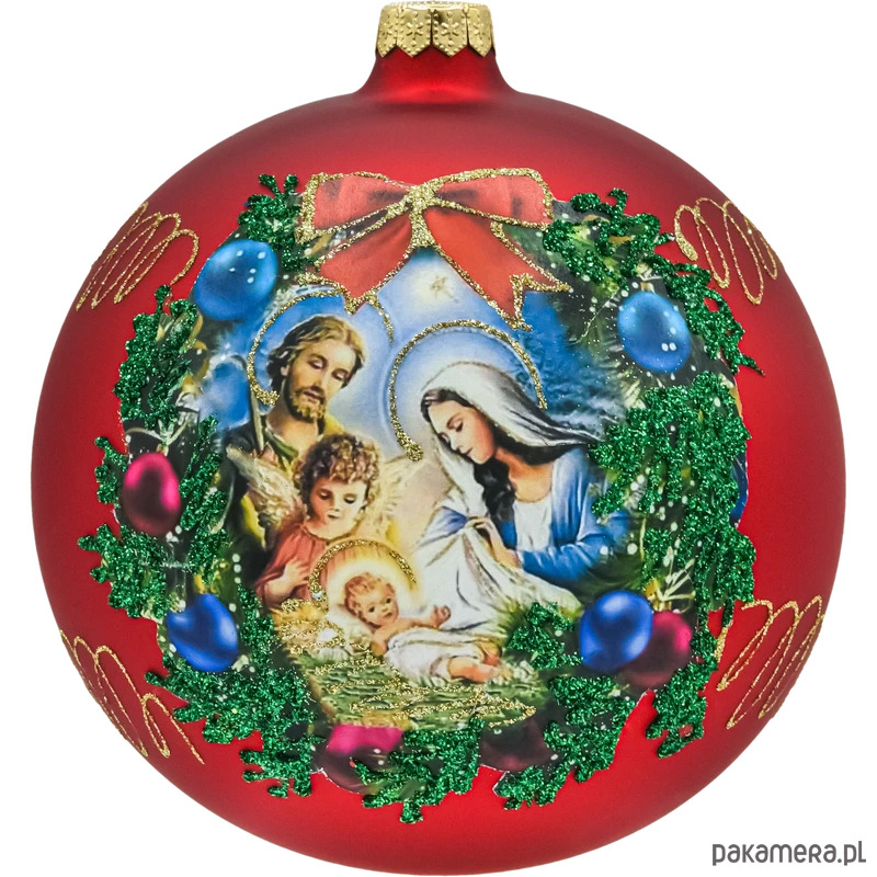 Elegancka szklana bombka choinkowa 15 cm – Święta Rodzina to klasyka polskiego rzemiosła w świątecznym wydaniu. Duża, matowo-czerwona kula zdobiona jest sceną Bożego Narodzenia (Święta Rodzina w szopce), ujętą w wieniec z zielonych gałązek i kokardę. Złote kontury, drobinki brokatu oraz delikatne akcenty perłowe pięknie łapią światło lampek, tworząc efekt „żywego” obrazu. To centralny, reprezentacyjny akcent wystroju – idealny na wyeksponowanie na froncie choinki, w stroiku lub na stojaku.