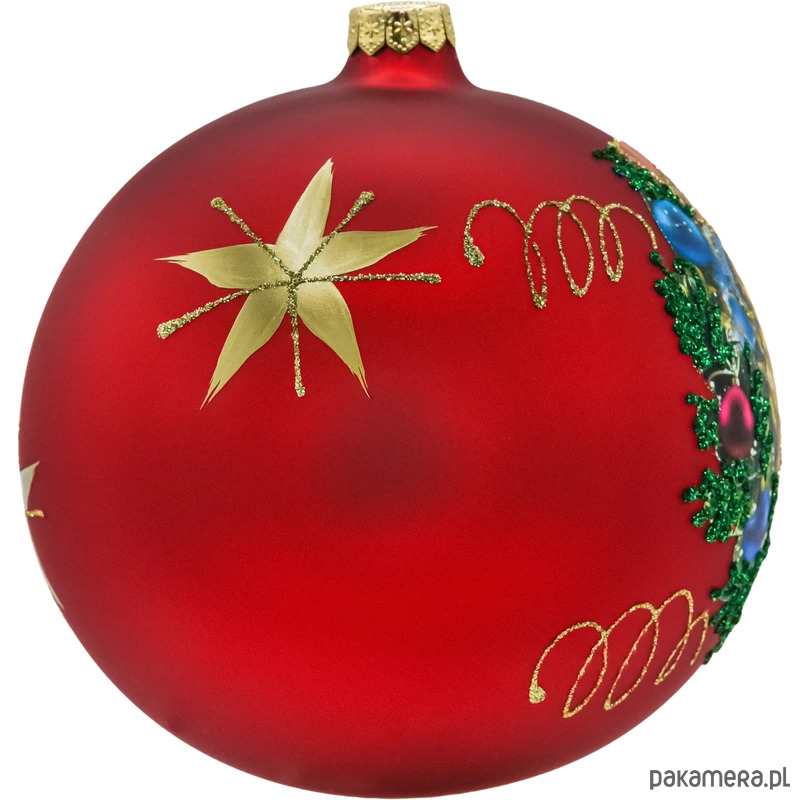 Wykończenie: matowa czerwień, złote ornamenty, zielony wieniec, mieniący się brokat; aplikacja artystyczna z trwałym nadrukiem i ręcznym domalowaniem detali.