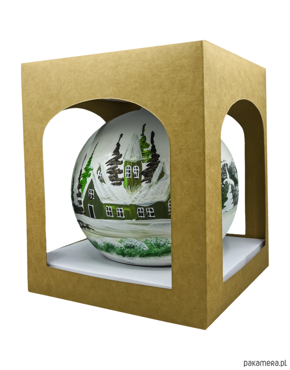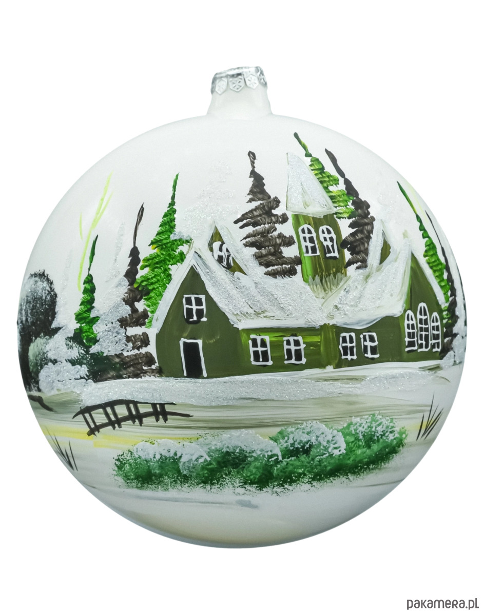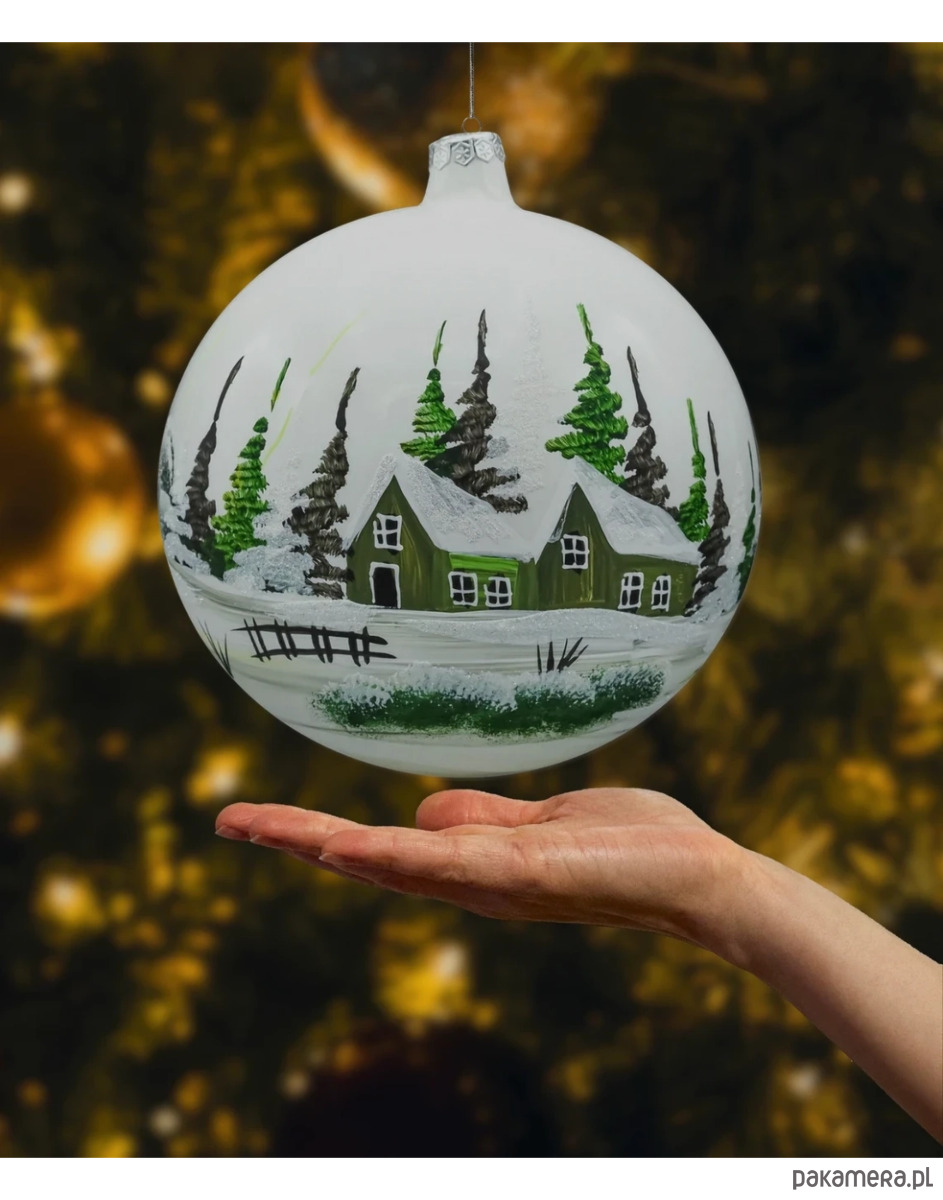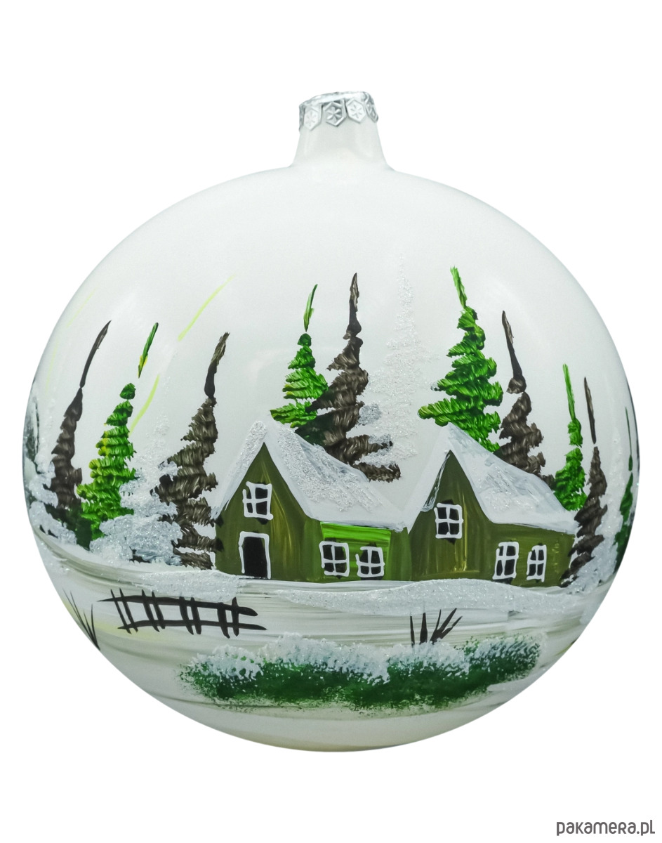 Elegancka, ręcznie malowana bombka szklana przedstawiająca zimowy pejzaż z leśnymi choinkami i zielonymi domkami pod śniegiem. Biała, perłowa kula pięknie odbija światło lampek, a śnieg i lód podkreślono iskrzącym brokatem. To klasyczna, polska bombka choinkowa, która doda świątecznego blasku zarówno tradycyjnej, jak i nowoczesnej aranżacji.