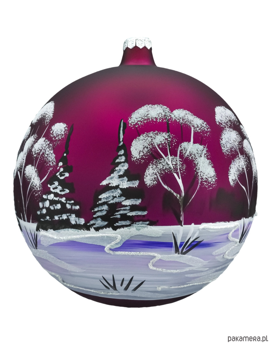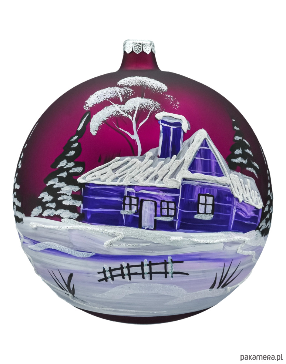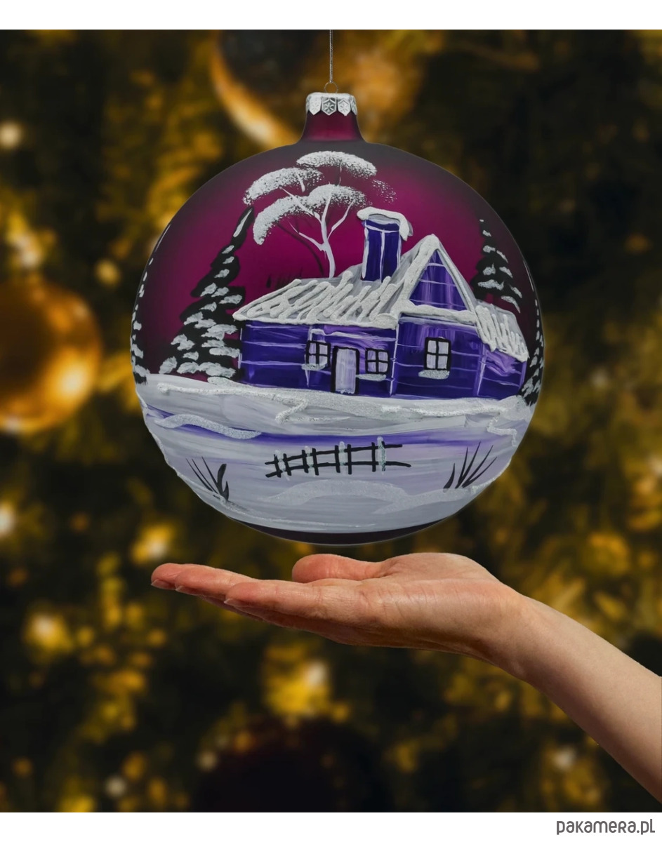 Elegancka, ręcznie malowana szklana bombka w kształcie kuli, utrzymana w głębokim odcieniu bordo/fioletu. Na matowo-satynowym tle artistka namalowała zimowy pejzaż: śnieżną chatkę, ośnieżone drzewa i lśniące drogi ze srebrnego brokatu. Subtelne przejścia kolorów i wypukłe akcenty nadają dekoracji przestrzenność i blask, dzięki czemu bombka pięknie mieni się w świetle lampek. To klasyczna, kolekcjonerska ozdoba bożonarodzeniowa, która doda szyku zarówno tradycyjnej, jak i nowoczesnej choince. W komplecie ochronno-prezentowe pudełko z okienkiem – idealne na podarunek i bezpieczne przechowywanie.