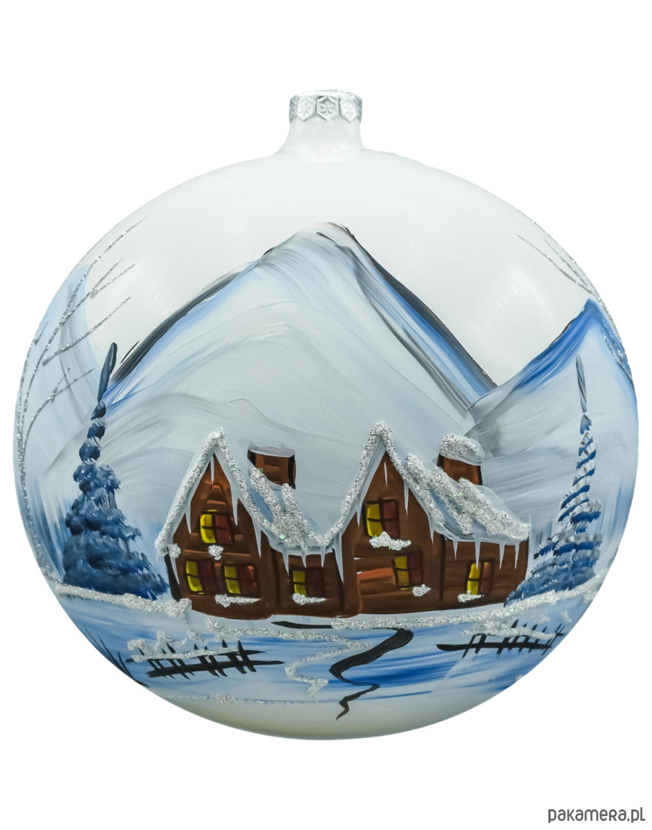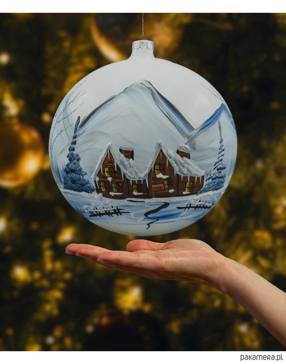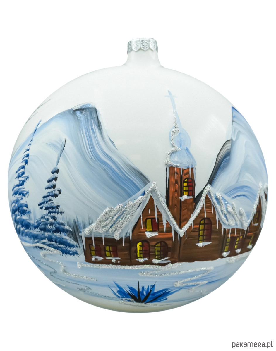 Ręcznie malowana szklana bombka choinkowa – biała kula z zimowym kościółkiem to klasyka świątecznego rękodzieła. Na lśniącej, perłowo-białej powierzchni powstał nastrojowy pejzaż zimowy: drewniany kościół z wieżyczką, spadzistymi dachami i migoczącymi oknami, otoczony ośnieżonymi górami i świerkami. Detale podkreślono brokatem i reliefową farbą, dzięki czemu bombka pięknie odbija światło lampek i dodaje choince elegancji. To dekoracja, która łączy tradycję z ponadczasowym stylem – idealna do klasycznych, skandynawskich i glamour aranżacji.