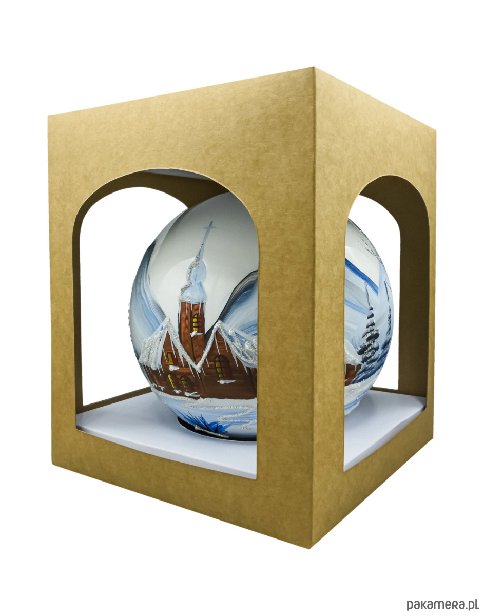 Słowa kluczowe SEO: bombka szklana kula, ręcznie malowana bombka, ozdoba choinkowa z kościołem, zimowy pejzaż, biała bombka na choinkę, bombki świąteczne szkło dmuchane, elegancka bombka w pudełku, tradycyjna dekoracja bożonarodzeniowa.
