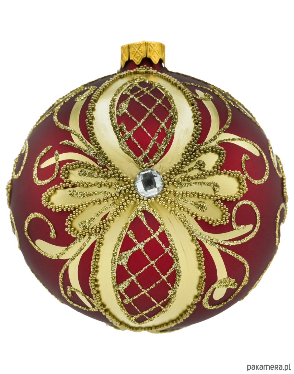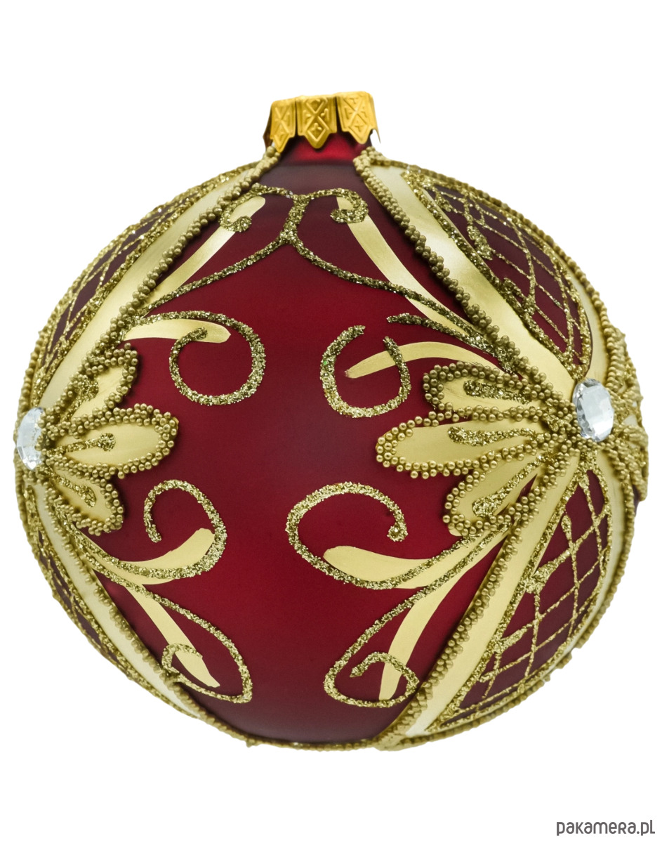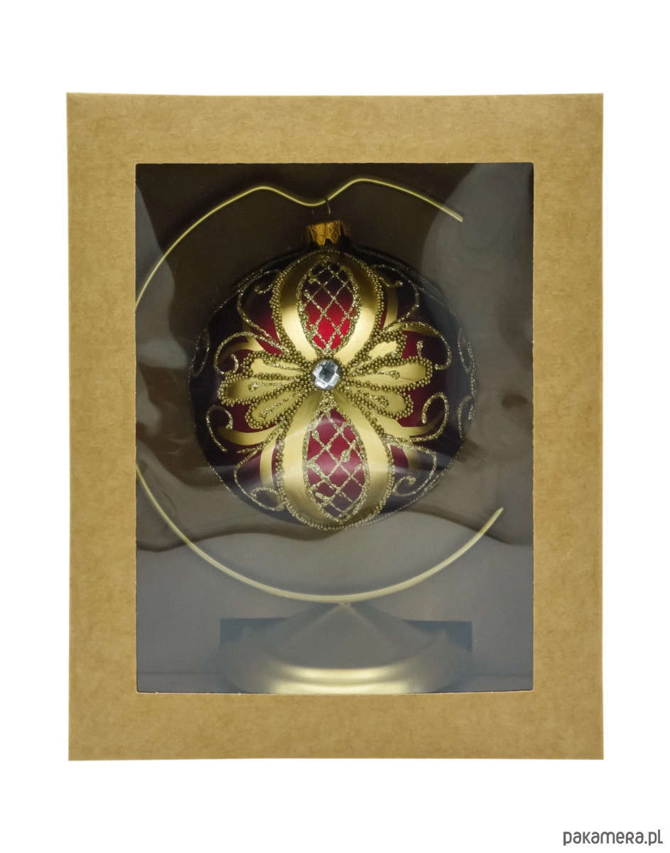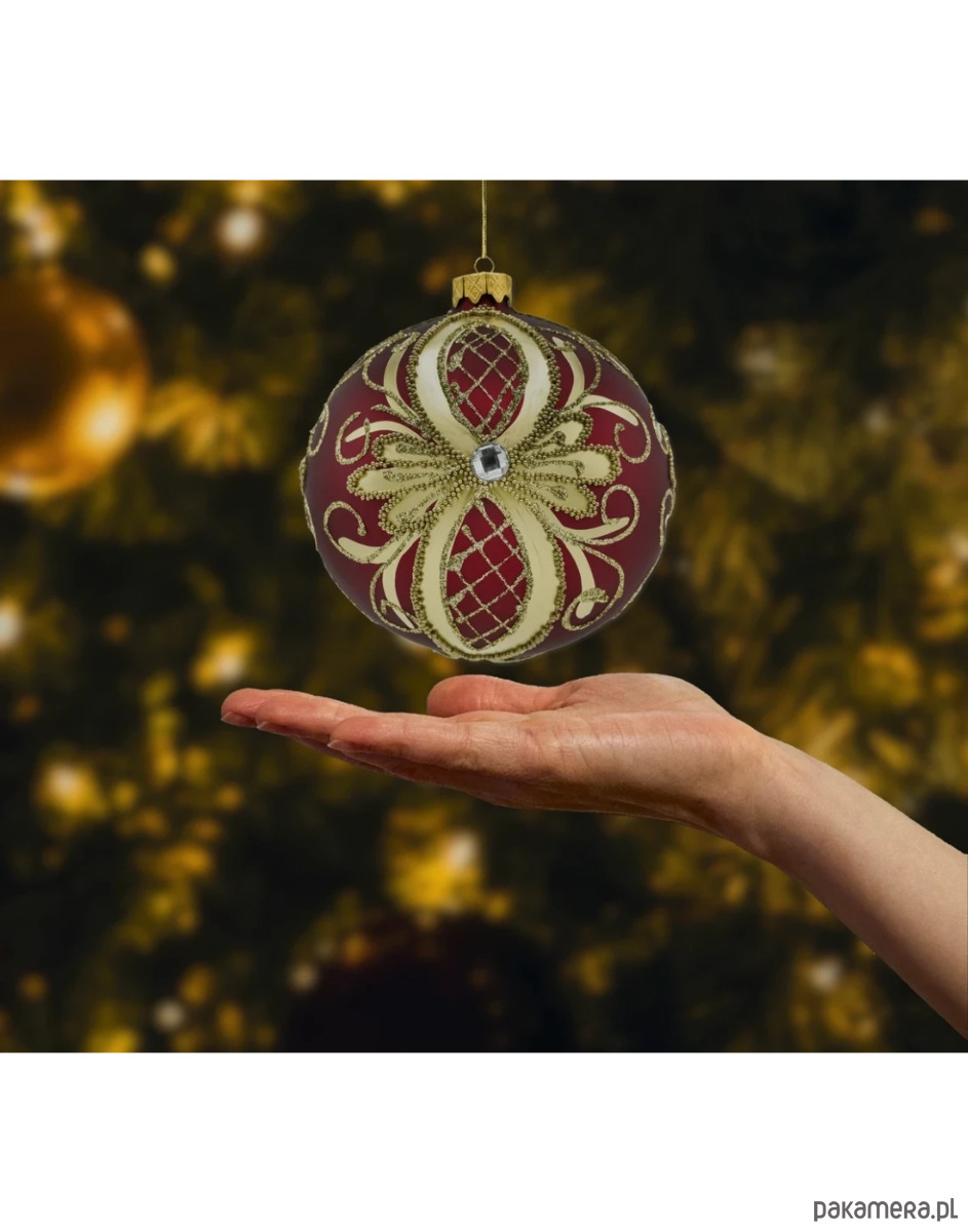 Wytworna bombka choinkowa z polskiego szkła, ręcznie dmuchana, malowana i bogato zdobiona reliefem w kolorze złota. Głęboki, satynowy odcień czerwieni zestawiono z misterną siatką złotych ornamentów, mikrokulkami 3D oraz połyskującym kryształkiem pośrodku rozet. Dzięki dołączonemu metalowemu stojakowi (kolor złoty) bombka pięknie zaprezentuje się nie tylko na choince, ale też na komodzie, w witrynie czy na świątecznym stole. To eleganckie rękodzieło klasy premium – idealny prezent świąteczny i kolekcjonerska ozdoba choinkowa w stylu glamour.