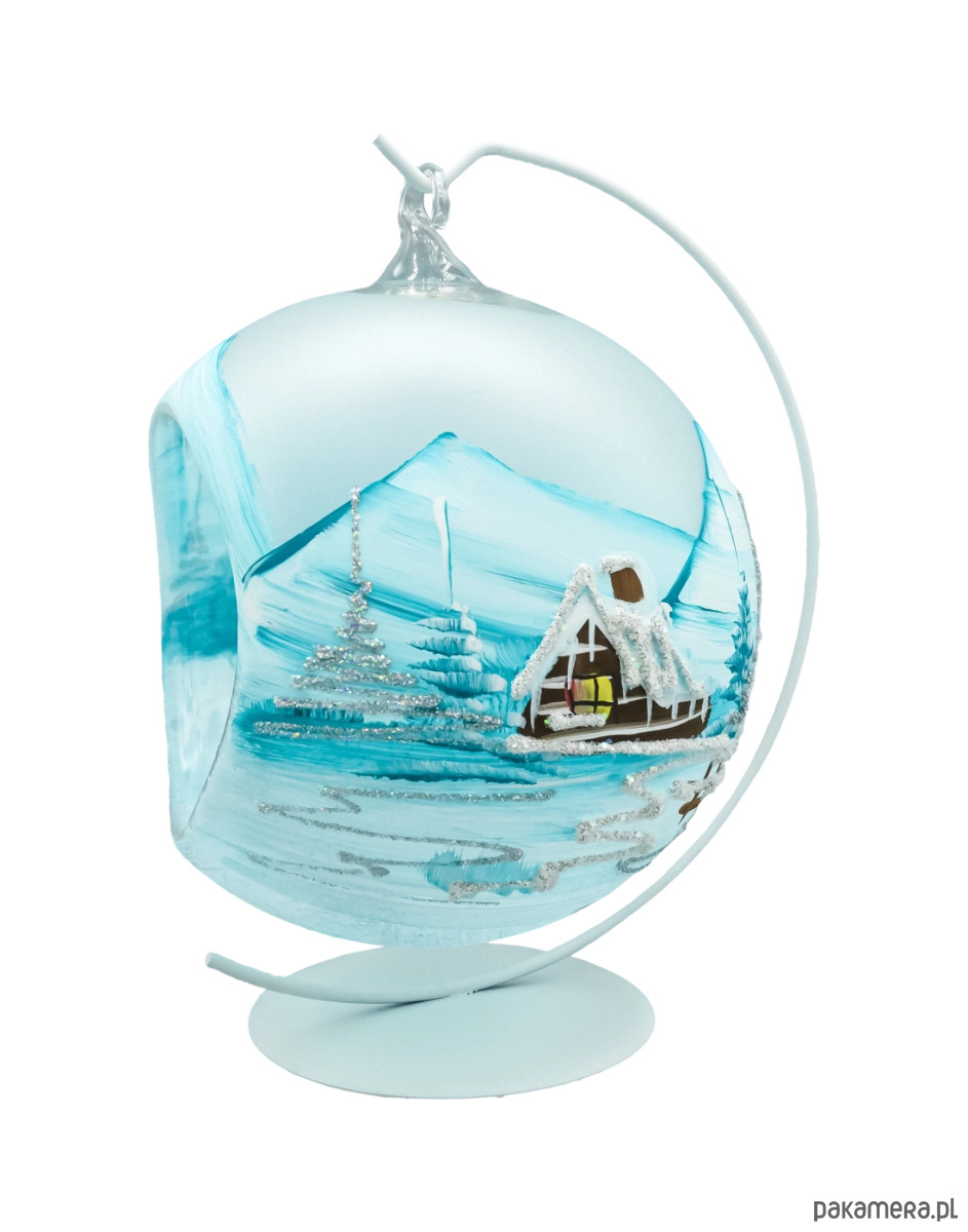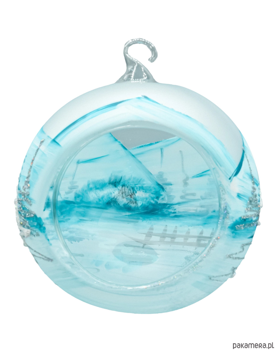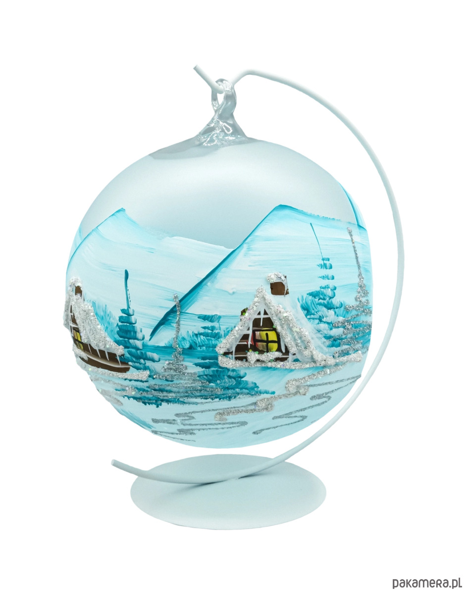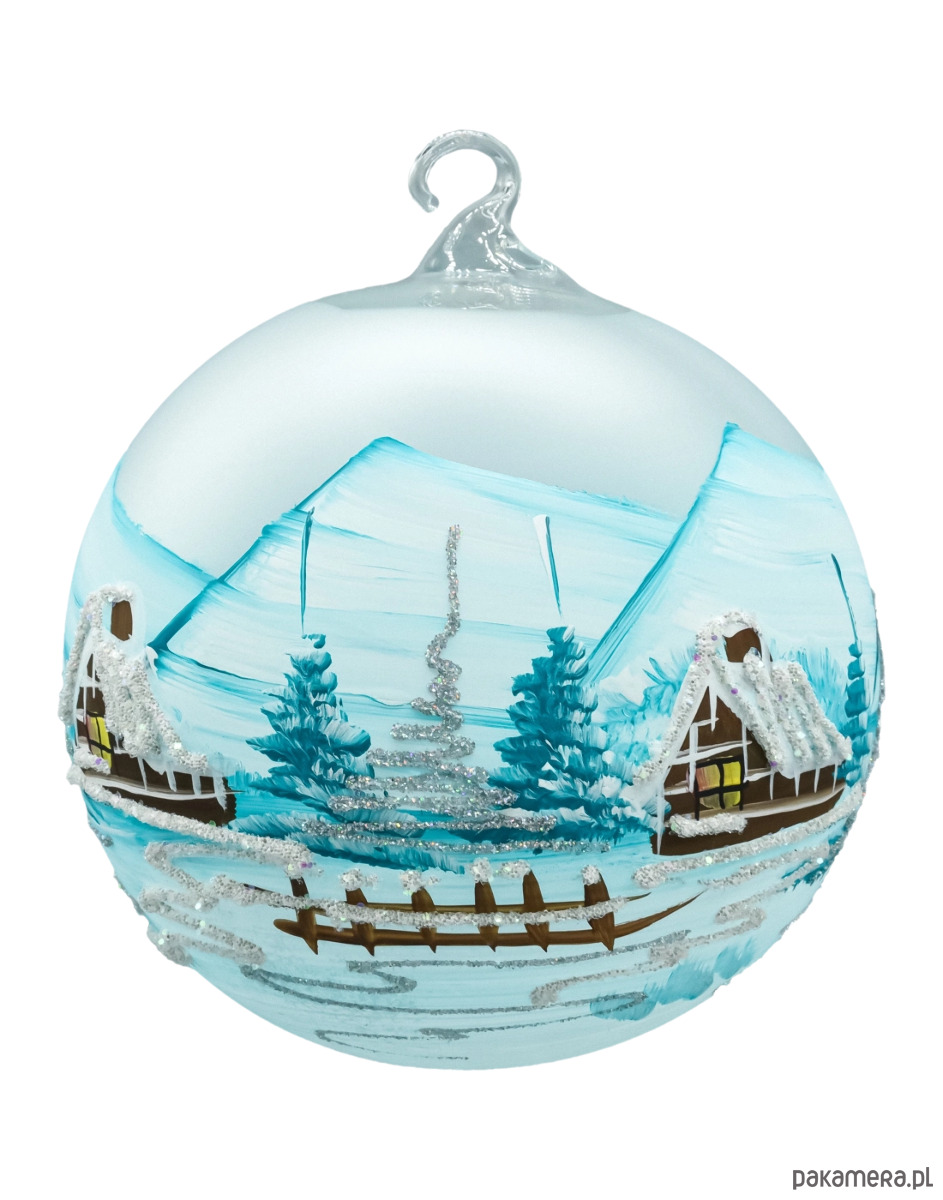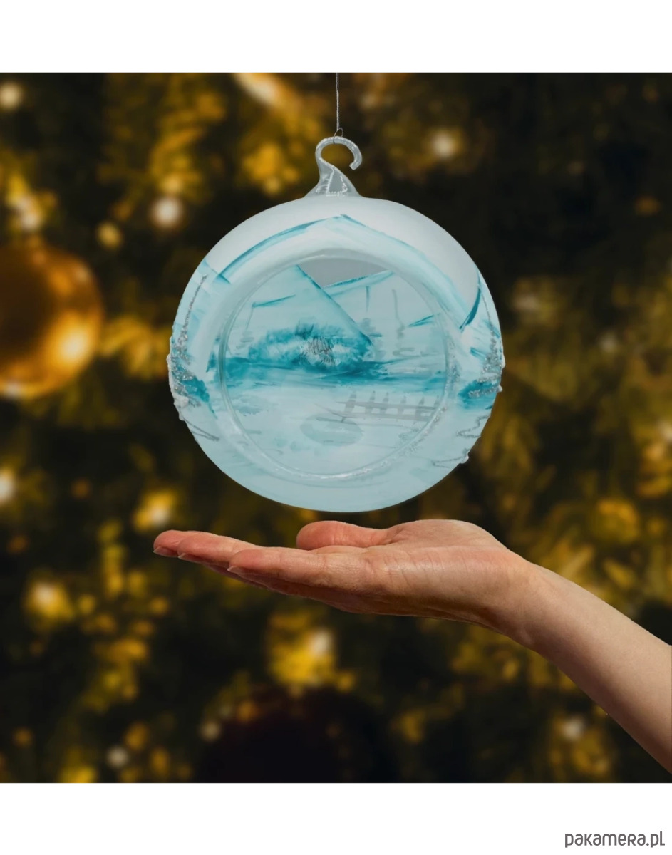 Matowo-błękitne tło z białymi pociągnięciami pędzla i drobnym srebrnym brokatem daje efekt mroźnego pejzażu, a ciepłe kolory w oknach domków wprowadzają przytulny, bożonarodzeniowy klimat. Każda sztuka jest unikatem – malowana ręcznie przez dekoratora, dlatego niewielkie różnice w detalu świadczą o jej rzemieślniczym pochodzeniu. To ponadczasowa bombka szklana 15 cm do domu, hotelu czy restauracji, idealna do kolekcji i na prezent świąteczny.