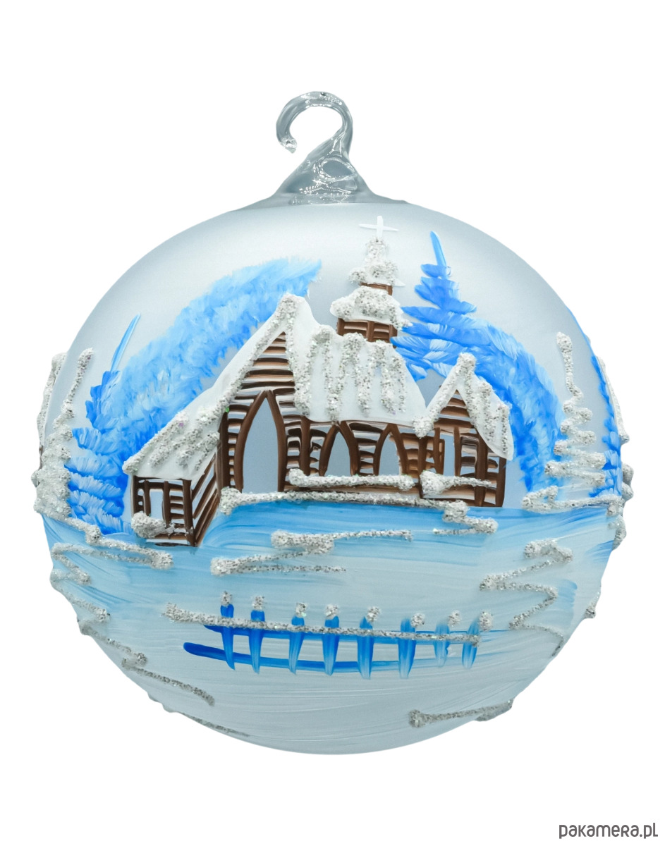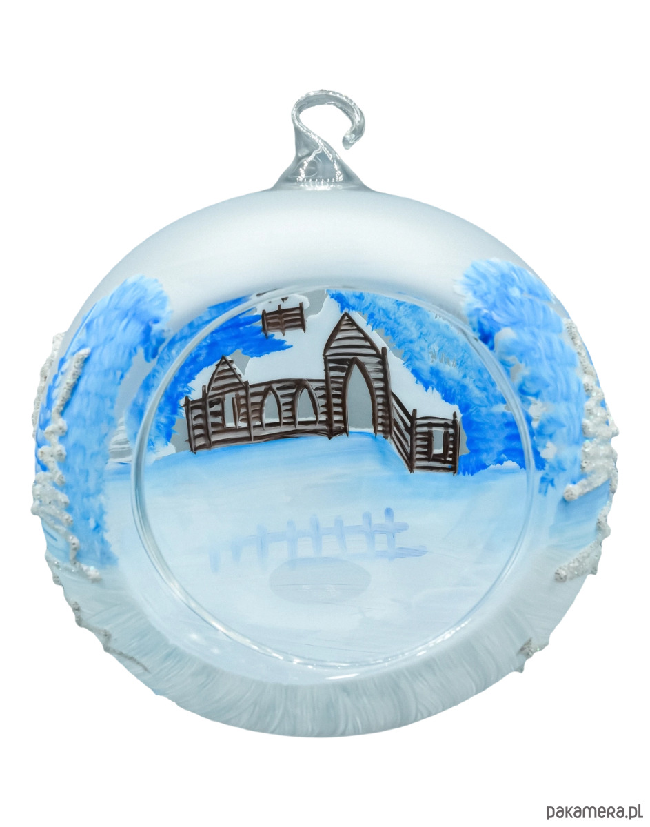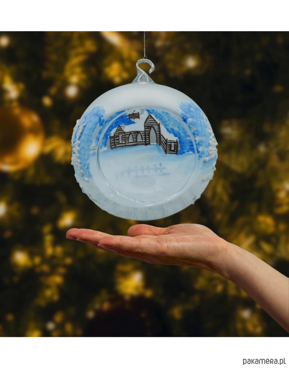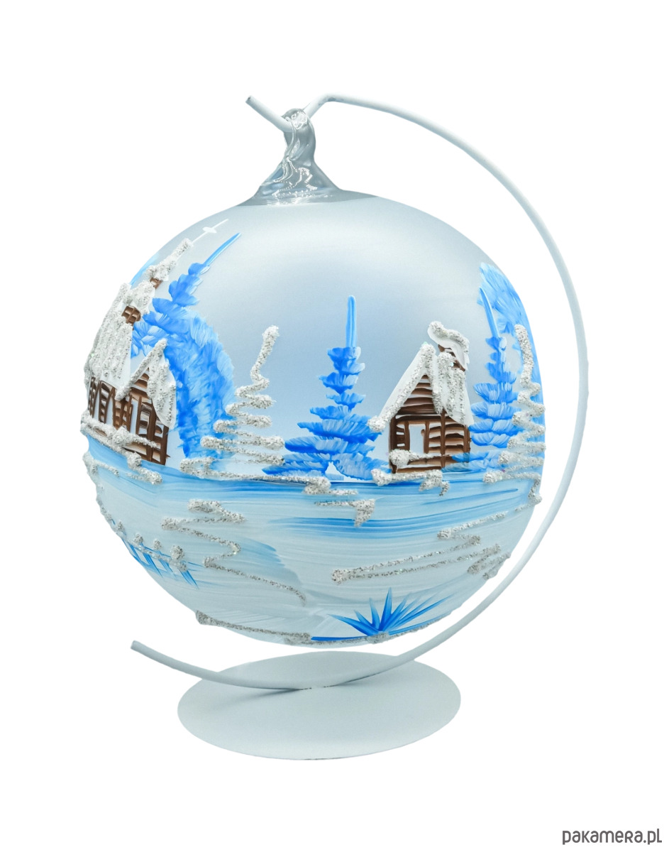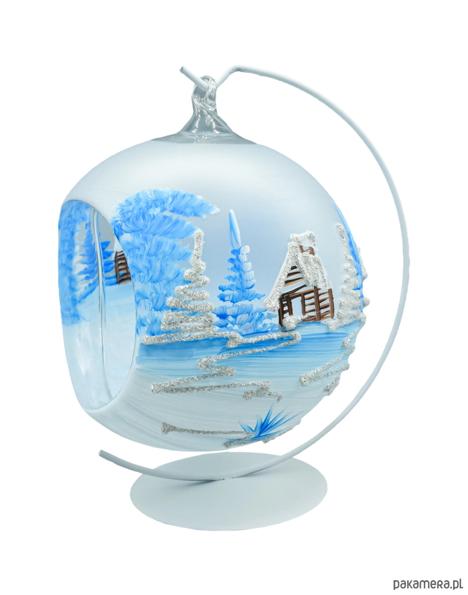 Wytworna szklana bombka–lampion o średnicy 12 cm z dużym, dekoracyjnym wycięciem, które tworzy efekt maleńkiej sceny teatralnej. Na matowym, lekko opalizującym tle ręcznie namalowano zimowy pejzaż: drewniane chatki przy ośnieżonych świerkach, miękkie smugi śniegu oraz połyskujące akcenty brokatu. Dzięki półtransparentnemu szkłu światło świeczki (najlepiej LED) pięknie „tańczy” wewnątrz, podkreślając pociągnięcia pędzla i strukturę śniegu. W komplecie otrzymujesz stabilny, metalowy stojak lakierowany na biało – gotowy zestaw do postawienia na stole, komodzie czy parapecie.