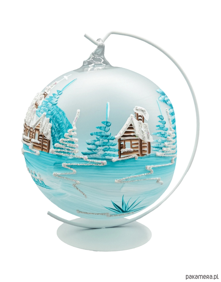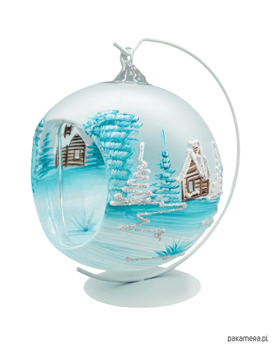 Ręcznie dmuchana bombka szklana – lampion o średnicy 15 cm w chłodnej palecie lodowego błękitu. Na kuli namalowano nastrojową scenę zimowej wioski z drewnianymi chatkami i świerkami, oprószoną srebrnym brokatem. Szerokie okno lampionu pozwala zajrzeć do środka i dodać światełko. W komplecie stabilny, biały metalowy stojak – dekoracja jest gotowa do ekspozycji od razu po rozpakowaniu. Z tealightem LED zamienia się w przytulny, zimowy lampion idealny na stół, komodę lub parapet.