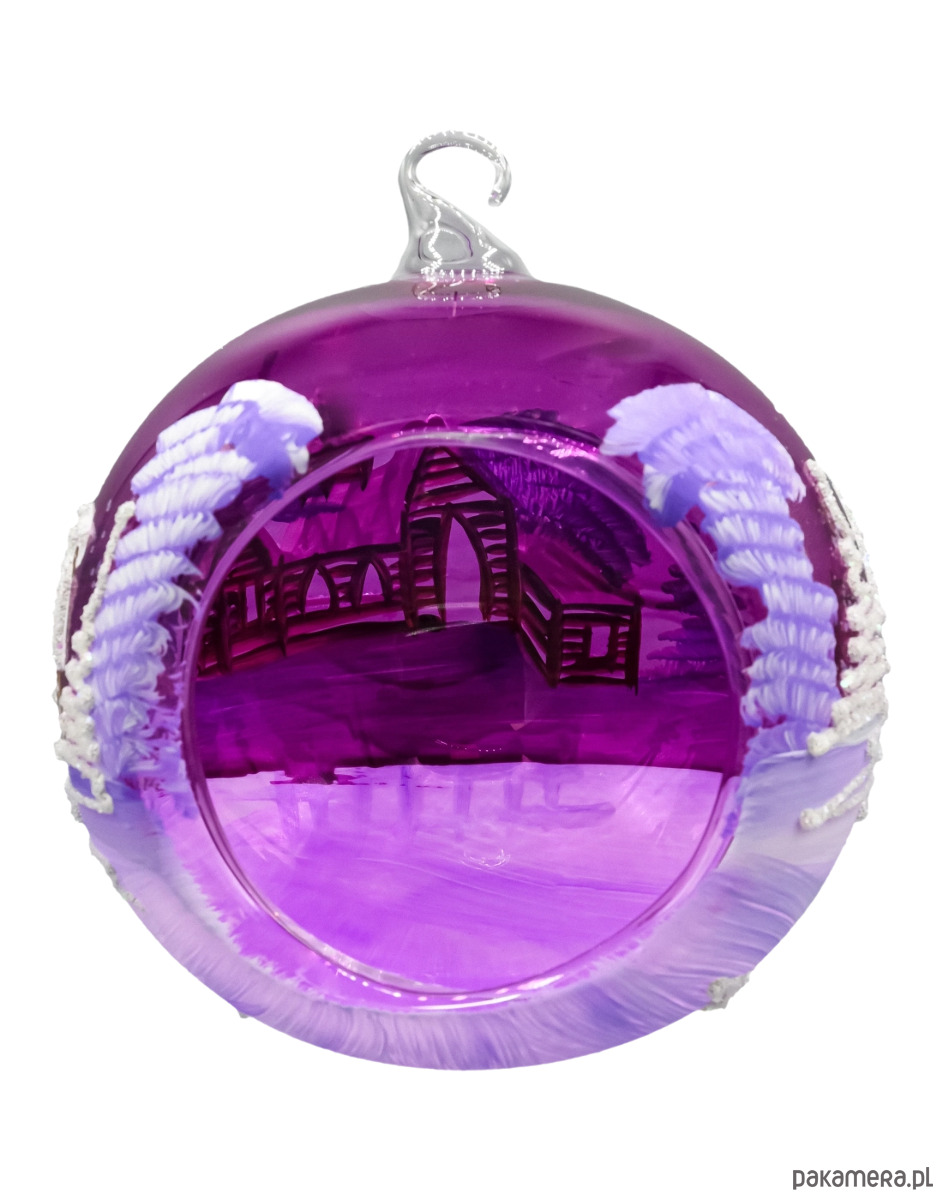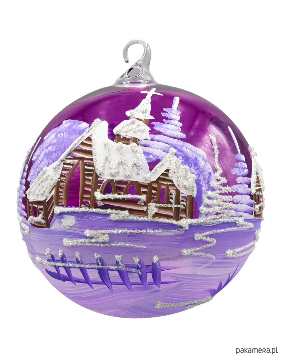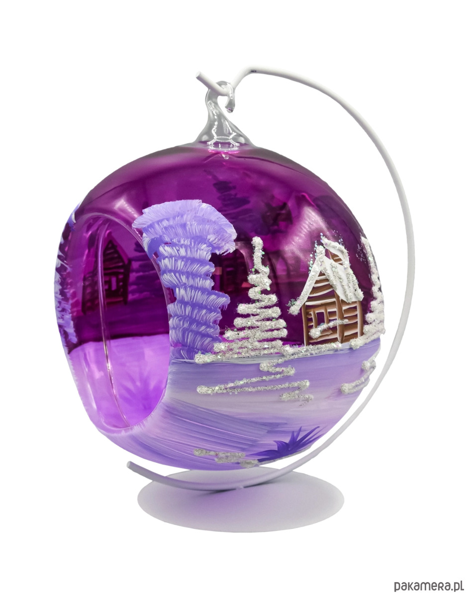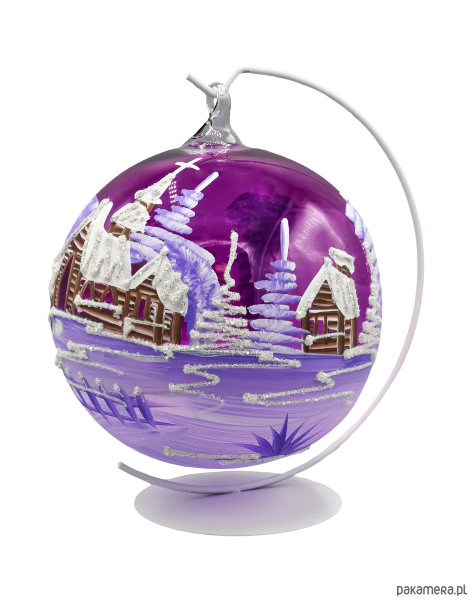 Ręcznie dmuchana bombka szklana – lampion o średnicy 15 cm w głębokim, ametystowo-fioletowym kolorze. Kula ma szerokie okno lampionu, przez które widać misternie malowaną scenę: drewniany kościółek, chatki, świerki i zaspy śniegu. Selektywnie położony srebrny brokat daje efekt skrzącego się puchu, a transparentny fiolet pięknie „łapie” światło. W komplecie otrzymujesz stabilny, biały metalowy stojak, dzięki czemu dekoracja od razu jest gotowa do ekspozycji. Wystarczy dodać tealight LED lub mikro-lampki, by uzyskać nastrojowy, zimowy lampion.