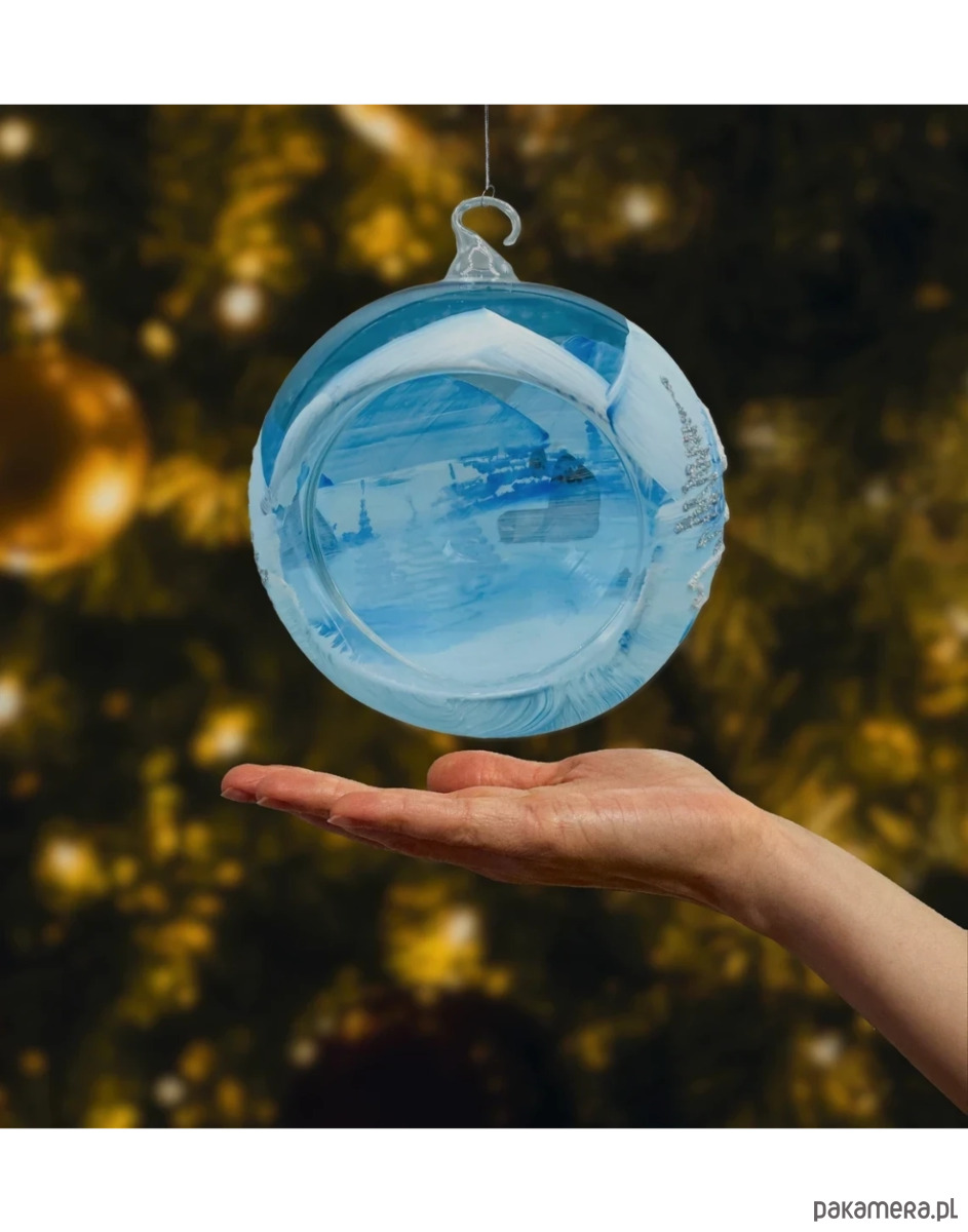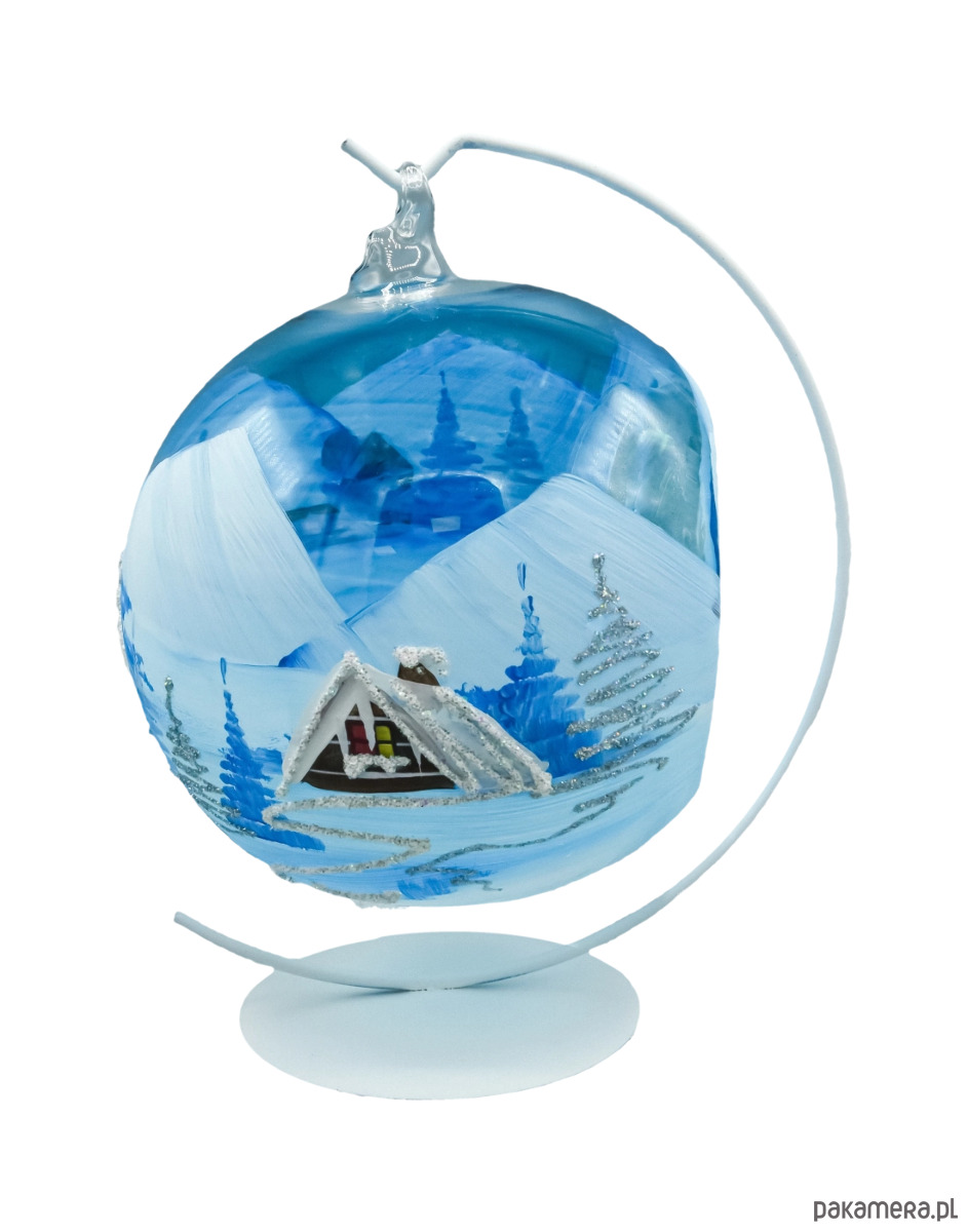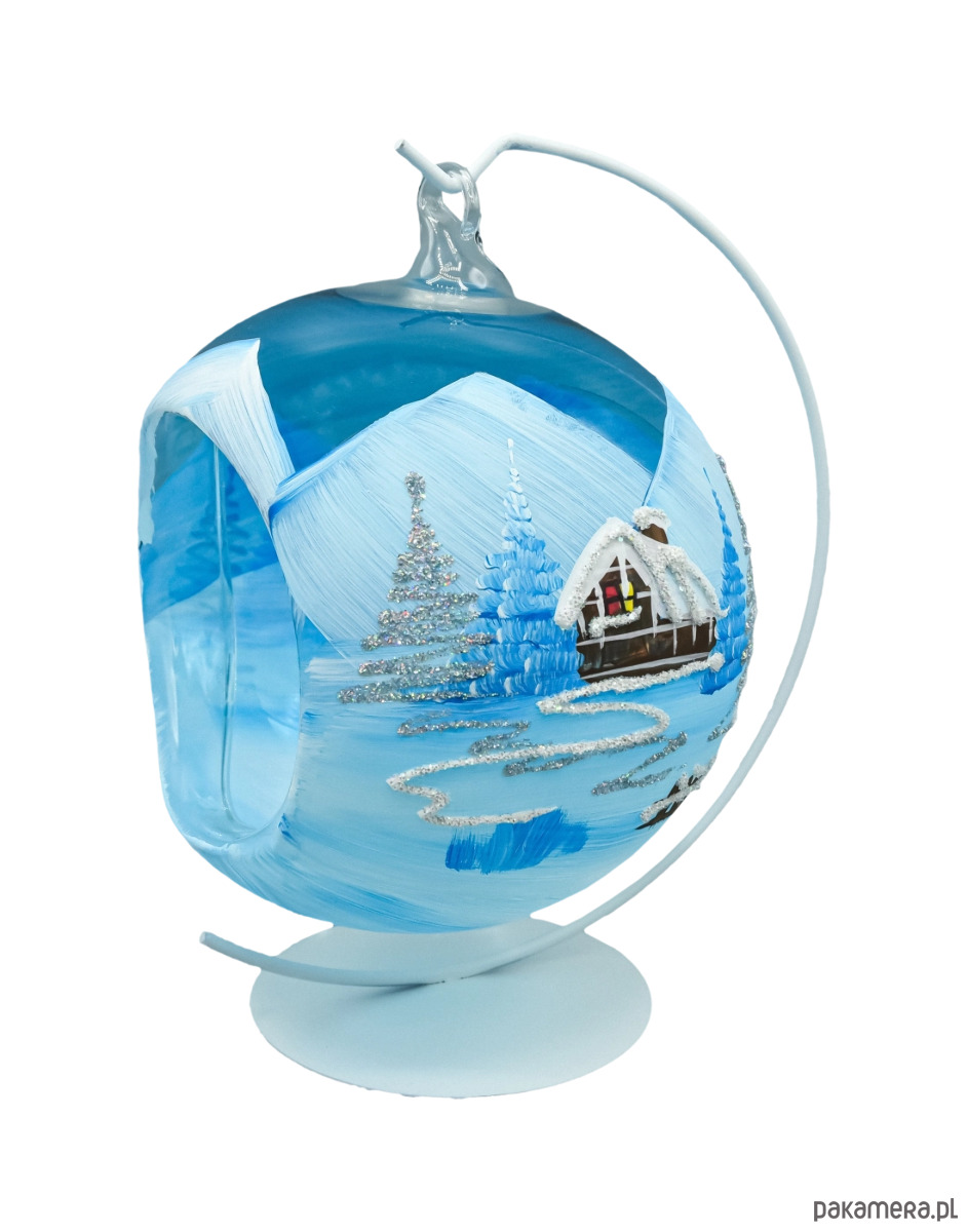 Szklana bombka–lampion ze scenką zimową w kolorach lodowego błękitu to wyjątkowa dekoracja świąteczna 2-w-1: ozdoba i nastrojowy świecznik. Kula z dużym, dekoracyjnym wycięciem tworzy efekt „okienka”, przez które widać ręcznie malowany pejzaż: górskie szczyty, ośnieżone choinki i przytulną chatkę, podkreślone połyskiem drobnego brokatu. Po umieszczeniu w środku świeczki typu tealight (najlepiej LED) malunek pięknie się rozświetla, rzucając miękkie refleksy i tworząc iście zimowy klimat. Lampion dostarczany jest w zestawie ze stojakiem, dzięki czemu od razu nadaje się do ekspozycji na stole, komodzie czy parapecie.