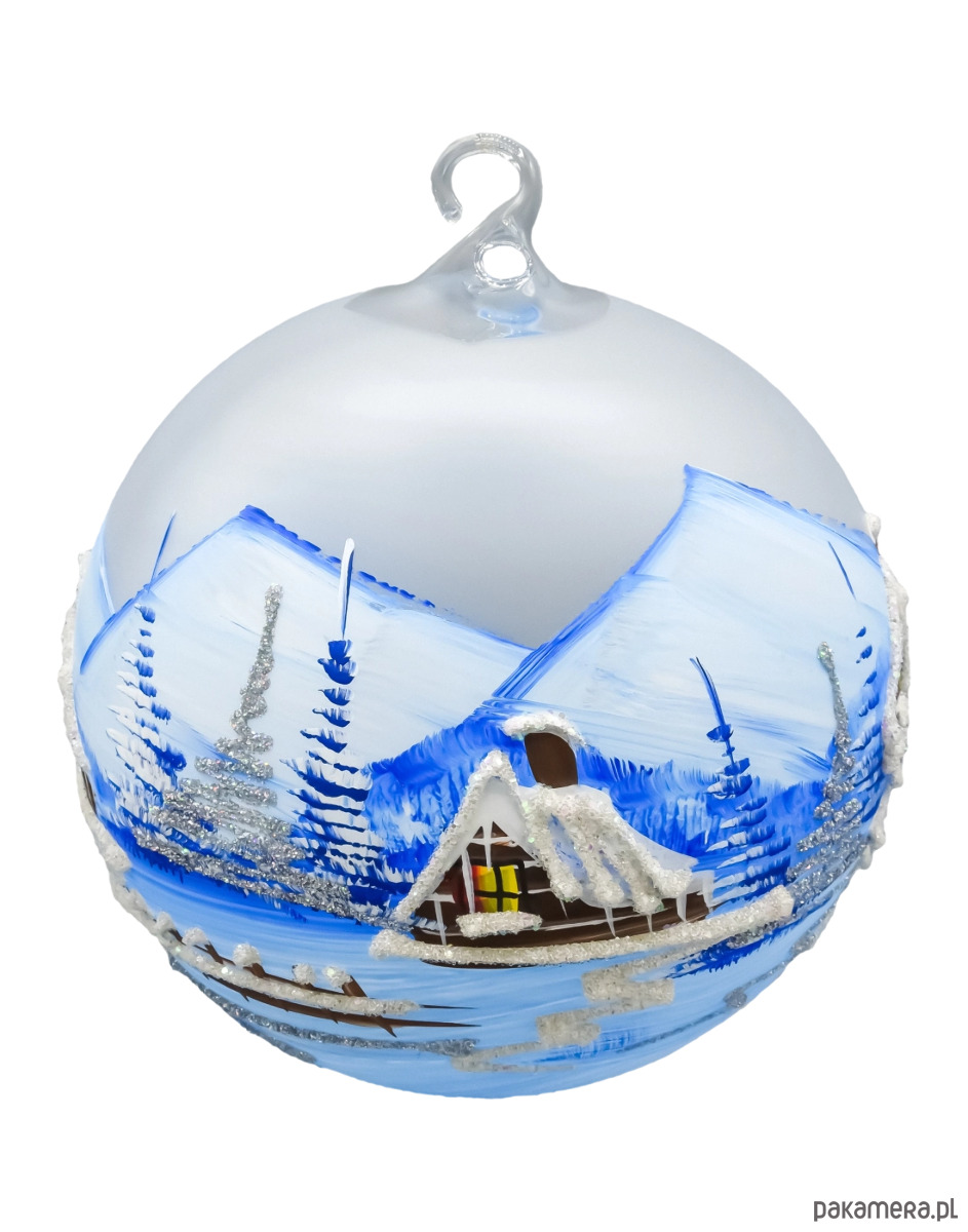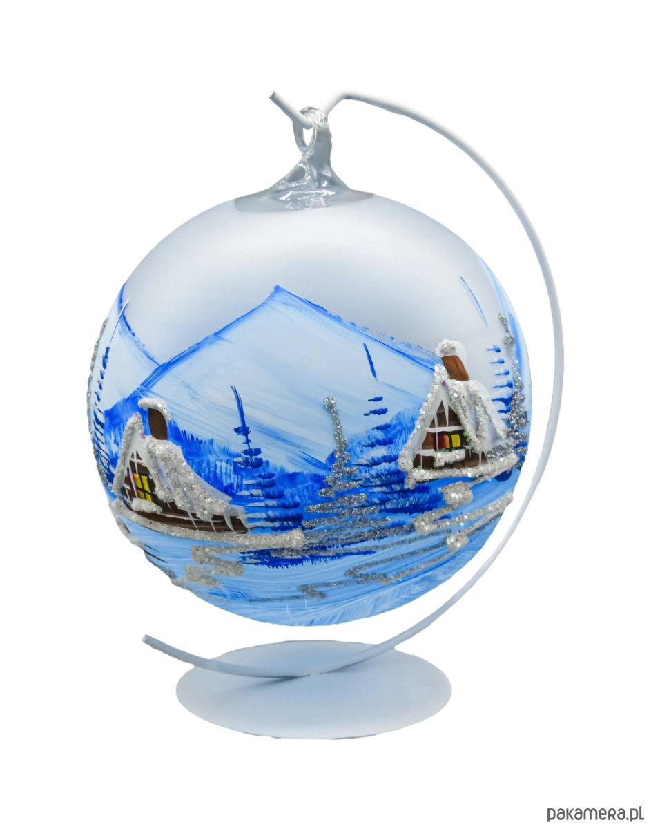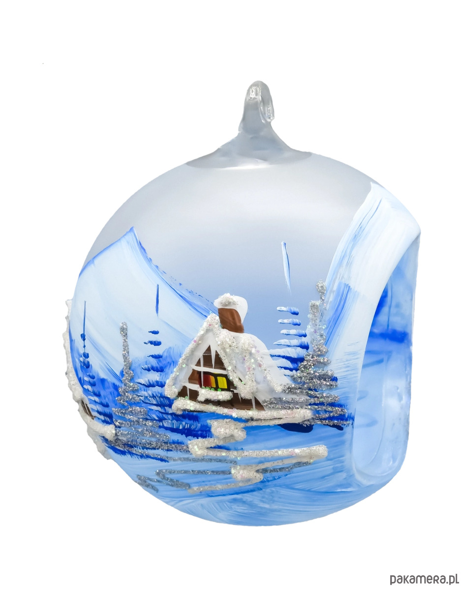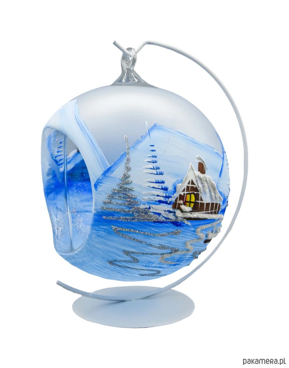 Wprowadź do swojego wnętrza wyjątkowy klimat zimowej baśni dzięki tej ręcznie malowanej bombce lampionowi ze szkła dmuchanego. Zewnętrzna powierzchnia bombki została ozdobiona subtelnym, mroźnym pejzażem z białymi szczytami gór i otulonymi śniegiem chatkami, ukrytymi pośród niebieskich drzew. Malarskie pociągnięcia pędzla i migoczące akcenty brokatu dodają scenie głębi i blasku.