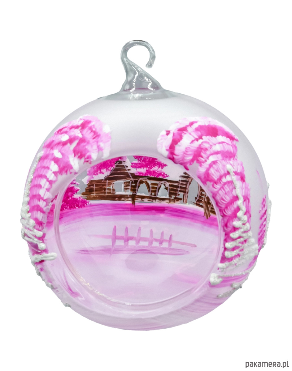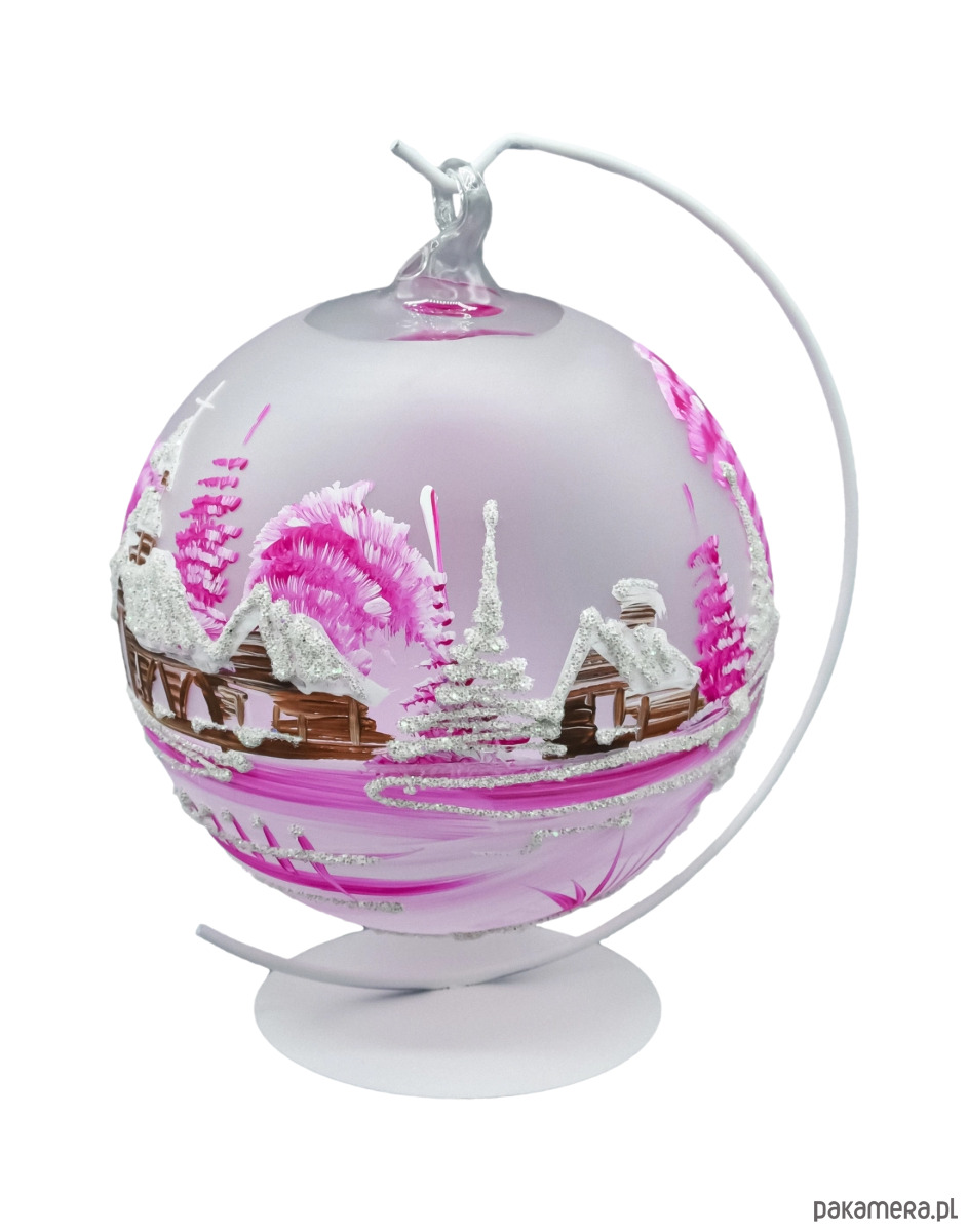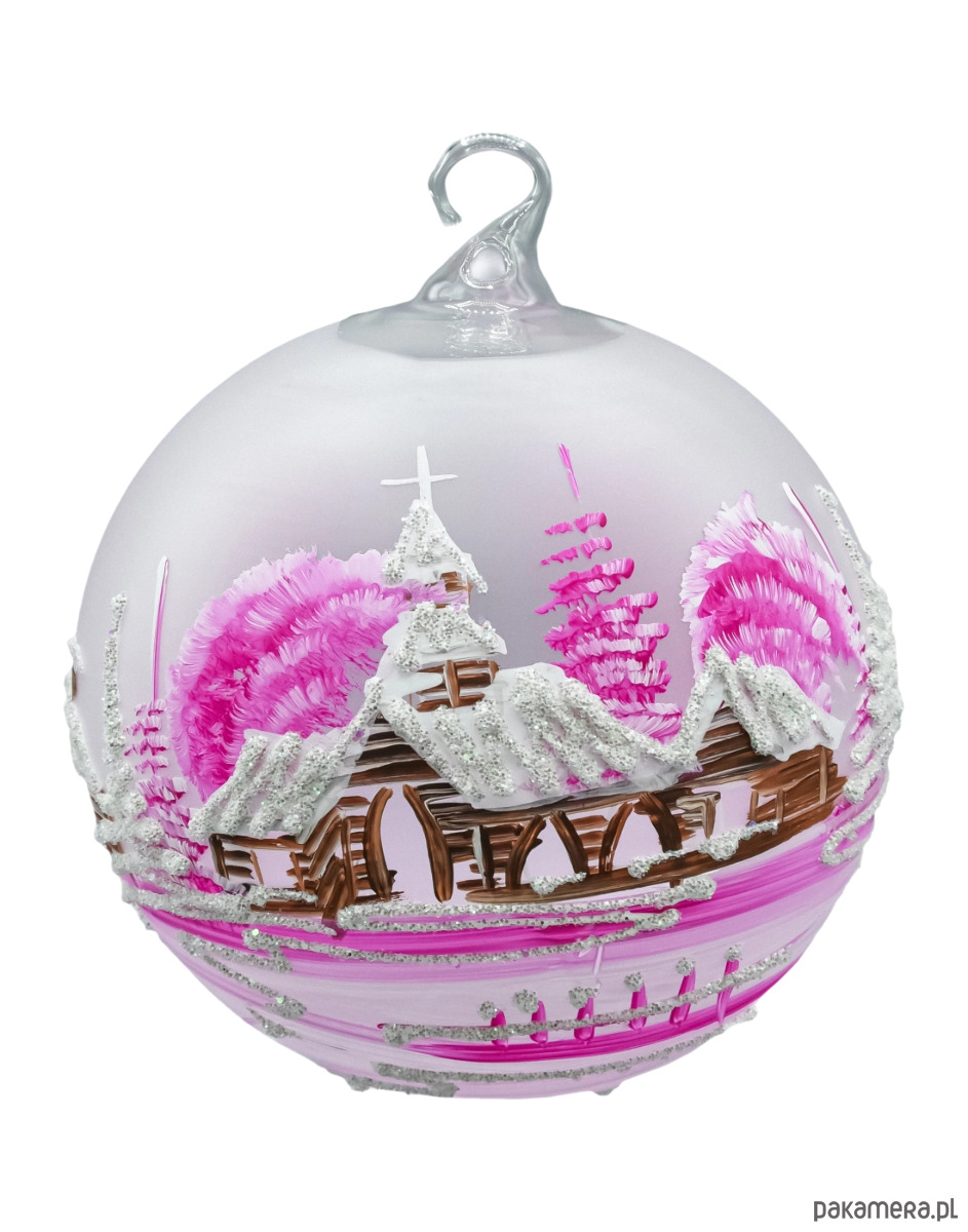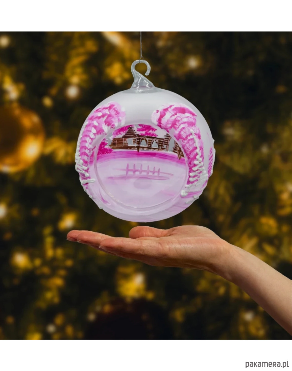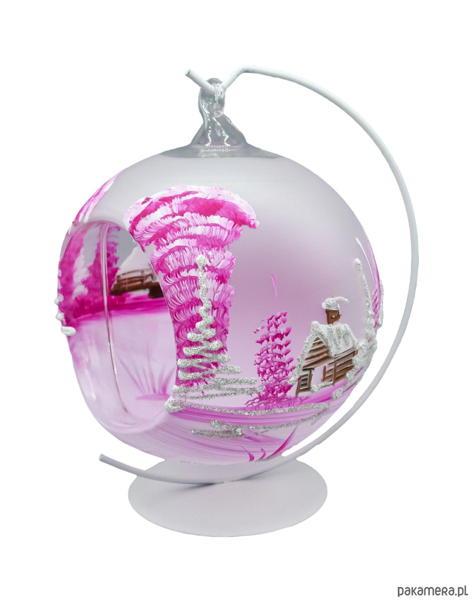 Ręcznie malowana szklana bombka–lampion z otworem na świeczkę to wyjątkowa dekoracja świąteczna łącząca klimat tradycyjnej bombki z nastrojem latarenki. Kula z matowego szkła w odcieniach bieli i pudrowego różu została ozdobiona pejzażem zimowym: drewniana chatka przykryta śniegiem, choinki i połyskujące brokatem zaspy tworzą bajkową scenerię. Duże, eleganckie „okienko” w ściance bombki pozwala wstawić świeczkę LED–tealight i podświetlić ręcznie malowany wzór od środka – światło pięknie załamuje się w szkle, podkreślając każdy pociągnięty pędzlem detal.