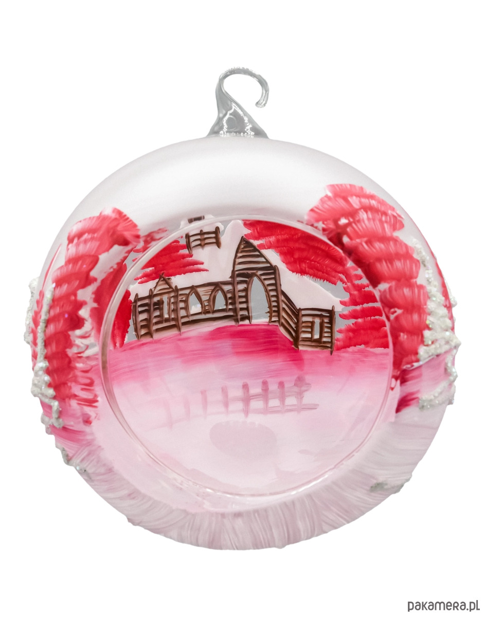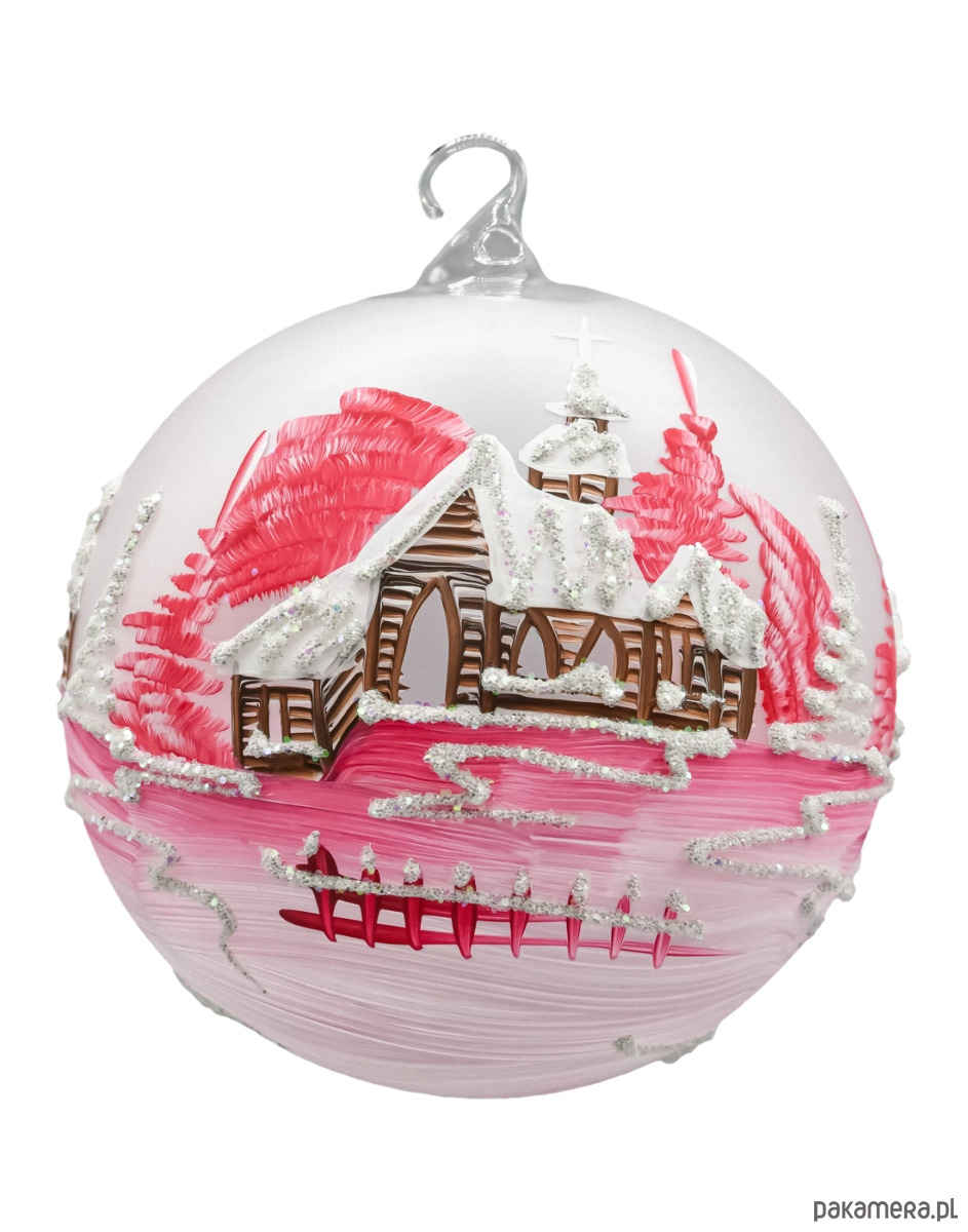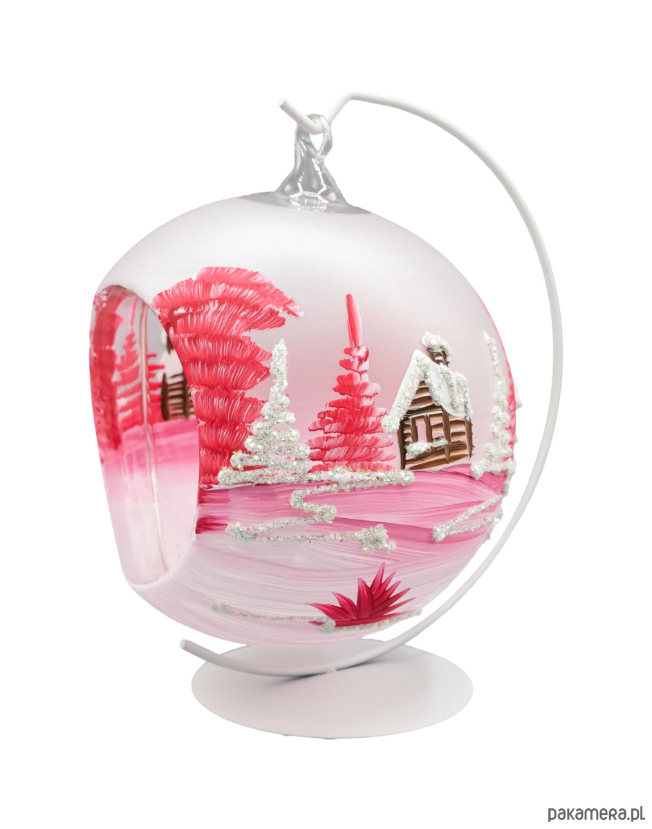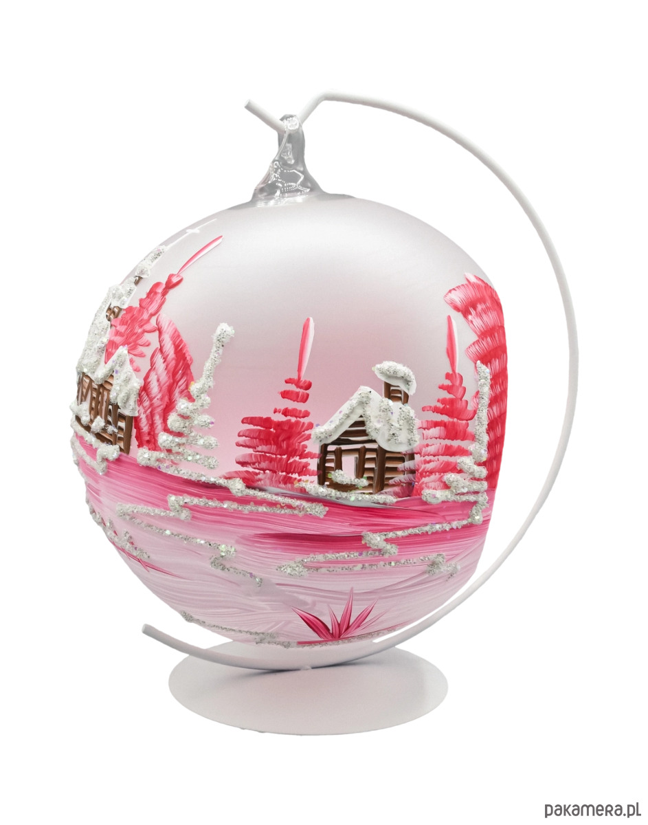 Ręcznie dmuchana bombka szklana – lampion o średnicy 15 cm w subtelnym, różowym odcieniu. Kula ma szerokie okno lampionu, przez które widać misternie malowaną scenę: drewniany kościółek, chatki i świerki otulone śniegiem. Selektywny srebrny brokat daje efekt skrzącego się puchu, a różowa paleta pięknie „łapie” ciepło światełek. W komplecie znajduje się stabilny, biały metalowy stojak, więc dekoracja jest gotowa do ekspozycji zaraz po rozpakowaniu. Dodaj tealight LED lub mikro-lampki, a lampion stworzy nastrojową, zimową iluminację – idealną ozdobę świąteczną na stół, komodę i parapet.