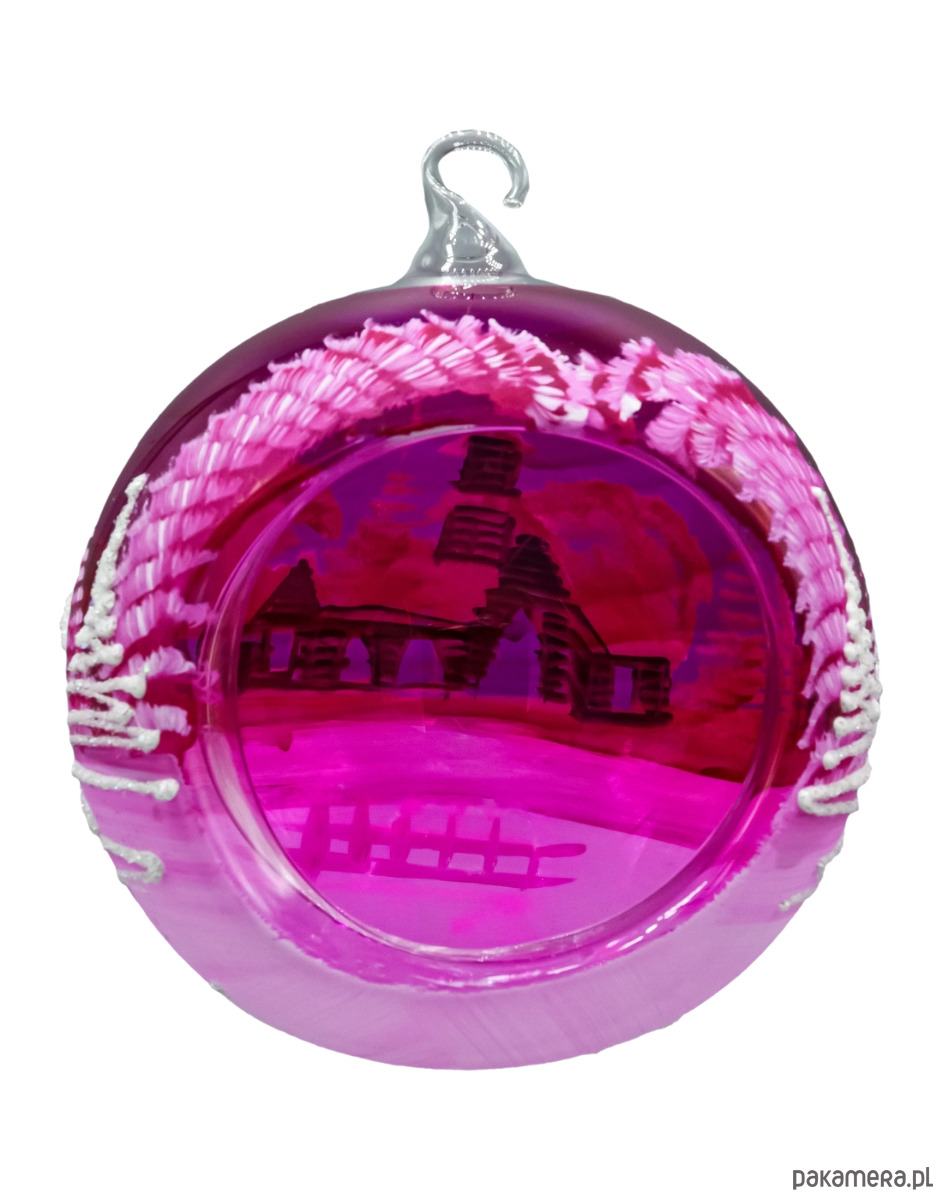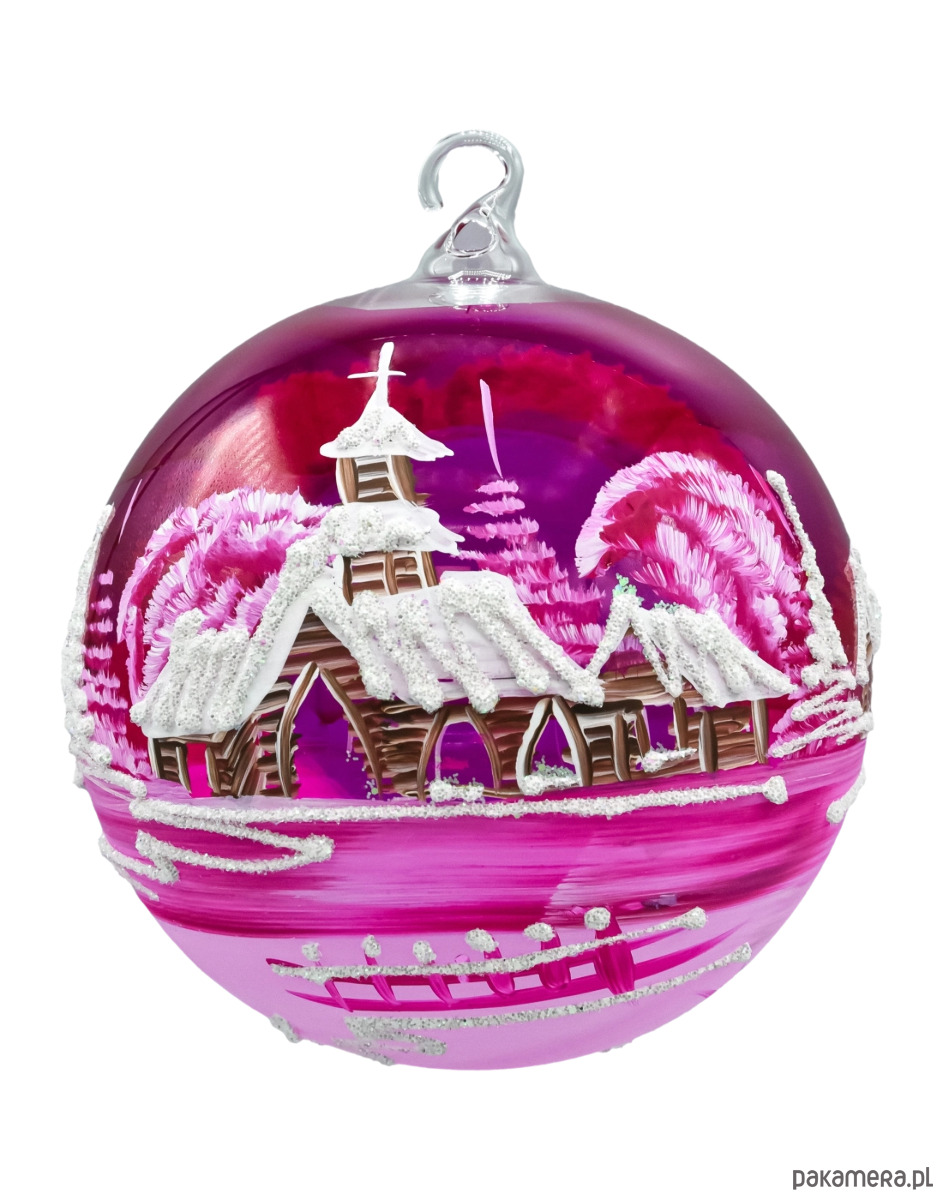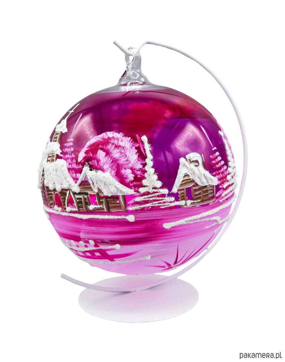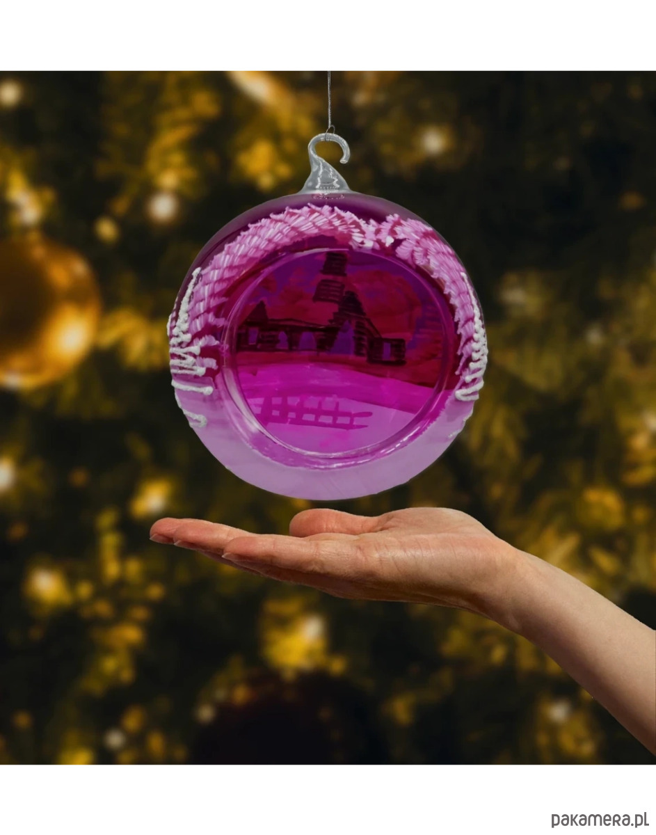 Wytworna szklana bombka-lampion 12 cm z dużym, wyciętym oknem i malowanym ręcznie zimowym pejzażem. Transparentne, malinowo-różowe szkło pięknie rozprasza światło, a brokatowy „śnieg” i biel choinek dodają blasku niczym w świątecznej kuli. W zestawie znajduje się stabilny stojak w kolorze białym, dzięki czemu ozdoba od razu jest gotowa do ekspozycji na stole, komodzie czy parapecie. To elegancka alternatywa dla klasycznych ozdób – bombka choinkowa lampion tworzy nastrojową iluminację, kiedy w środku umieścisz świeczkę typu tealight (najlepiej LED).