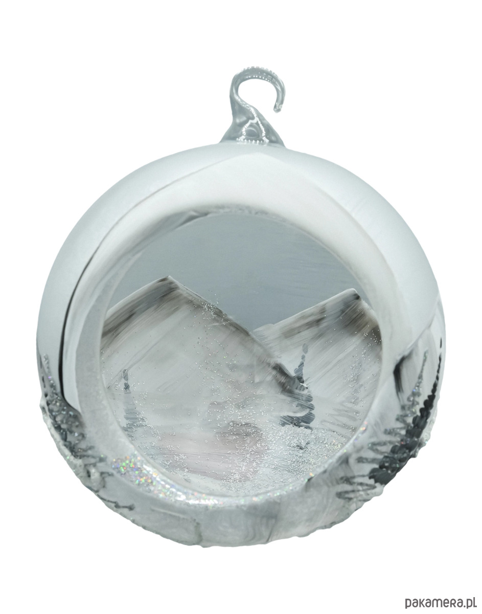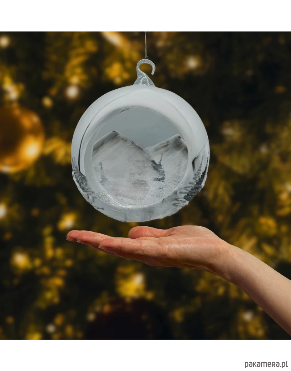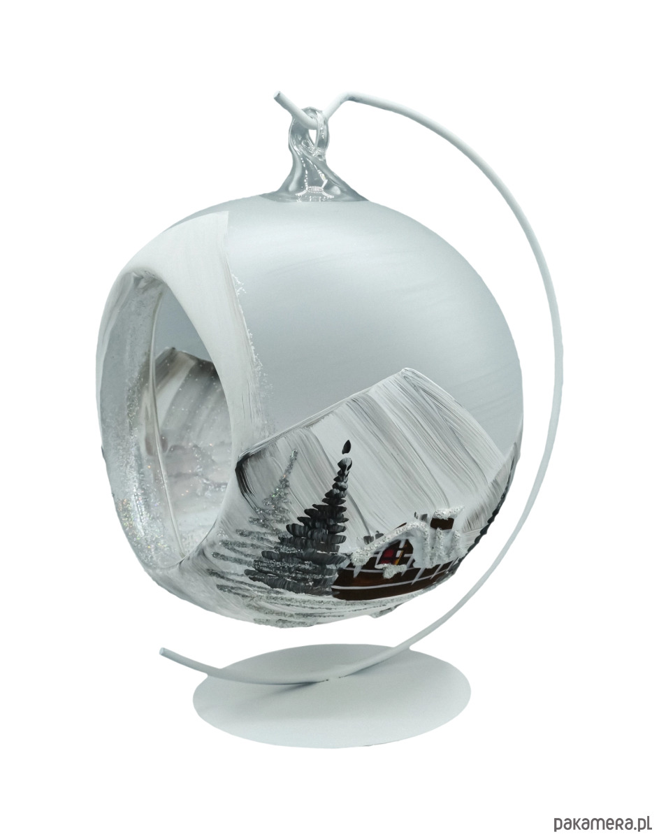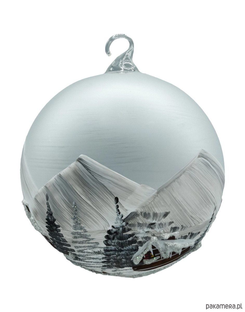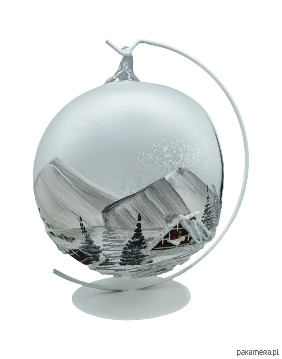 Wytworna bombka–lampion z wycięciem, które tworzy małą scenę zimowego krajobrazu. Na satynowo-białym szkle artyści ręcznie namalowali górskie tło, ośnieżone choinki i przytulną chatkę. Delikatne akcenty srebrnego brokatu imitują skrzący się śnieg, a miękkie, oliwkowo-zielone pociągnięcia pędzla nadają całości naturalny, leśny charakter. W komplecie jest elegancki, metalowy stojak lakierowany na biało – możesz postawić lampion na komodzie, stole lub parapecie i cieszyć się nastrojowym blaskiem świecy LED.