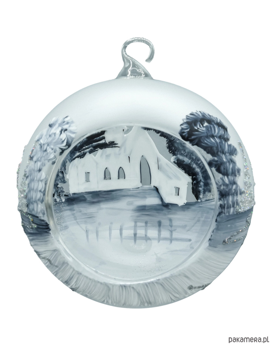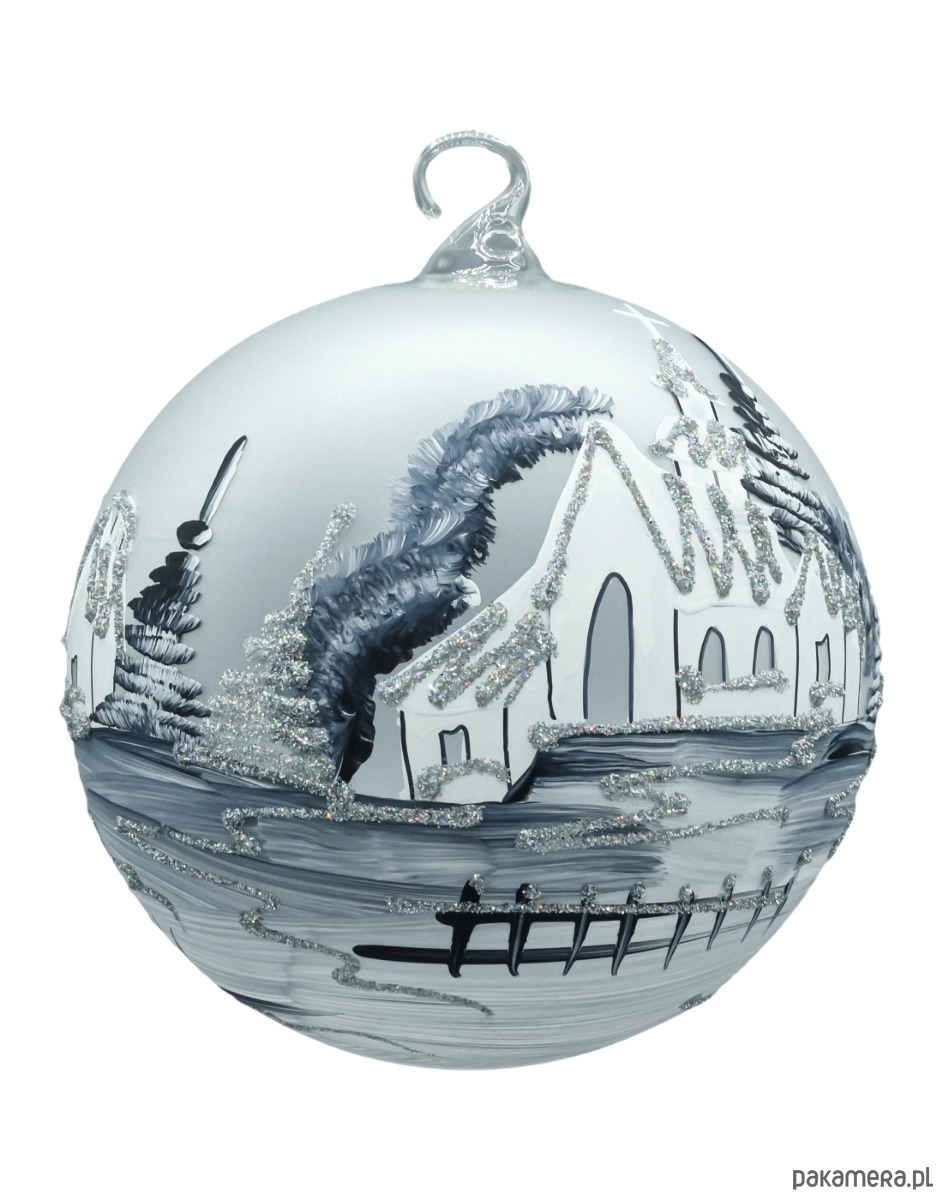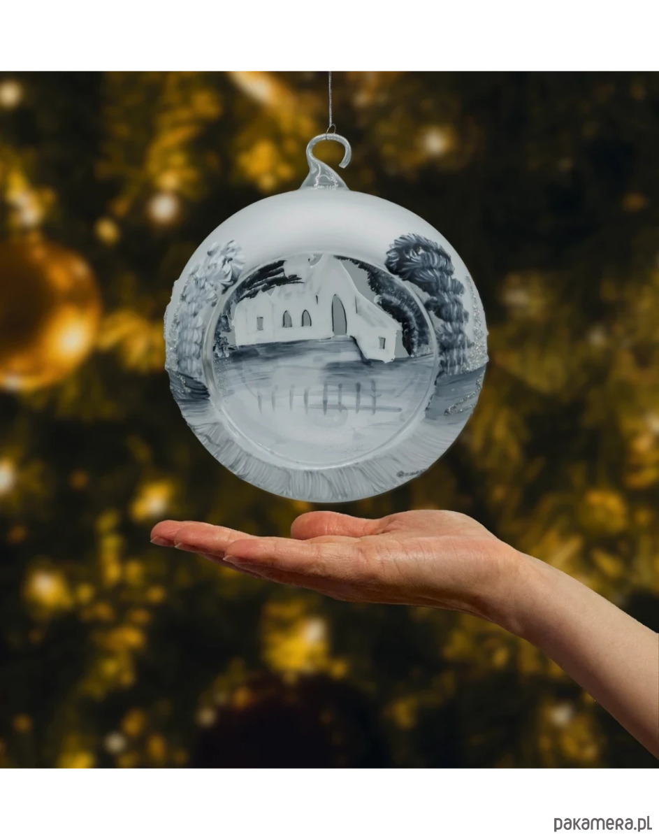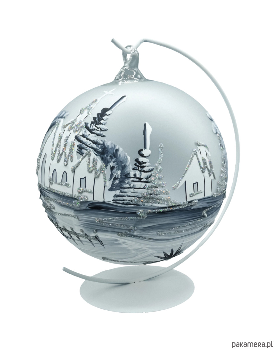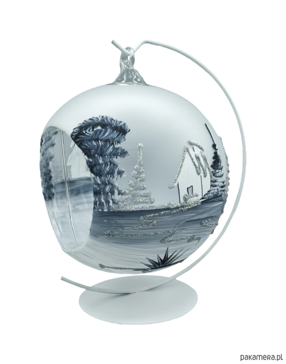 Zjawiskowa bombka–lampion o średnicy 15 cm wykonana z dmuchanego szkła i malowana w 100% ręcznie. Na matowym, srebrno–białym tle artysta namalował zimową wioskę z kościółkiem, świerkami i połyskiem śniegu. Monochromatyczna paleta bieli, srebra i grafitu, dopełniona drobnym brokatem, tworzy elegancki, „mroźny” efekt. Charakterystyczne okno–wycięcie zamienia bombkę w lampion – do środka możesz wstawić świeczkę tealight/LED, która pięknie rozświetla obraz, a odbicia w szkle budują nastrojową głębię. W komplecie otrzymujesz stabilny, metalowy stojak w kolorze białym, dzięki któremu dekoracja od razu jest gotowa do ekspozycji na komodzie, stole lub parapecie.