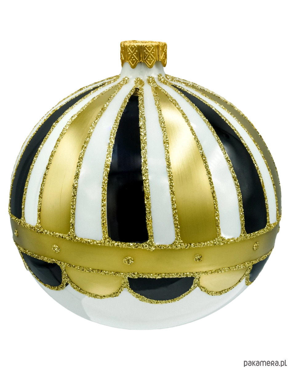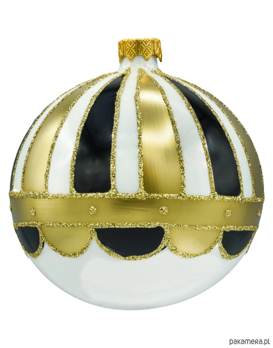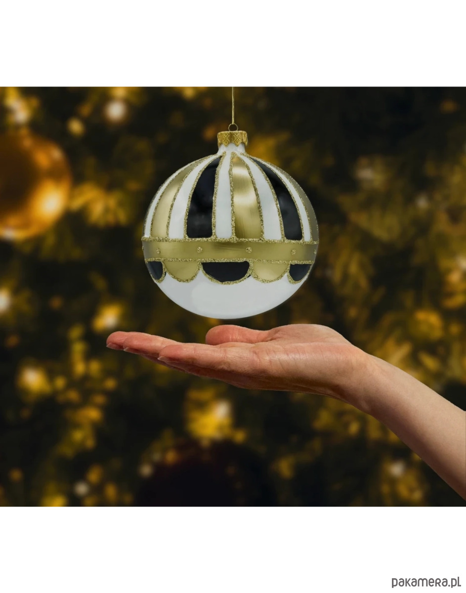 Wytworne bombki choinkowe, które od razu budują klimat „glamour”. Dwie sztuki w spójnym wzorze pasów (biel/czerń) podkreślonych złotymi, brokatowymi liniami tworzą efekt eleganckiej kopuły. Każda bombka ma metalową koronę w kolorze złota i trafia do dekoracyjnego pudełka z dużą kokardą – gotowe na prezent i bezpieczne przechowywanie po sezonie.