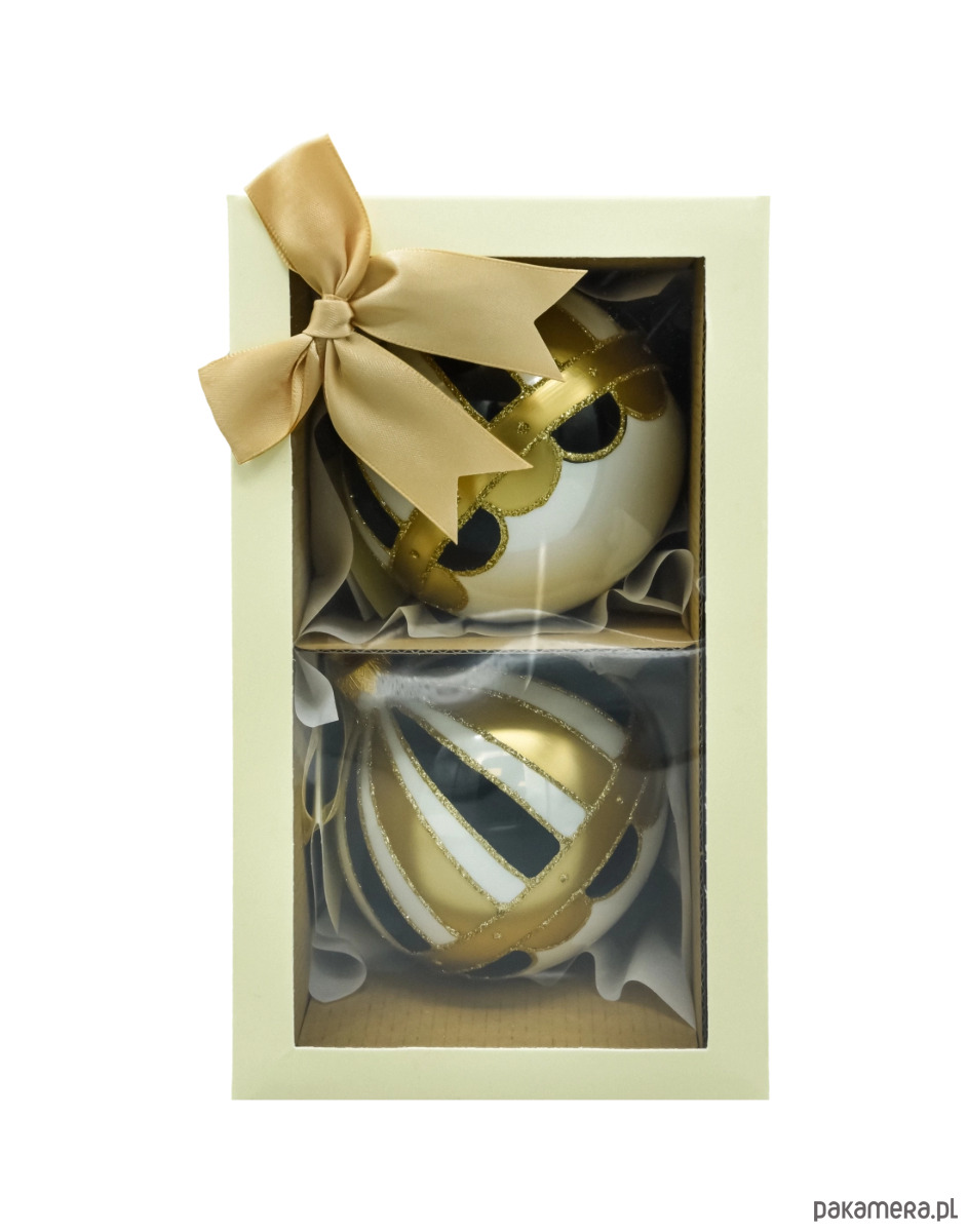 Zestaw 2 szt. bombek szklanych 10 cm to dekoracja klasy premium: ręczne zdobienie, ponadczasowa kolorystyka i pudełko upominkowe. To gotowy komplet, który natychmiast podniesie prestiż każdej choinki i zachwyci obdarowanych.`