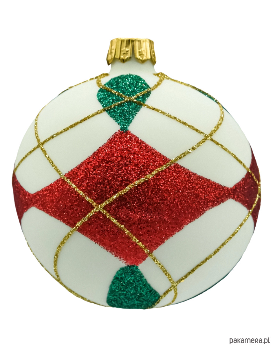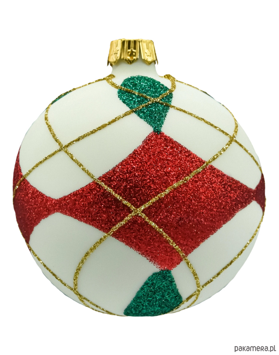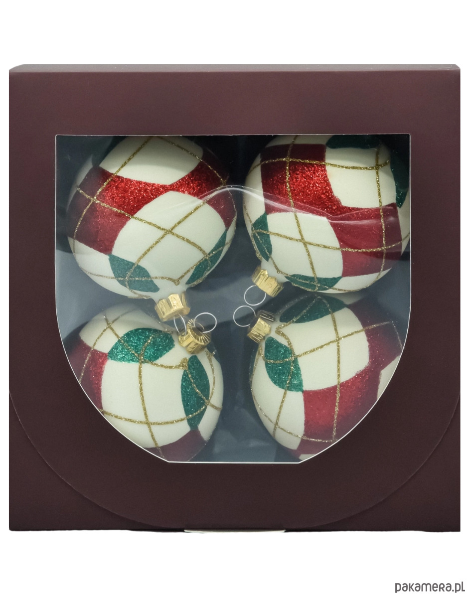 Wprowadź na choinkę klasyczny, świąteczny klimat. Zestaw czterech szklanych bombek o średnicy 8 cm ozdobiono ręcznie wzorem rombów/„harlequin” w czerwonym i zielonym brokacie, połączonych delikatną, złotą siateczką. Matowa (satynowa) biała baza pięknie kontrastuje z połyskiem brokatu, dzięki czemu ozdoby efektownie odbijają światło lampek i są widoczne nawet z dalszej odległości.