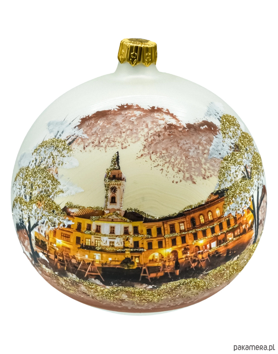 • Motyw: Cieszyn – Rynek / ratusz w zimowej scenerii, ręczne malowanie + brokatowe detale.