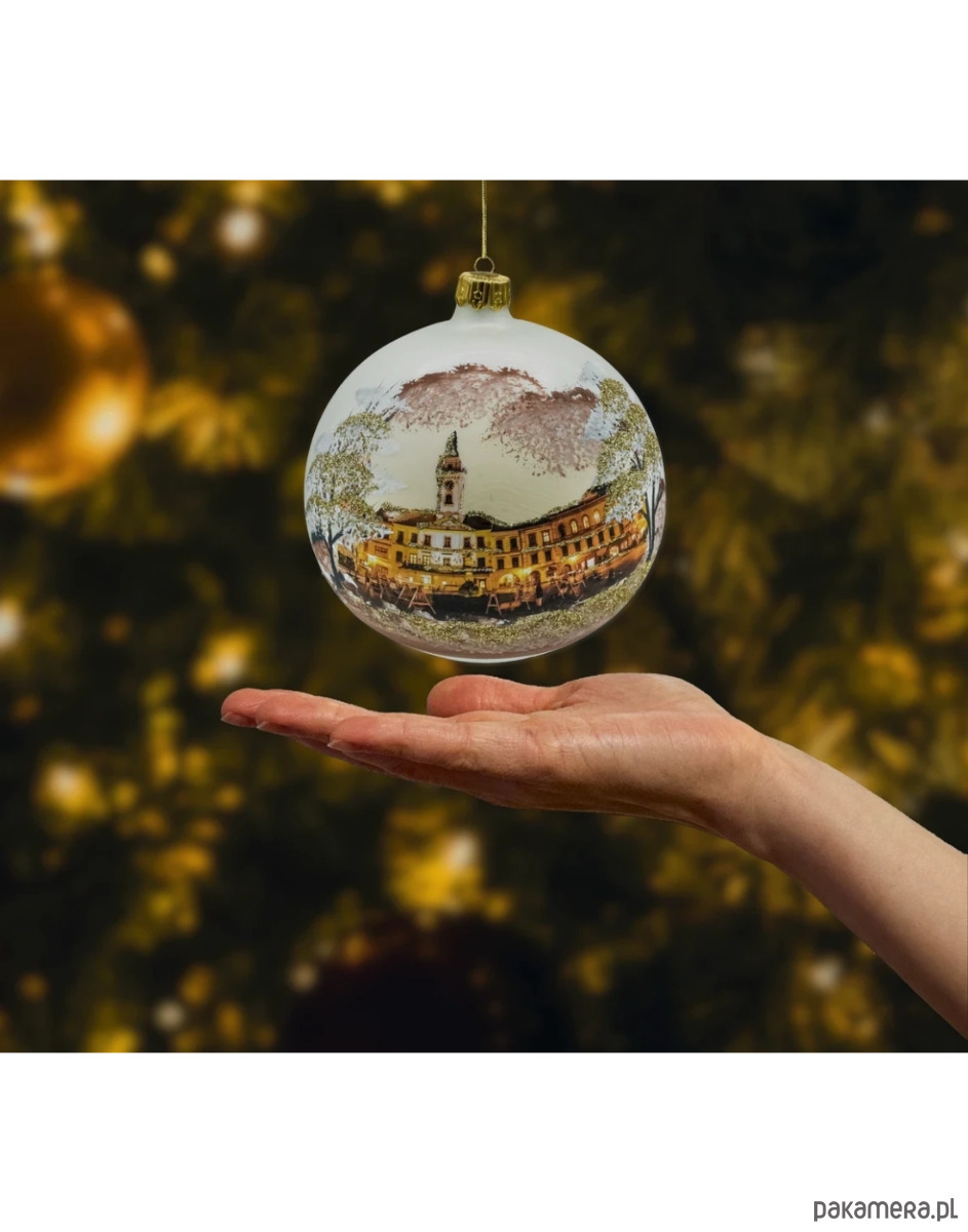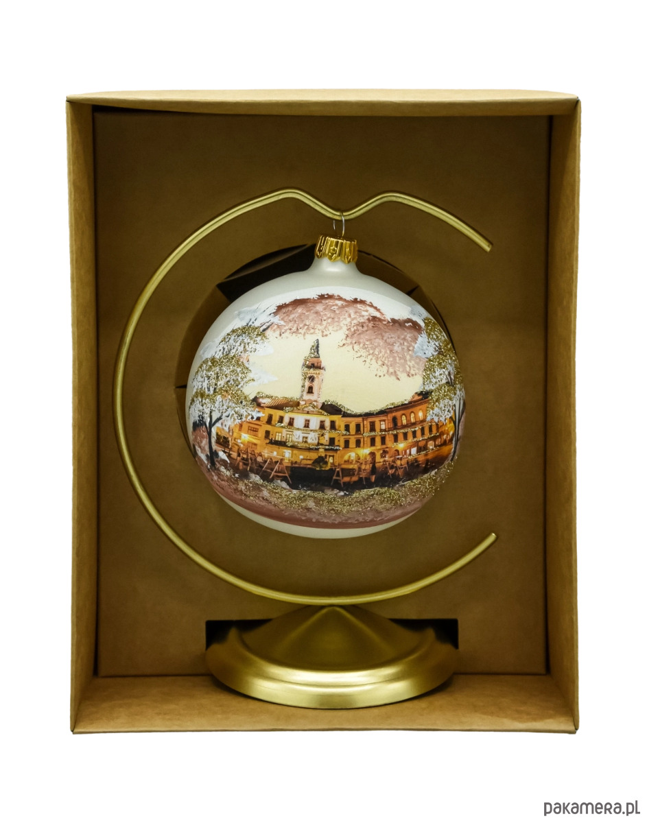 Oddaj magię świąt i urok historycznego Cieszyna w jednej, kolekcjonerskiej ozdobie. Ta ręcznie malowana szklana bombka „Cieszyn” (10 cm) przedstawia nastrojową panoramę Rynku z ratuszem w zimowej oprawie. Subtelne akcenty brokatu podkreślają światła miasta, a na rewersie widnieje złoty napis „Cieszyn”. W komplecie otrzymujesz elegancki, złoty stojak, dzięki któremu ozdoba może zdobić dom nie tylko na choince, ale przez cały rok – na komodzie, biurku czy w witrynie.