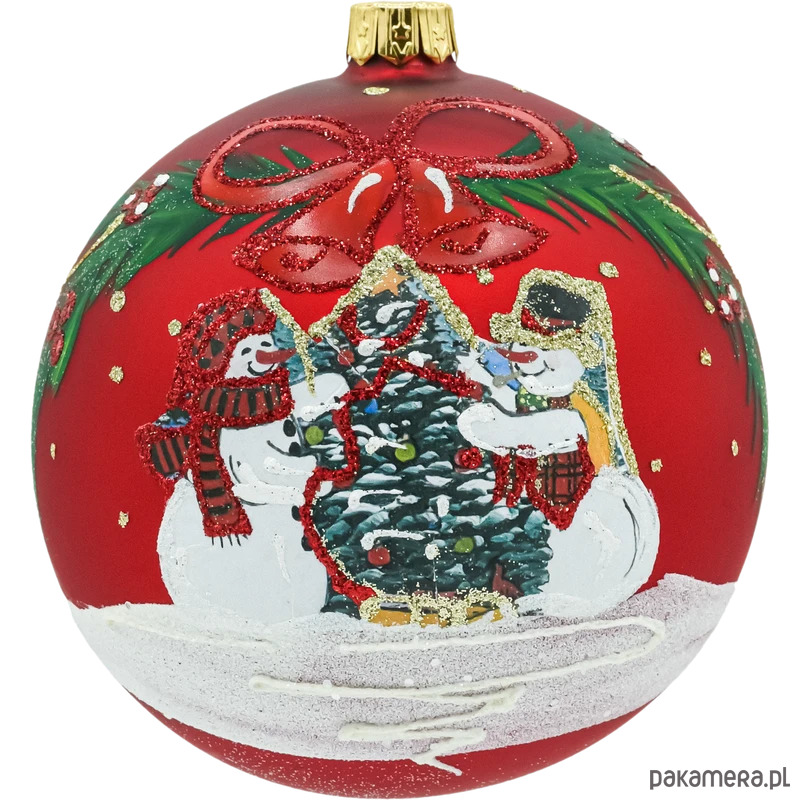 Matowa czerwień tła tworzy idealne tło dla subtelnych, malowanych pędzlem detali: śnieżnych połaci wykonanych pastą z efektem „śniegu”, gałązek świerku, dużej kokardy oraz uroczych bałwanków otulających choinkę. Złoty brokat i delikatne kropki-„płatki śniegu” nadają całości blasku, dzięki czemu bombka pięknie mieni się w świetle choinkowych lampek. To w 100% ręczna praca polskich rzemieślników – każda sztuka jest unikatowa.