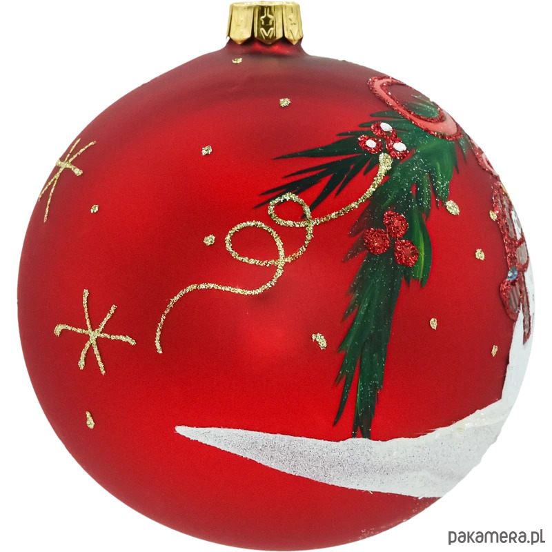 Wykończenie: satynowa czerwień + ręczne malowanie farbami do szkła, aplikacje ze śnieżnej pasty i złotego brokatu.