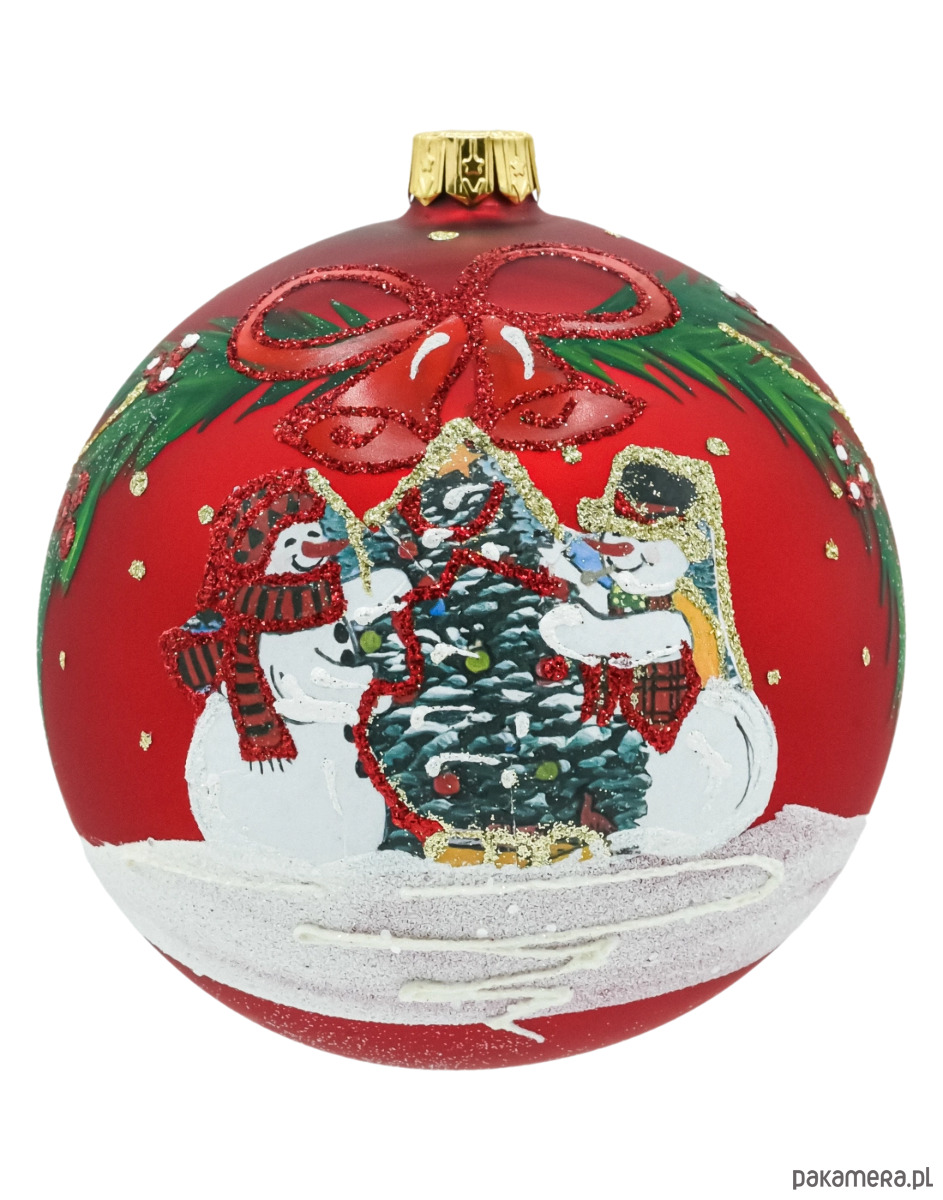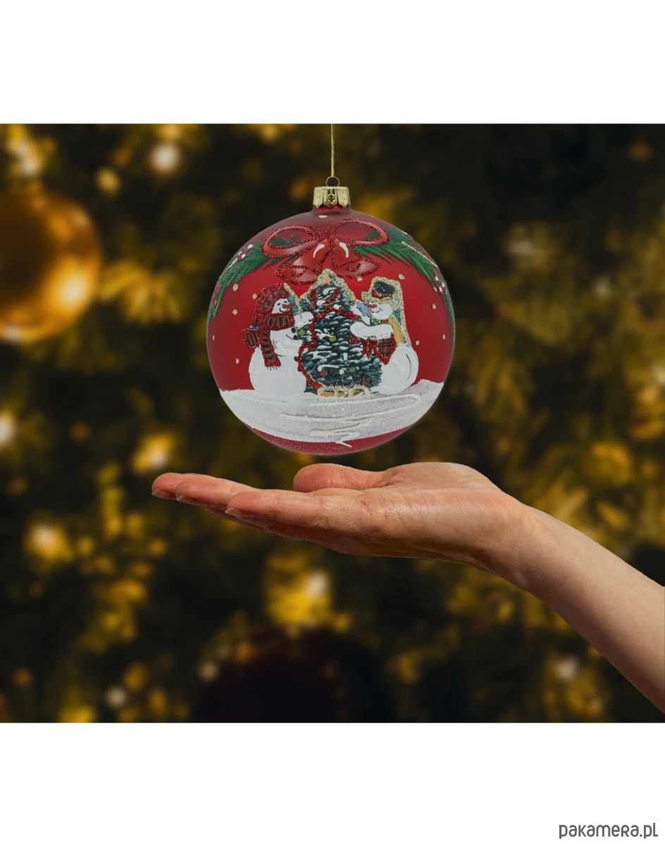 Matowa czerwień tła tworzy idealne tło dla subtelnych, malowanych pędzlem detali: śnieżnych połaci wykonanych pastą z efektem „śniegu”, gałązek świerku, dużej kokardy oraz uroczych bałwanków otulających choinkę. Złoty brokat i delikatne kropki-„płatki śniegu” nadają całości blasku, dzięki czemu bombka pięknie mieni się w świetle choinkowych lampek. To w 100% ręczna praca polskich rzemieślników – każda sztuka jest unikatowa.