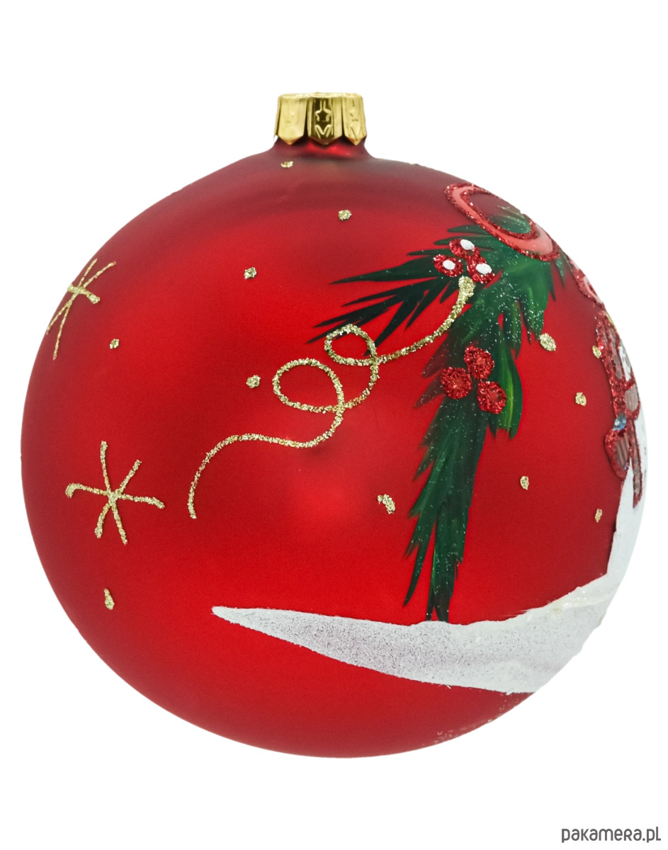 Wykończenie: satynowa czerwień + ręczne malowanie farbami do szkła, aplikacje ze śnieżnej pasty i złotego brokatu.