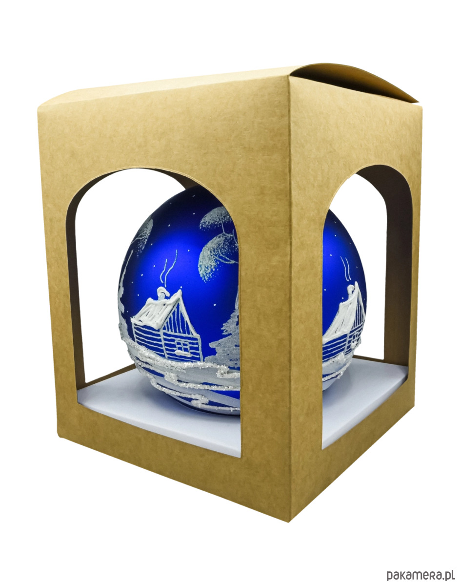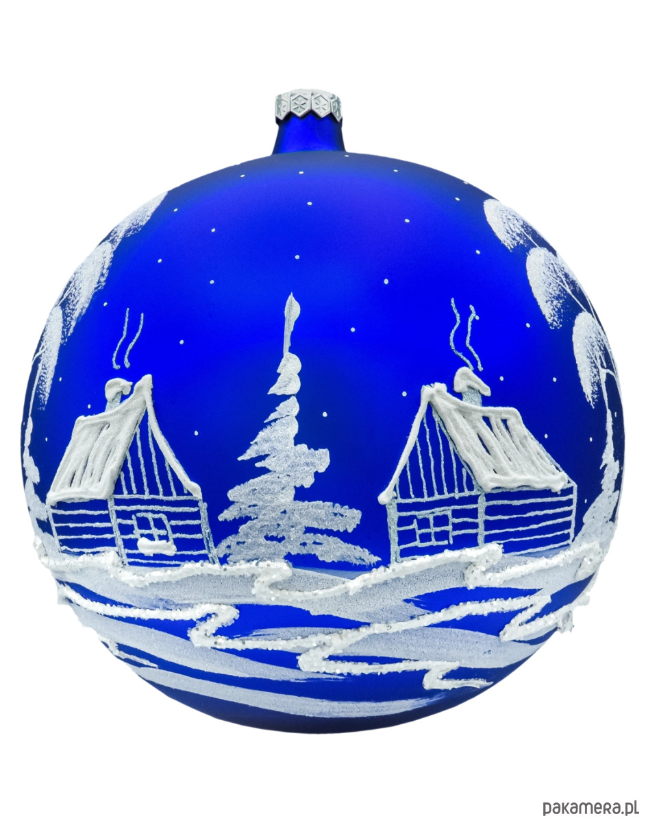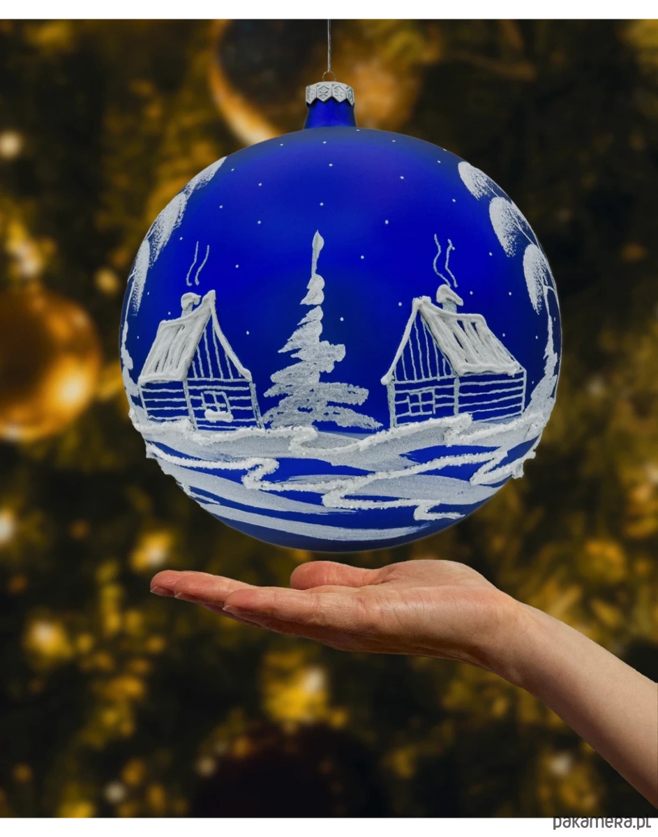 Wielkoformatowa, szklana bombka choinkowa o średnicy 20 cm zachwyca głębokim, granatowym tłem i ręcznie malowanym, świątecznym pejzażem: białe, ośnieżone domki, choinki, migoczące drobinki brokatu oraz gwiaździste niebo. Każdy egzemplarz powstaje z dmuchanego szkła i jest dekorowany pędzlem przez polskich rękodzielników – dzięki temu bombka wygląda jak mały obraz i pięknie odbija światło lampek. To idealna dekoracja świąteczna do salonu, hotelowego lobby, restauracji lub na okazałą choinkę w domu.
