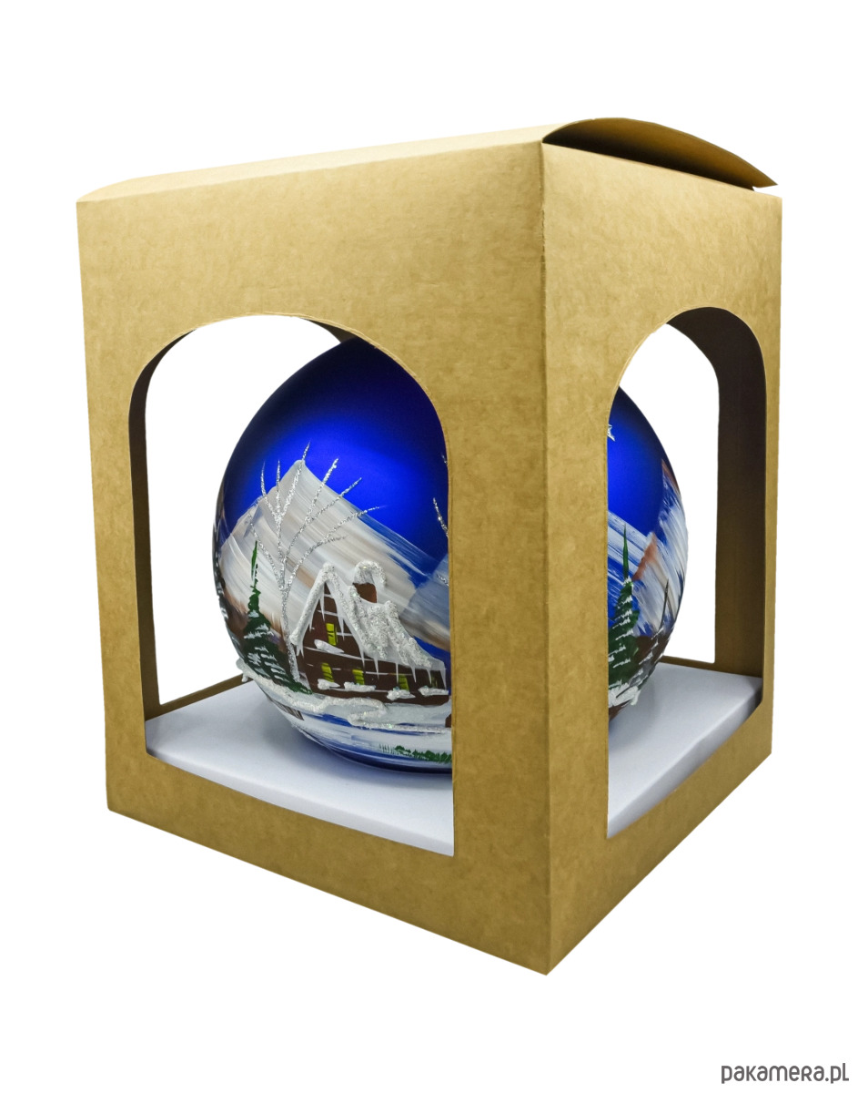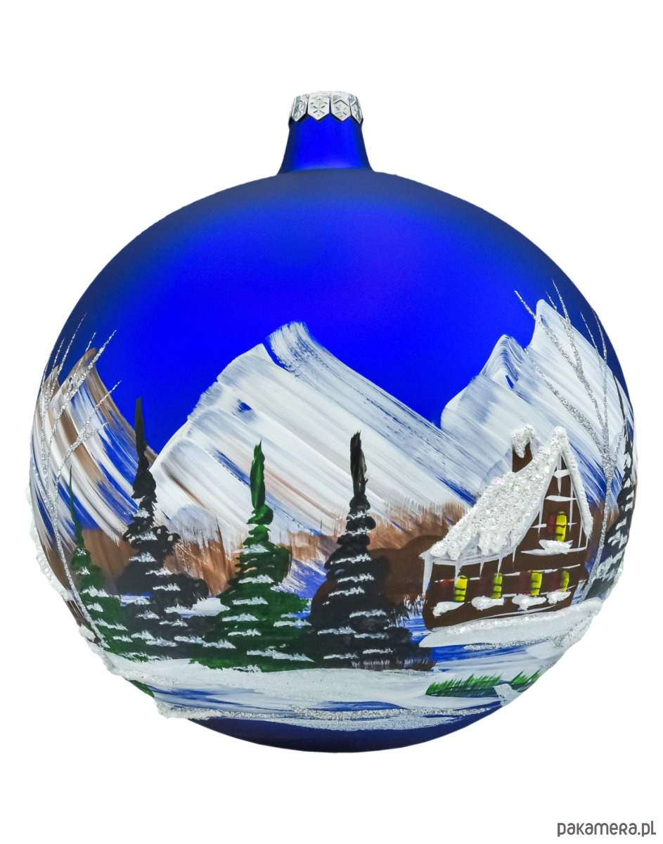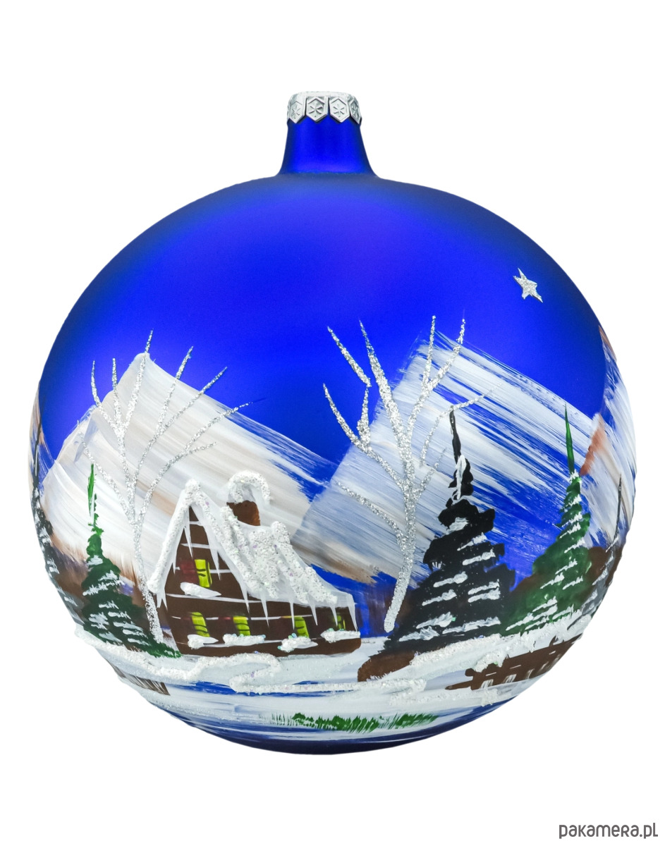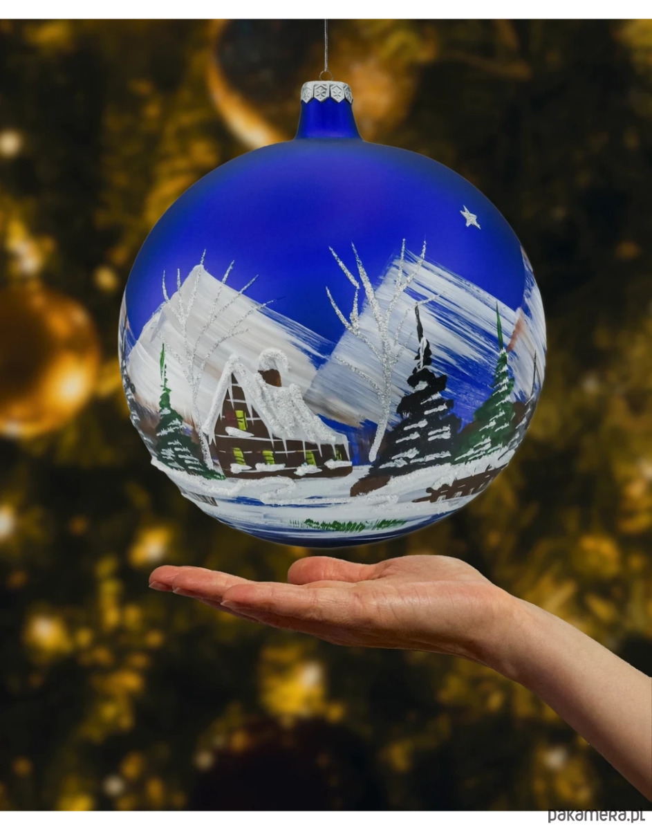 Efektowna, duża kula o średnicy 20 cm zachwyca głębokim, niebieskim tłem i malowanym ręcznie zimowym krajobrazem: chatką z ośnieżonym dachem, świerkami i rozgwieżdżonym niebem. Grubsze pociągnięcia pędzla oraz drobny brokat imitują szron i świeży śnieg, tworząc delikatny efekt 3D. Każdy egzemplarz jest unikatowy – to prawdziwa szklana bombka choinkowa dla miłośników klasycznych, nastrojowych dekoracji.