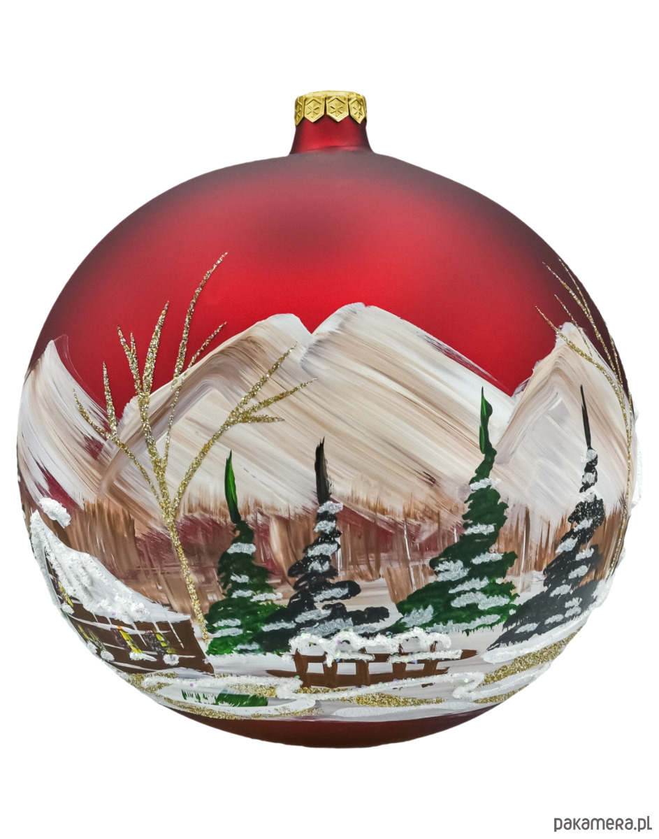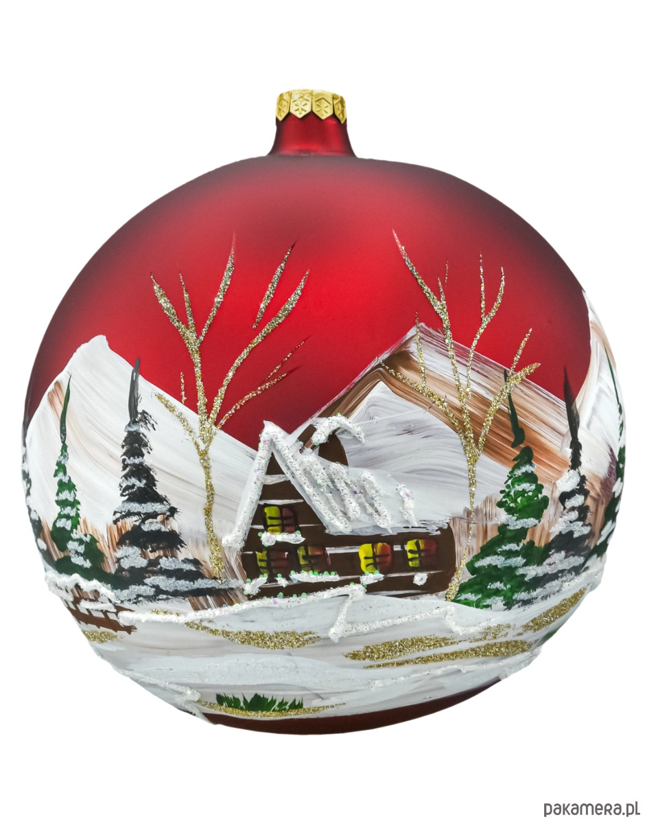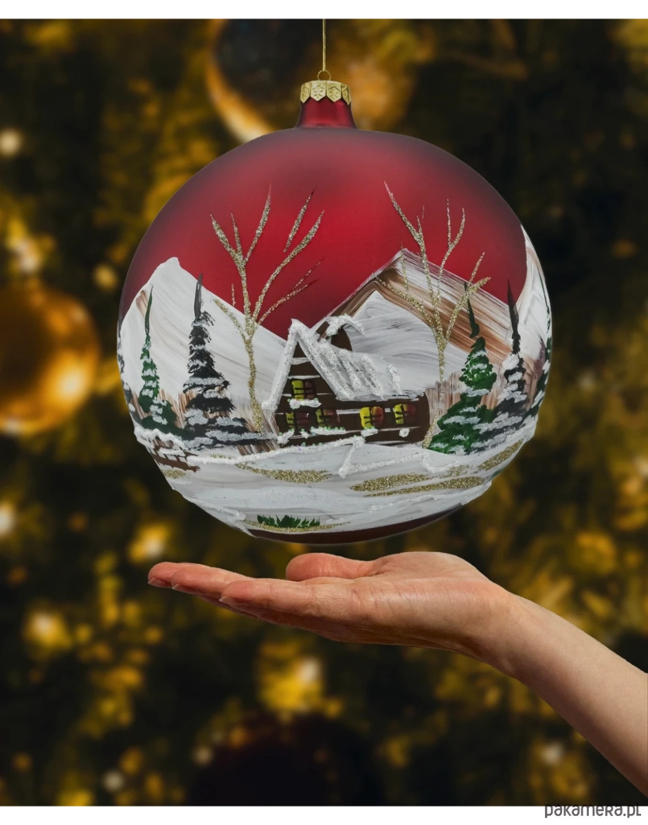 Efektowna bombka choinkowa 20 cm w głębokim, matowym odcieniu czerwieni. Na kuli ręcznie namalowano klasyczny zimowy pejzaż: górskie szczyty, świerki przysypane śniegiem, błyszczące gałązki oraz drewnianą chatkę z żółtym światłem w oknach. Śniegowe faktury i brokatowe akcenty (złoto + srebro) dodają subtelnego blasku i wyraźnego efektu 3D, który pięknie „łapie” światło lampek choinkowych. To ponadczasowa ozdoba świąteczna premium, która podkreśli charakter zarówno tradycyjnych, jak i nowoczesnych aranżacji.