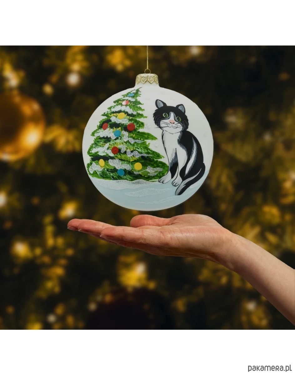 • Zdobienie: ręcznie malowana scena z choinką i kotem + śnieżny brokat dla połysku i efektu 3D.