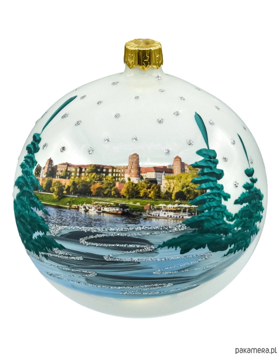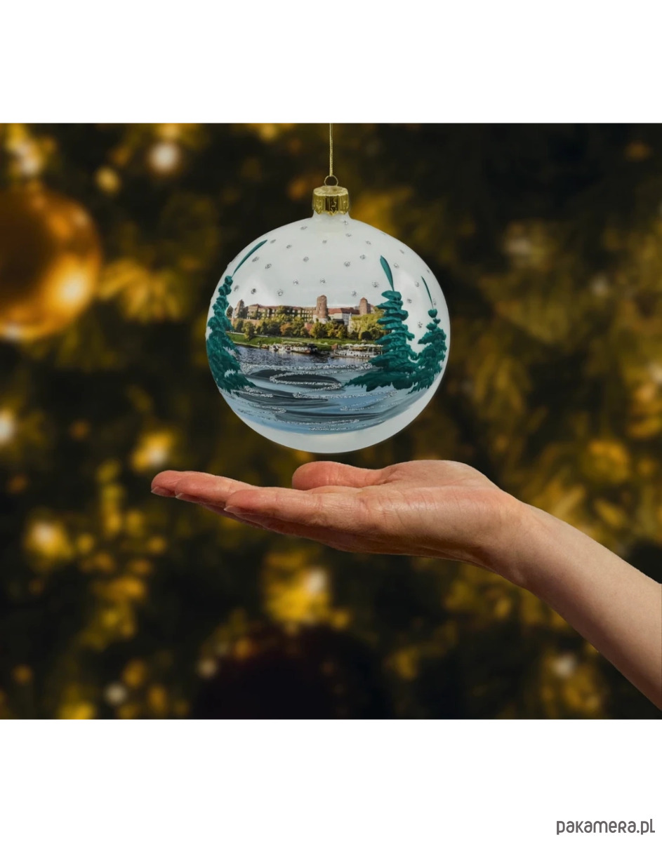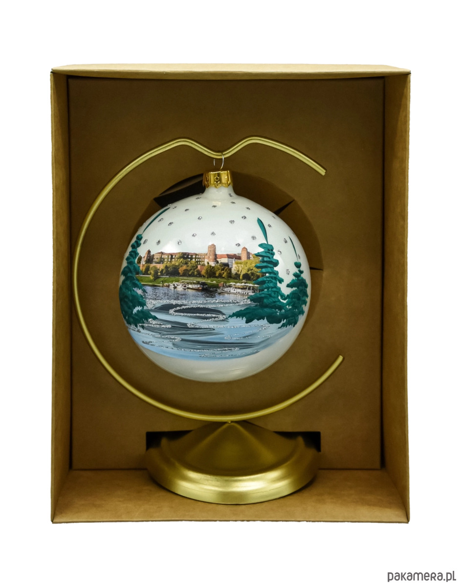 Urokliwa, ręcznie zdobiona bombka z widokiem Wawelu nad Wisłą to elegancka pamiątka z Krakowa i wyjątkowa ozdoba świąteczna. Na perłowym tle umieszczono realistyczny motyw panoramy wzgórza wawelskiego i nabrzeża z łodziami, otoczony malowanymi choinkami i delikatnymi „śnieżnymi” akcentami z brokatu. Rewers zdobi napis „Kraków” wykonany brokatem, dzięki czemu ozdoba jednoznacznie nawiązuje do miasta królów. Bombka ma średnicę 10 cm i jest wykonana ze szkła – tradycyjnie dmuchanego i ręcznie malowanego w Polsce. W komplecie otrzymujesz stabilny, metalowy złoty stojak oraz estetyczne pudełko w kolorze kraft – idealne do wręczenia jako gotowy prezent.