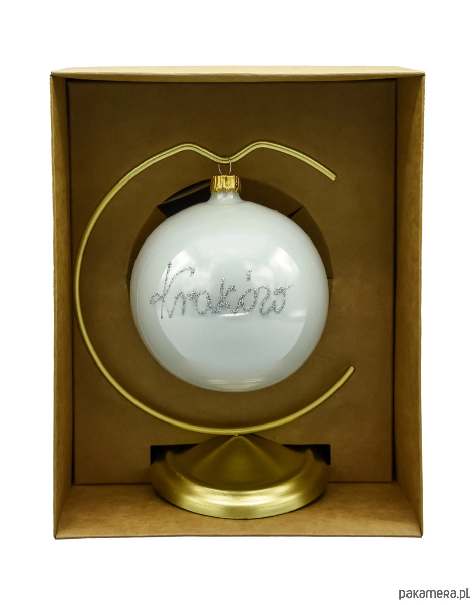 • Zestaw: bombka 10 cm + metalowy stojak w kolorze złotym + pudełko prezentowe (kraft).