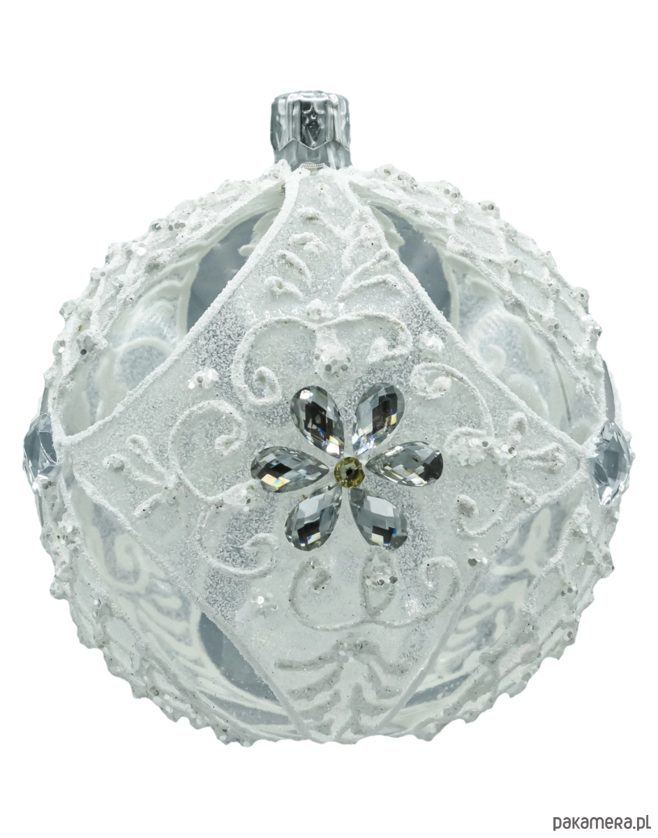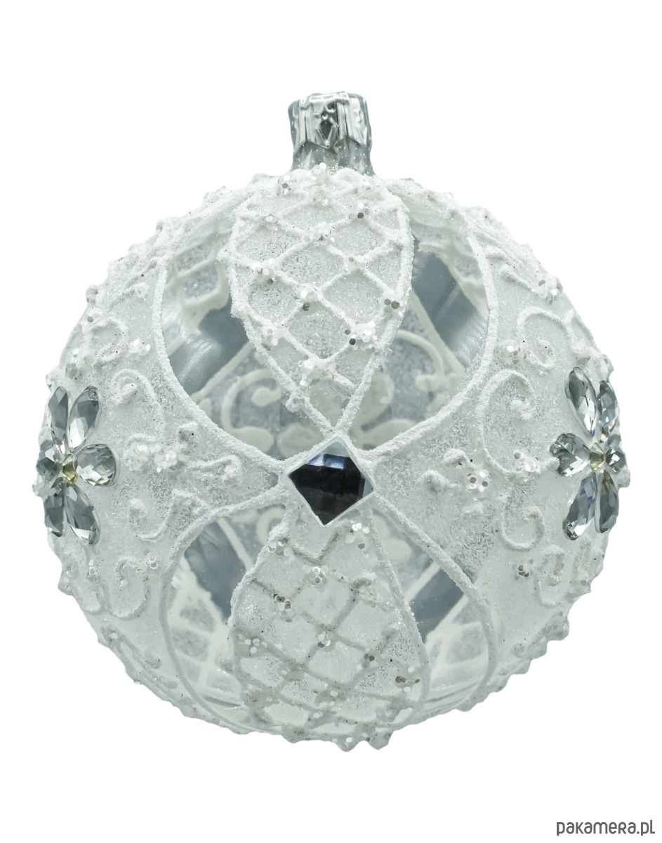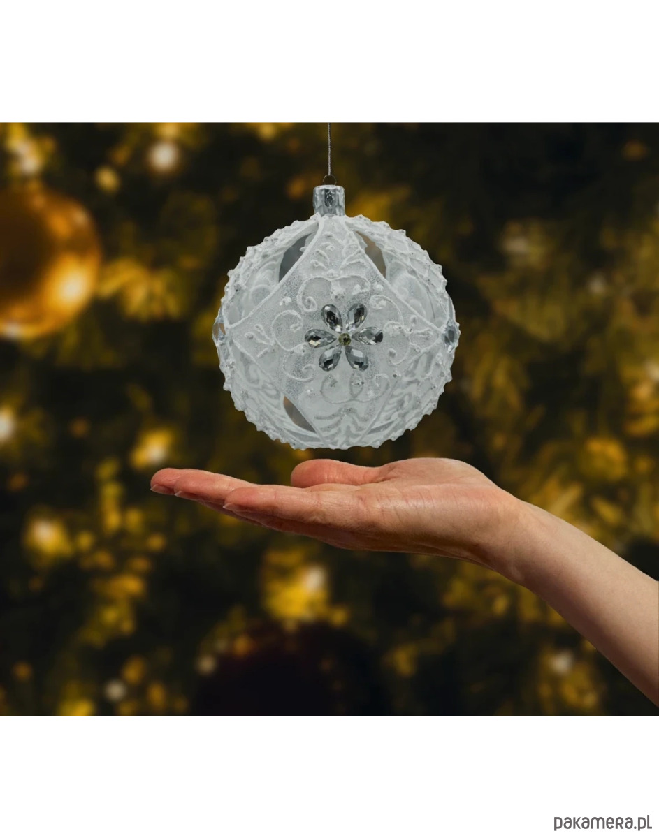 Wytworna bombka choinkowa 10 cm – szklana, ażurowa, biała glamour. Ręcznie formowana ze szkła i bogato zdobiona wypukłą koronką z białego „śnieżnego” reliefu, drobnymi perełkami, połyskującym brokatem oraz lśniącymi kryształkami, które układają się w kwiatowe rozetki. Przezroczyste ścianki i ażurowe „okna” nadają ozdobie lekkości, a srebrna koronka i geometryczne detale pięknie odbijają światło lampek na choince. To ekskluzywna dekoracja w stylu glamour / klasycznym / ślubnym, która natychmiast podnosi rangę świątecznej aranżacji.