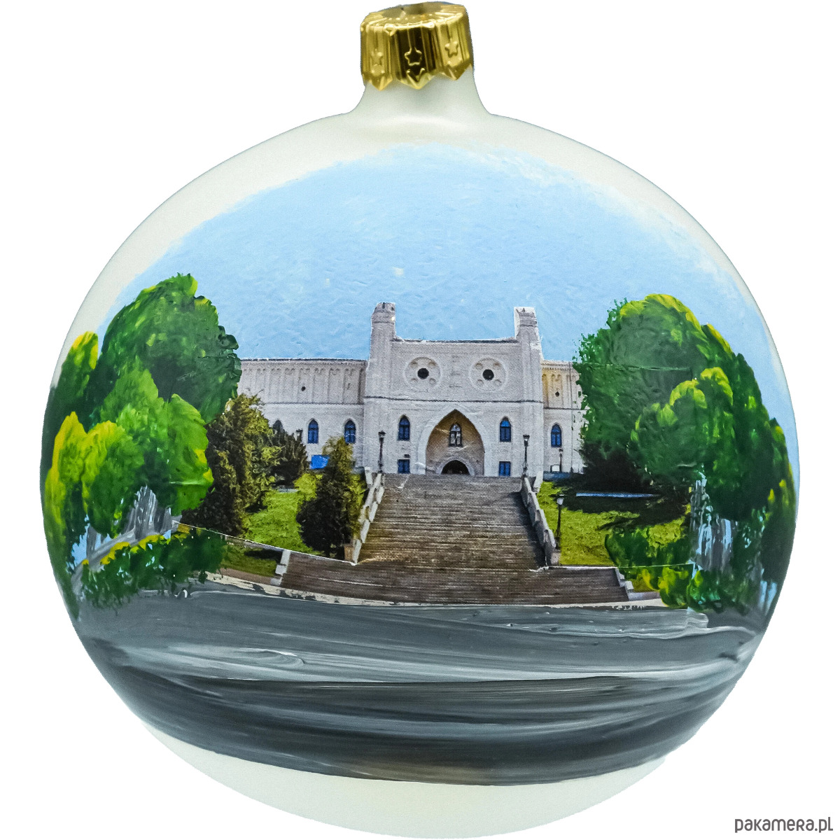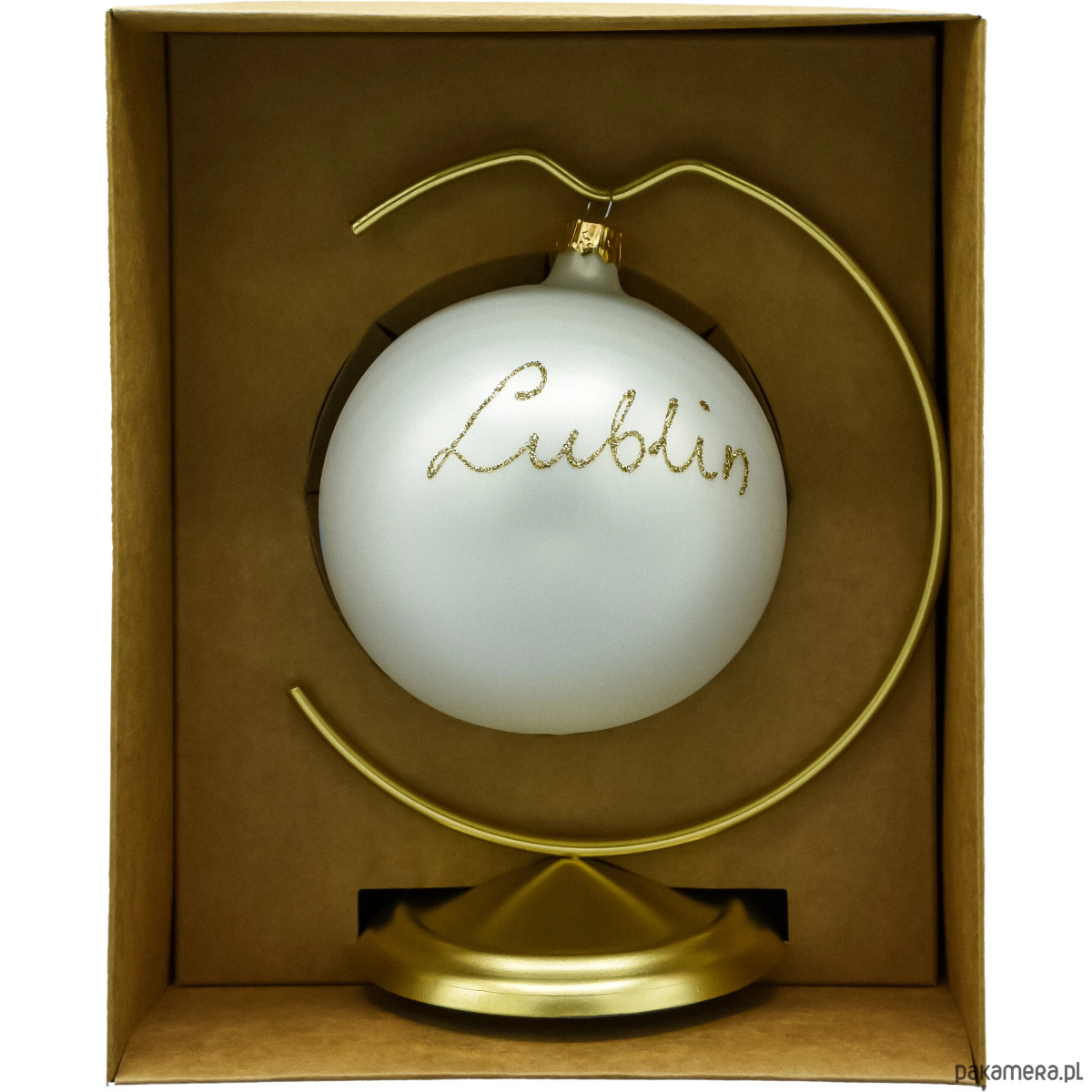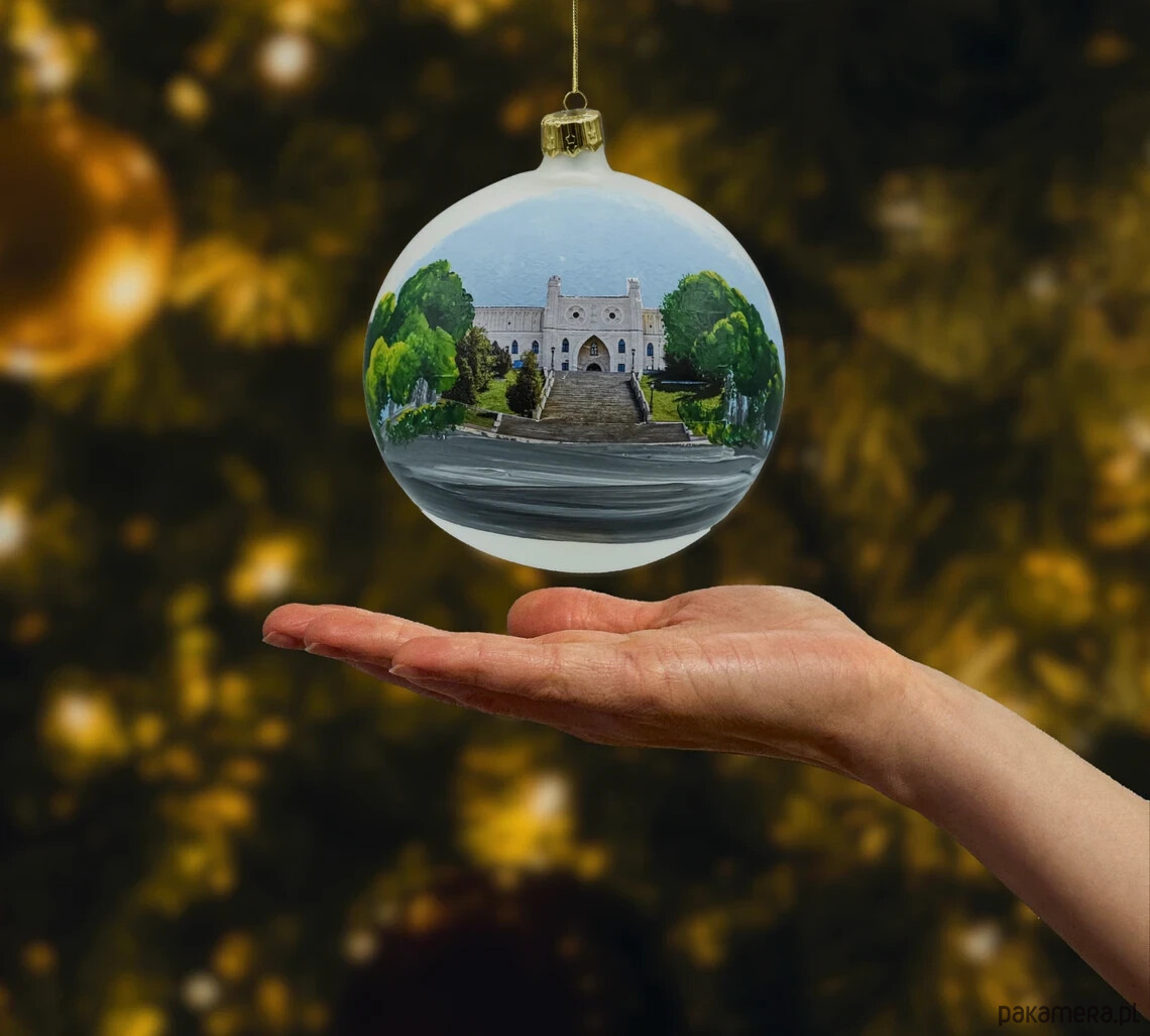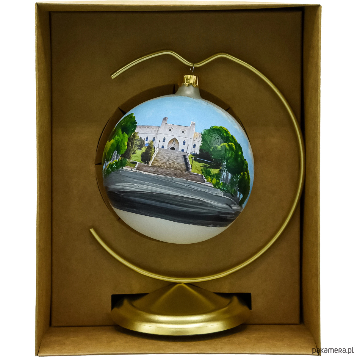 Ręcznie malowana bombka z widokiem na lubelski Zamek to elegancka pamiątka i wyjątkowa ozdoba świąteczna w jednym. Na śnieżnym tle artysta przedstawił reprezentacyjne schody prowadzące do Zamku Lubelskiego, otoczone zielenią – z lekkimi, mieniącymi się akcentami. Na rewersie znajduje się napis „Lublin” wykonany złotym brokatem. Bombka ma klasyczny średnicę 10 cm i przychodzi w komplecie z metalowym stojakiem w kolorze złota oraz estetycznym pudełkiem – gotowa do wręczenia jako prezent.