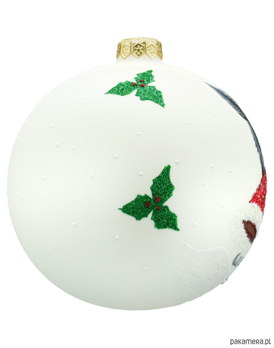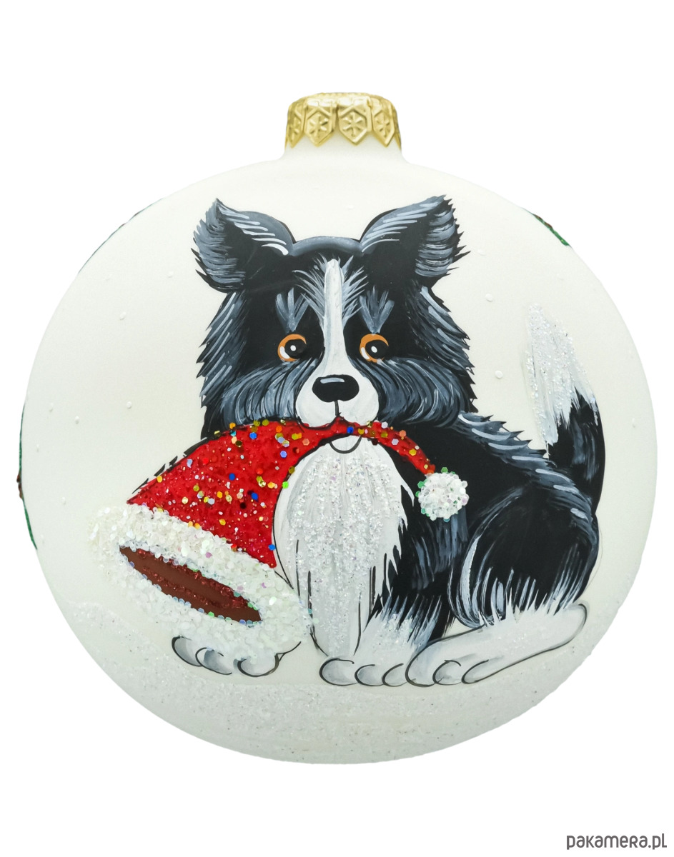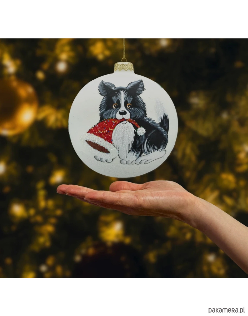 Ręcznie dmuchana, szklana bombka choinkowa 12 cm w kształcie płaskiego medalionu. Na awersie widnieje uroczy piesek w typie Border Collie trzymający w pysku czerwoną czapkę Mikołaja – detal podkreślony połyskiem brokatu i śnieżnymi fakturami 3D. Rewers zdobią gałązki ostrokrzewu z czerwonymi jagodami (brokat), a tło ma szlachetną, śnieżnobiałą matową bazę. Całość wykończono złotą koronką przy zawieszce – klasyczna, elegancka ozdoba świąteczna dla miłośników zwierząt i rękodzieła.