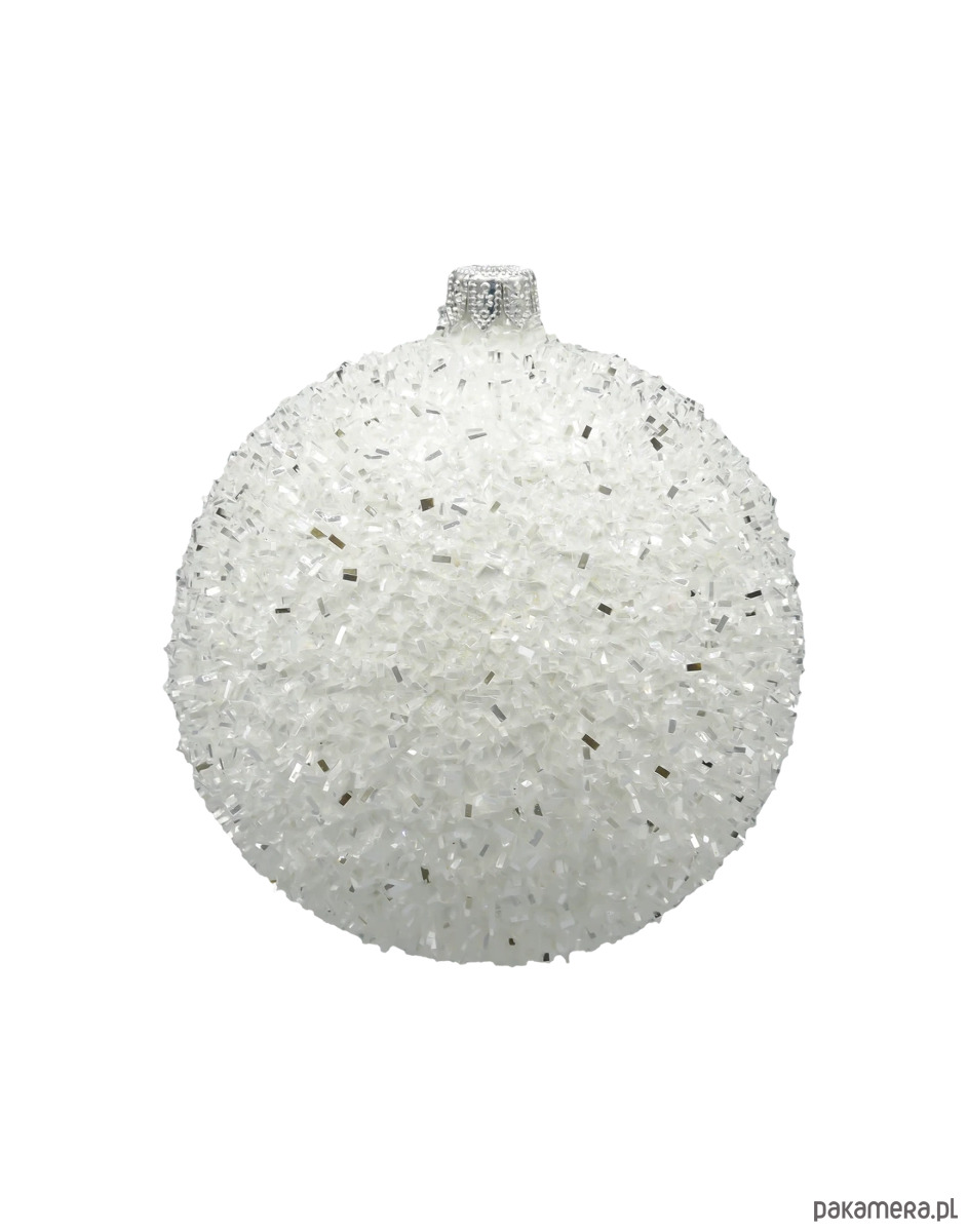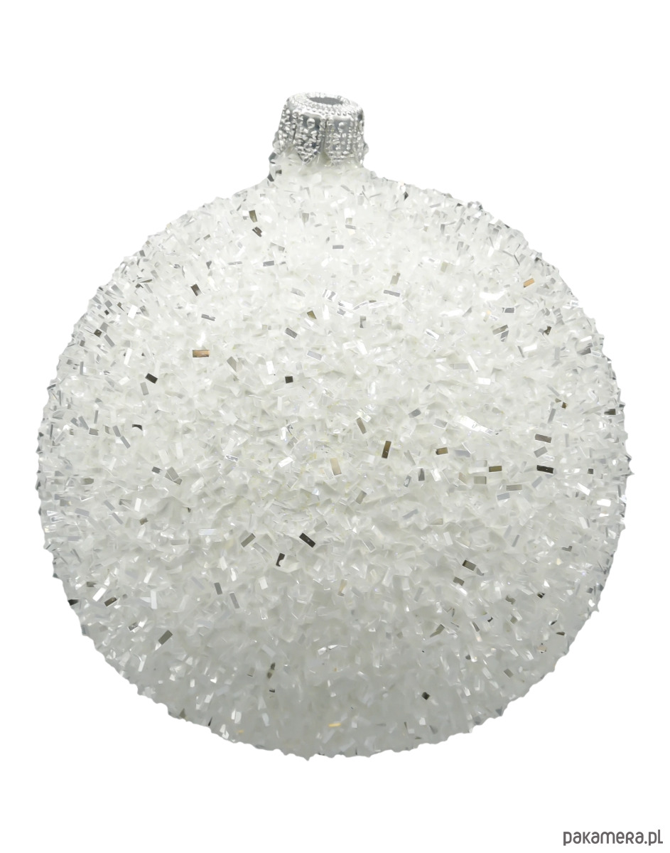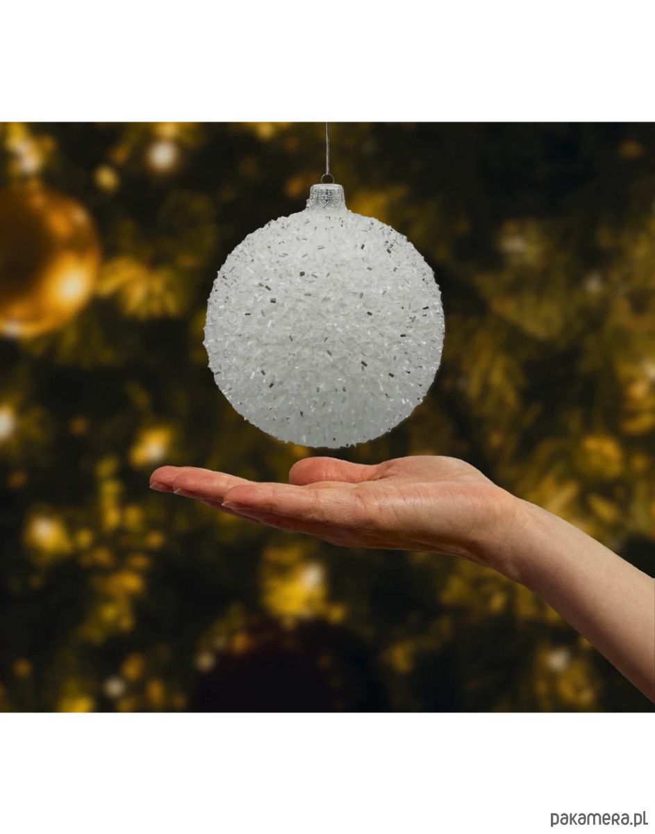Biała szklana bombka choinkowa o średnicy 10 cm to prawdziwa perła wśród klasycznych świątecznych dekoracji. Pokryta gęstą, połyskującą białą posypką, zachwyca subtelnym blaskiem i eleganckim wykończeniem, przypominającym delikatne płatki lodu lub szronu. Efekt 3D oraz migotanie światła sprawiają, że bombka prezentuje się niezwykle efektownie zarówno w dziennym świetle, jak i przy iluminacji lampek choinkowych.