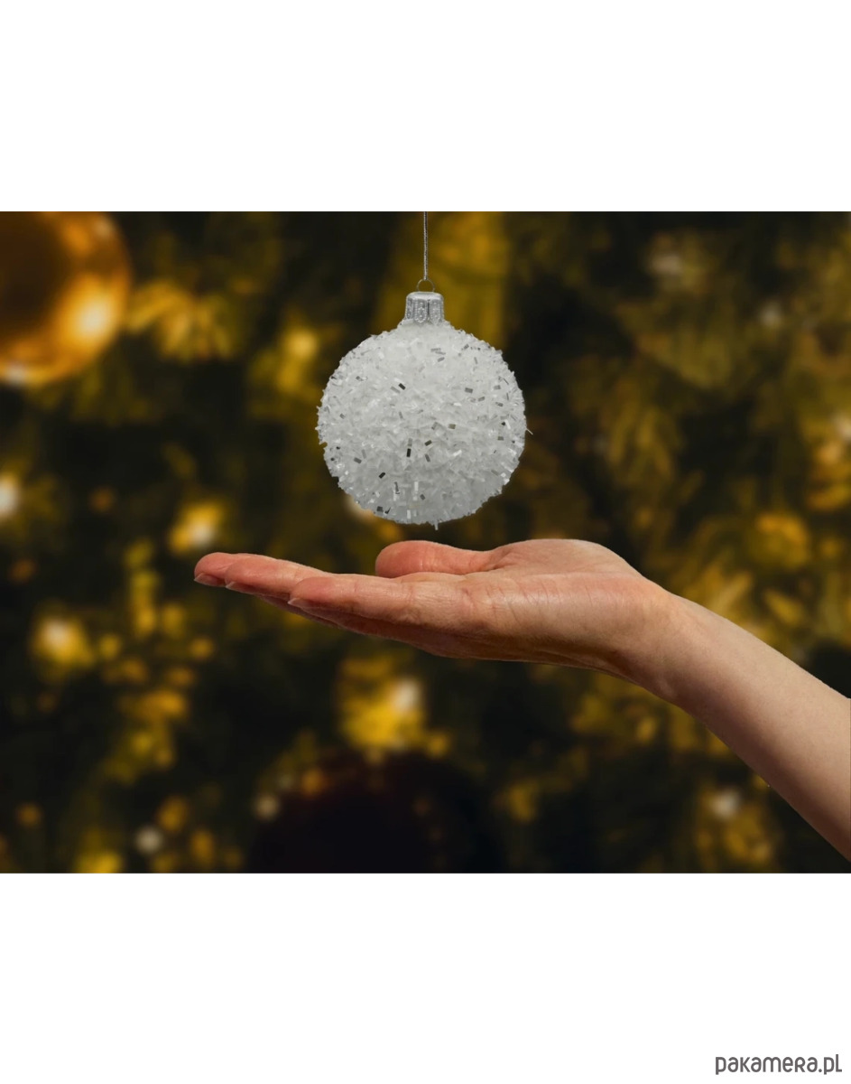 Szklana bombka śnieżka o średnicy 6 cm to esencja świątecznej elegancji w wersji mini. Pokryta gęstą białą posypką z dodatkiem połyskujących srebrnych drobinek, zachwyca efektem lodowego kryształu i doskonale odbija światło choinkowych lampek, tworząc subtelny blask i przytulną atmosferę. To doskonały wybór dla tych, którzy cenią minimalistyczne, ale efektowne dekoracje świąteczne.