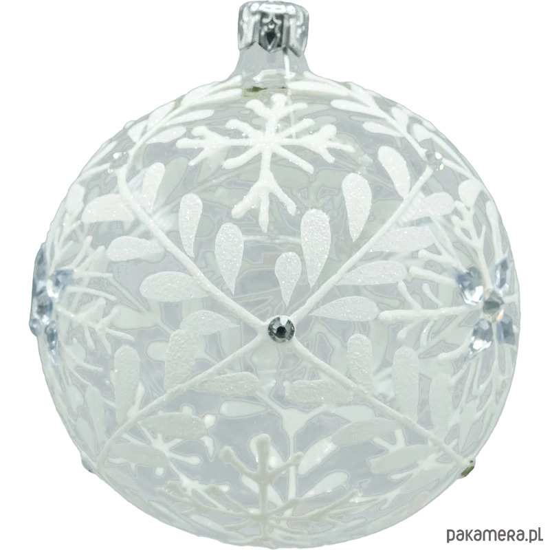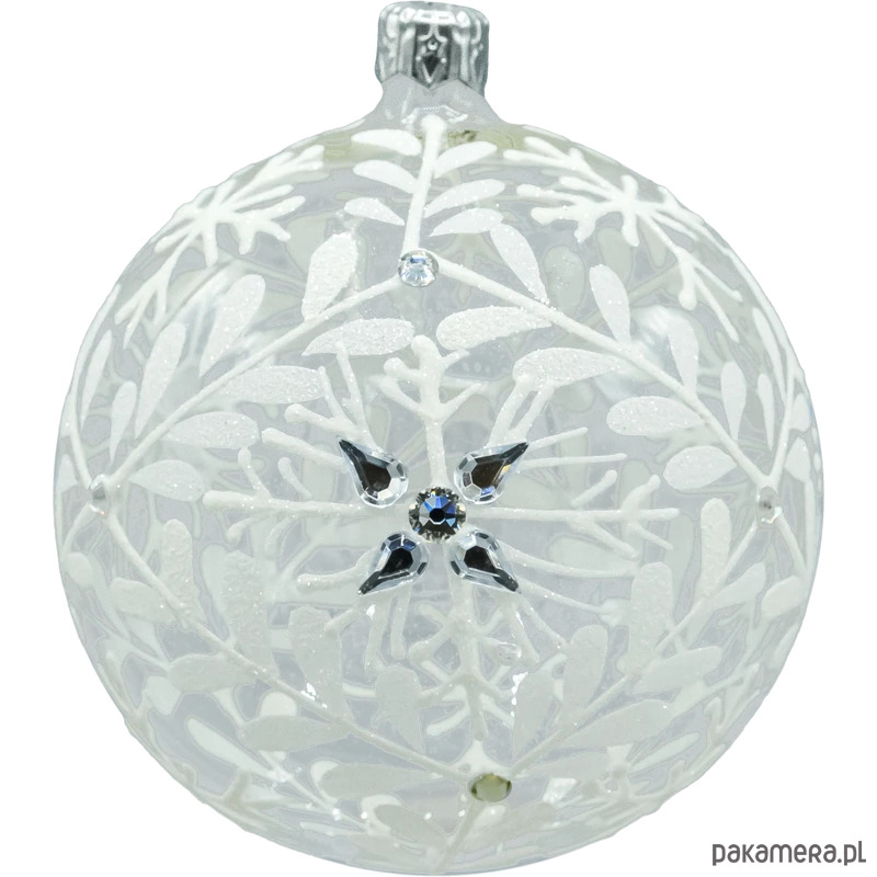Elegancka, ręcznie zdobiona szklana bombka choinkowa w wersji transparentnej z białym, zimowym ornamentem. Kula została tradycyjnie dmuchana ustnie z cienkiego szkła i ręcznie malowana w naszej pracowni, dzięki czemu zachwyca lekkością, przejrzystością i perfekcyjnym wykończeniem detali. Ażurowy wzór gałązek (jemioła/śnieżynka) wykonano perłowo-białą pastą o efekcie śniegu oraz błyszczącym brokatem. Kompozycję dopełniają kryształowe kamienie osadzone punktowo – subtelnie odbijają światło lampek i rozświetlają choinkę. Całość zamyka srebrna korona.