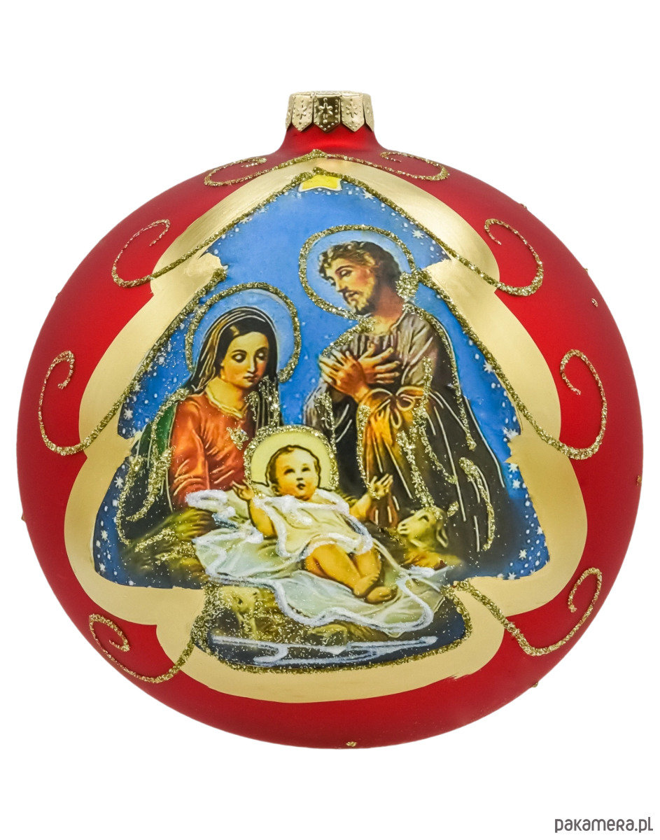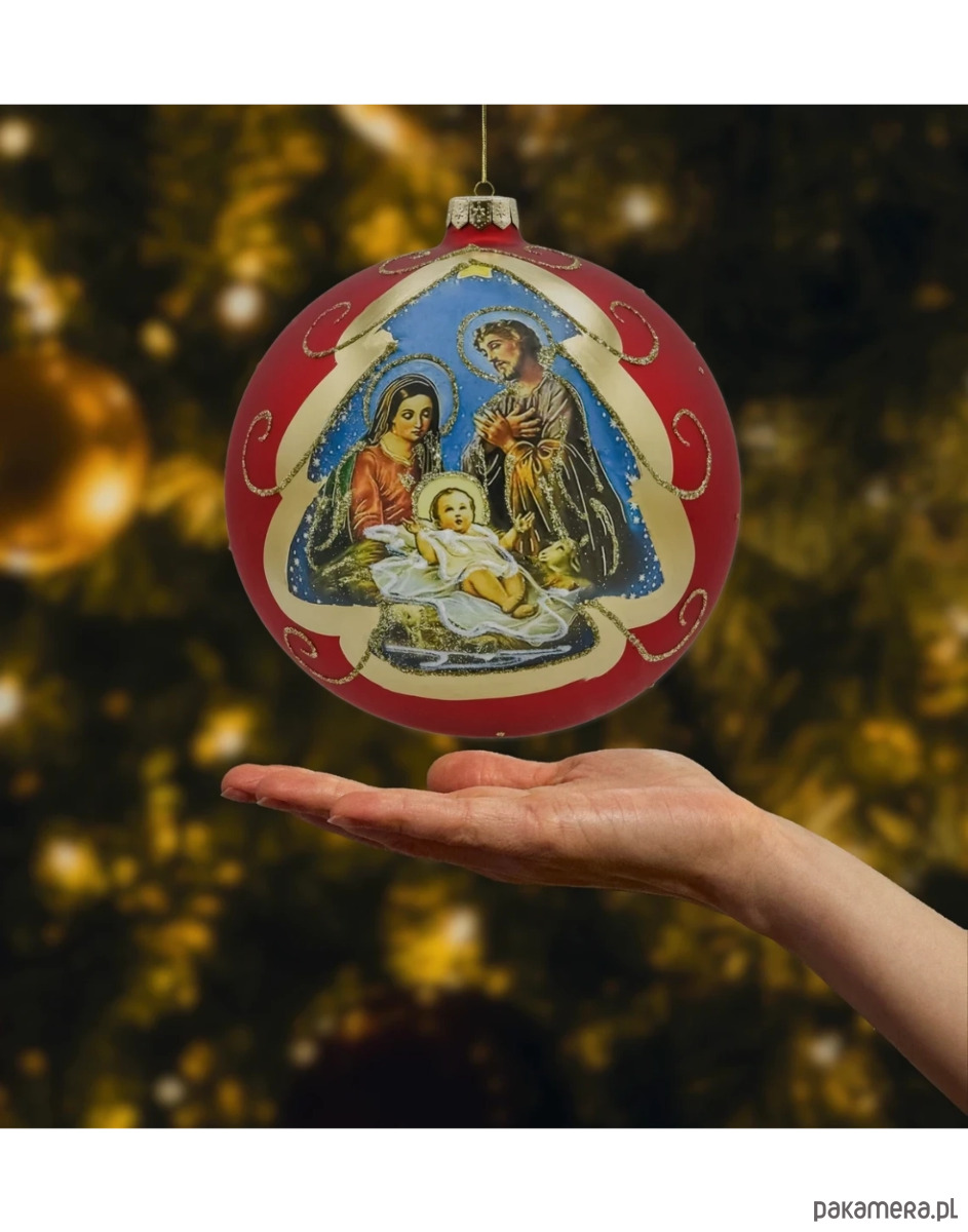Ta wyjątkowa bombka szklana przedstawia Świętą Rodzinę – Maryję, Józefa i Dzieciątko Jezus – w pełnym miłości, symbolicznym ujęciu. Scena została ukazana z ogromną czułością i dbałością o detale: Maryja klęczy, obejmując dzieciątko, a Józef otacza ich opiekuńczym ramieniem. Całość emanuje spokojem, ciepłem i głębokim znaczeniem duchowym.