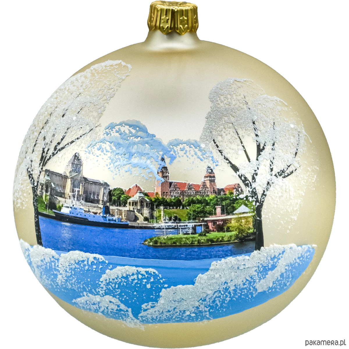 • Motyw: ręcznie malowana panorama Szczecina/Wałów Chrobrego, zimowe drzewa i tafla Odry z mieniącym się brokatem.