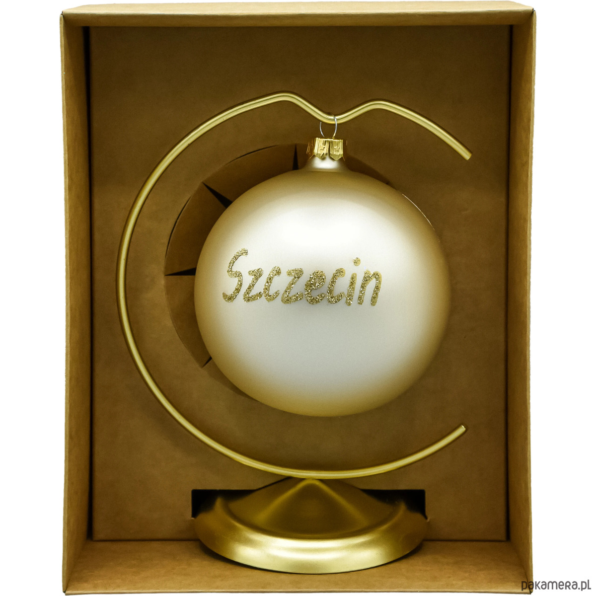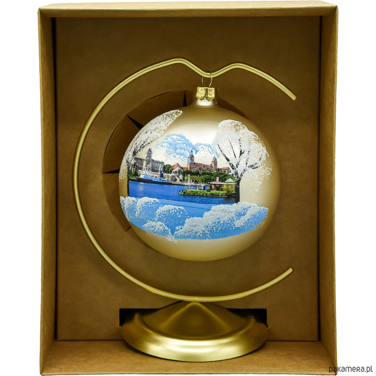 Wytworna, ręcznie malowana bombka przedstawiająca panoramę Szczecina nad Odrą (Wały Chrobrego) w zimowej oprawie. Szklana kula o średnicy 10 cm została posrebrzana od środka, dzięki czemu pięknie odbija światło lampek choinkowych. Zestaw uzupełnia elegancki, metalowy stojak w kolorze złota – dzięki niemu ozdoba może zdobić nie tylko choinkę, ale także komodę, recepcję czy biurko przez cały sezon. To idealna bombka ze Szczecinem dla mieszkańców, miłośników miasta i turystów szukających jakościowej pamiątki.