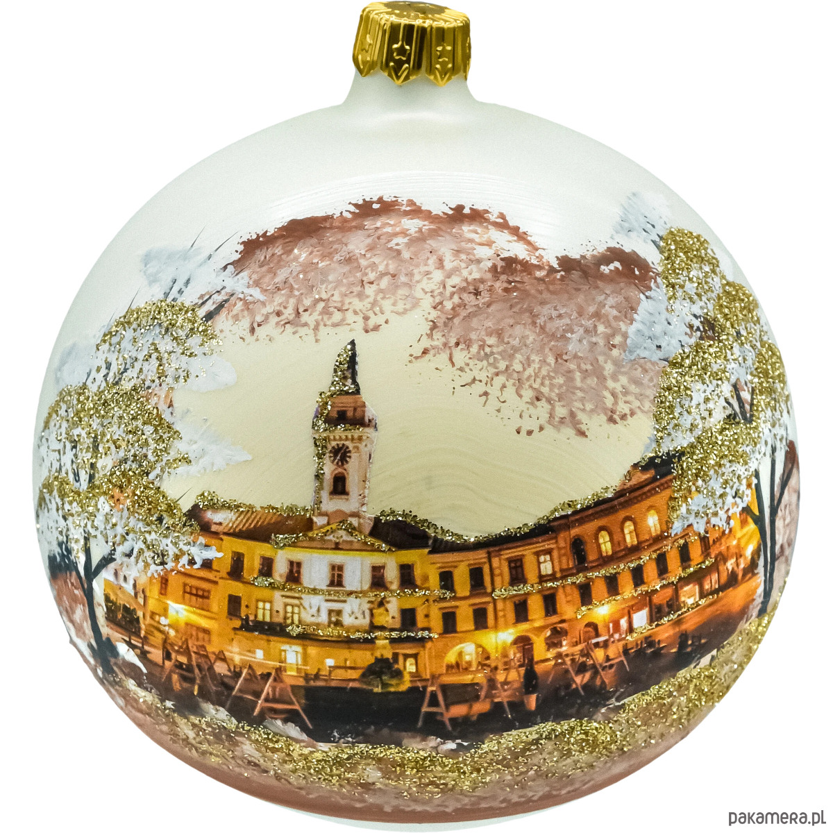 • Motyw: Cieszyn – Rynek / ratusz w zimowej scenerii, ręczne malowanie + brokatowe detale.