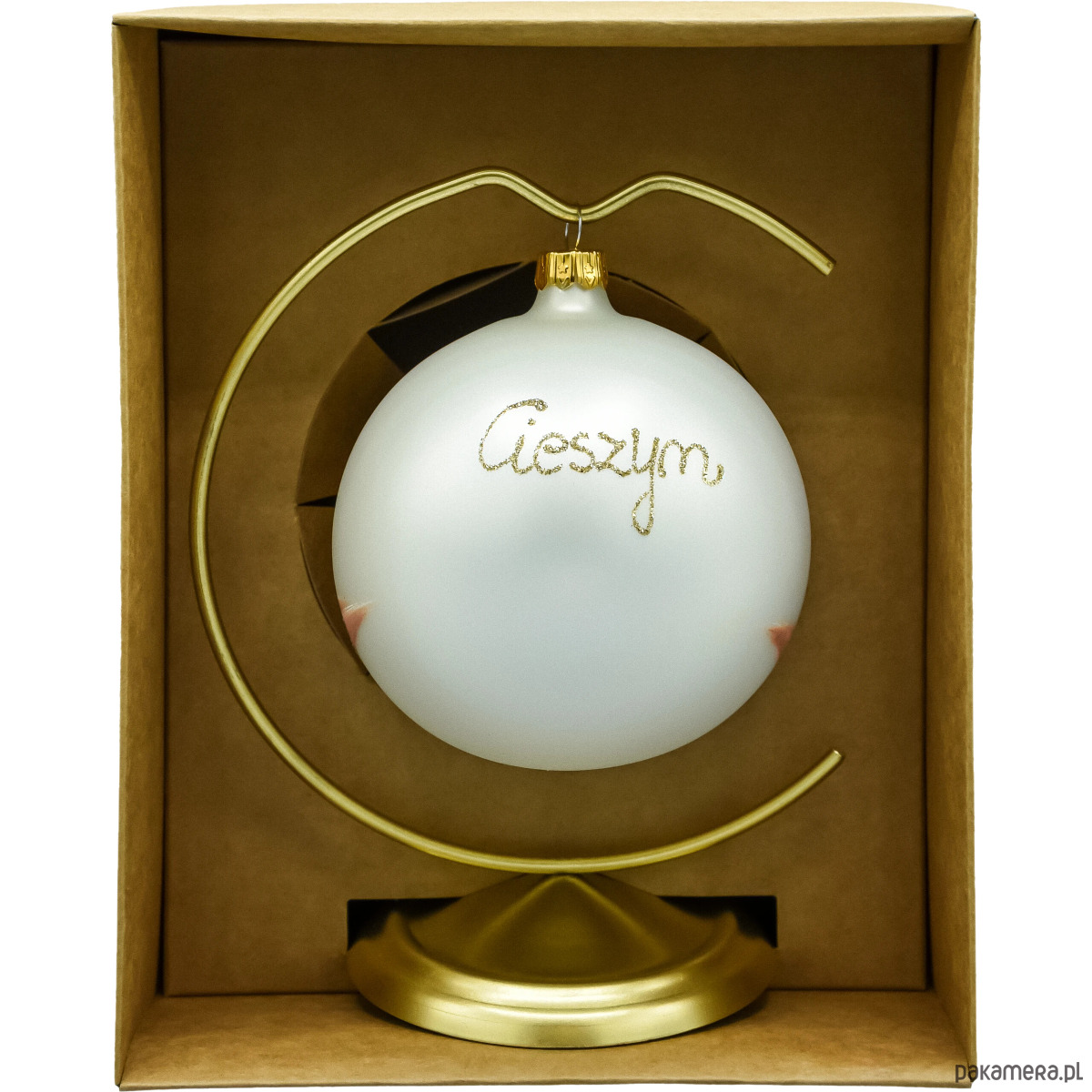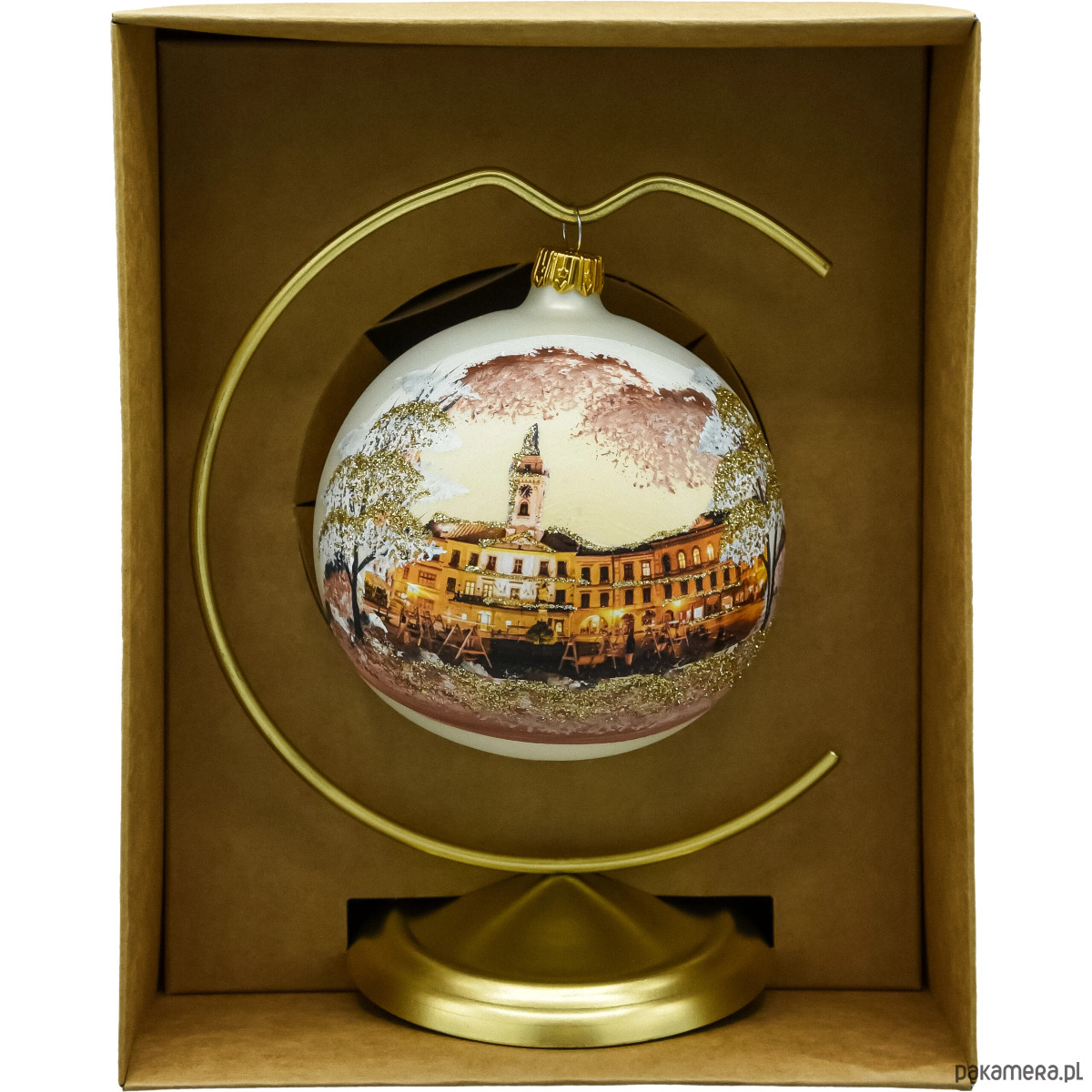 Oddaj magię świąt i urok historycznego Cieszyna w jednej, kolekcjonerskiej ozdobie. Ta ręcznie malowana szklana bombka „Cieszyn” (10 cm) przedstawia nastrojową panoramę Rynku z ratuszem w zimowej oprawie. Subtelne akcenty brokatu podkreślają światła miasta, a na rewersie widnieje złoty napis „Cieszyn”. W komplecie otrzymujesz elegancki, złoty stojak, dzięki któremu ozdoba może zdobić dom nie tylko na choince, ale przez cały rok – na komodzie, biurku czy w witrynie.