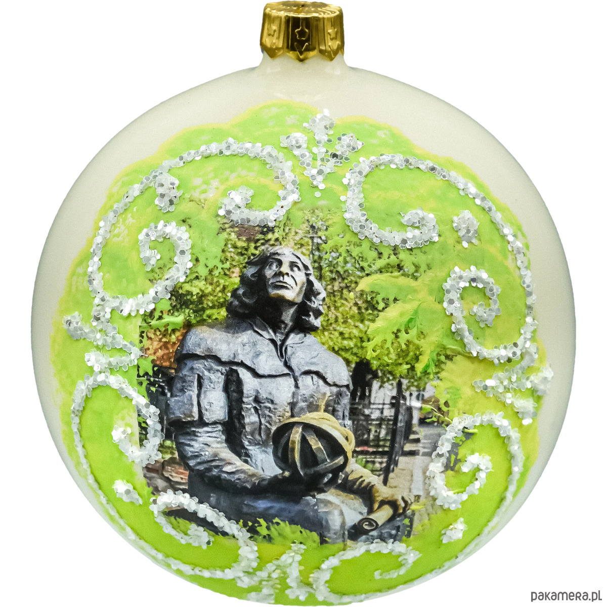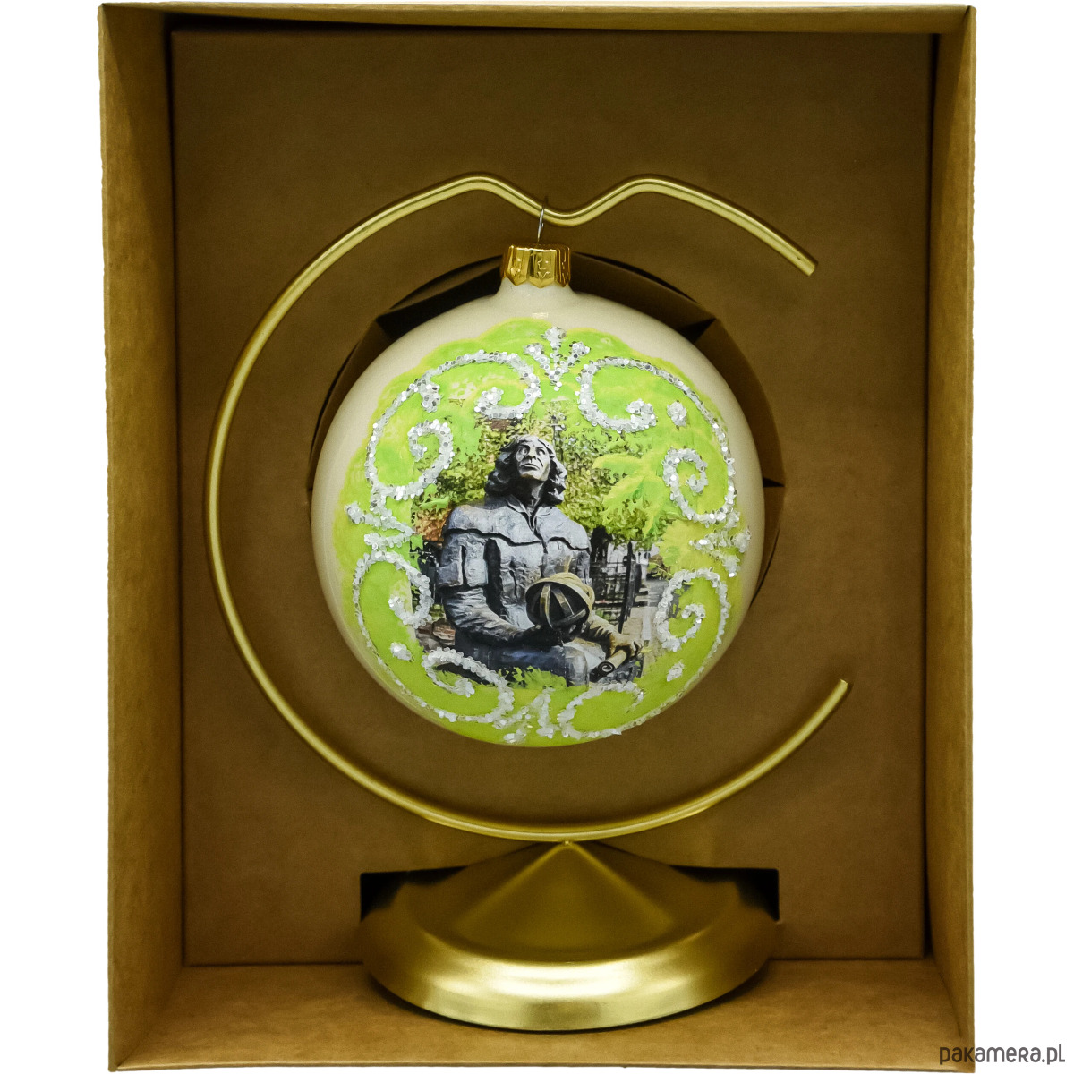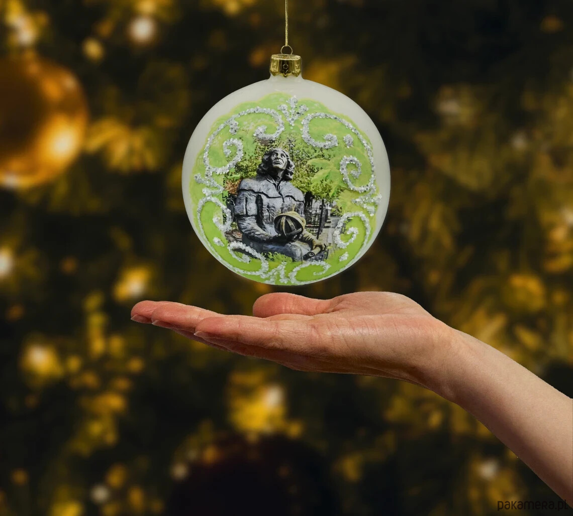 Przenieś świąteczny klimat Warmii do swojego domu. Ta elegancka bombka szklana 10 cm „Olsztyn” przedstawia słynny pomnik Mikołaja Kopernika w dekoracyjnej ramie z brokatowych ornamentów. Wydmuchana ustnie, srebrzona od środka i ręcznie malowana – zachwyca migotaniem oraz głębią kolorów. W komplecie otrzymujesz stabilny metalowy stojak w kolorze złota, dzięki któremu ozdoba pięknie prezentuje się nie tylko na choince, ale także cały rok na komodzie, biurku czy recepcji.