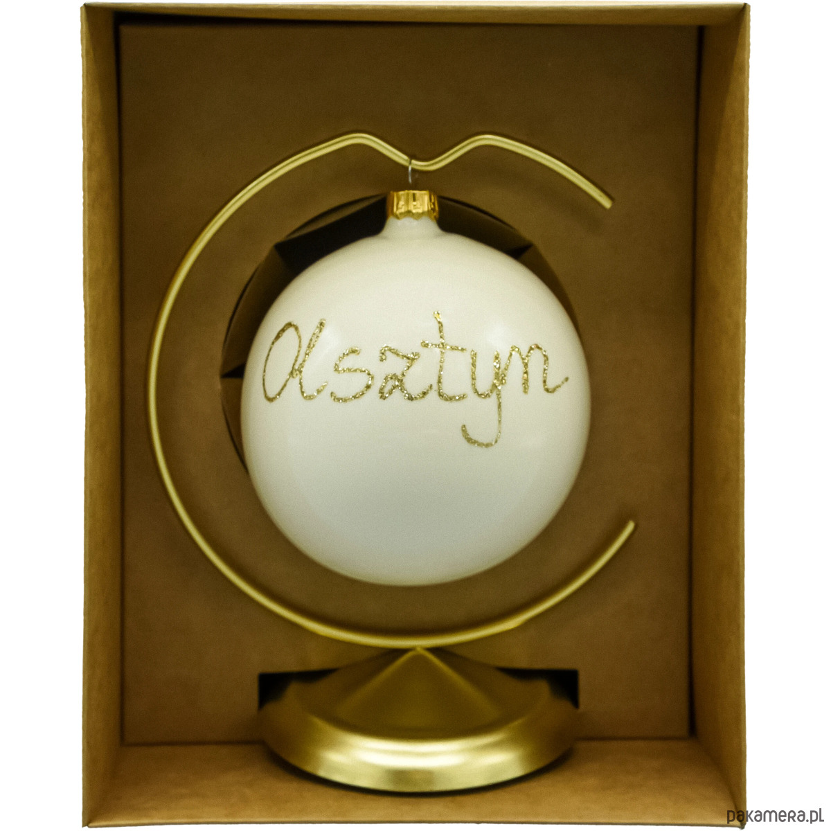 • Zestaw: bombka + metalowy stojak (złoty) + pudełko prezentowe kraft