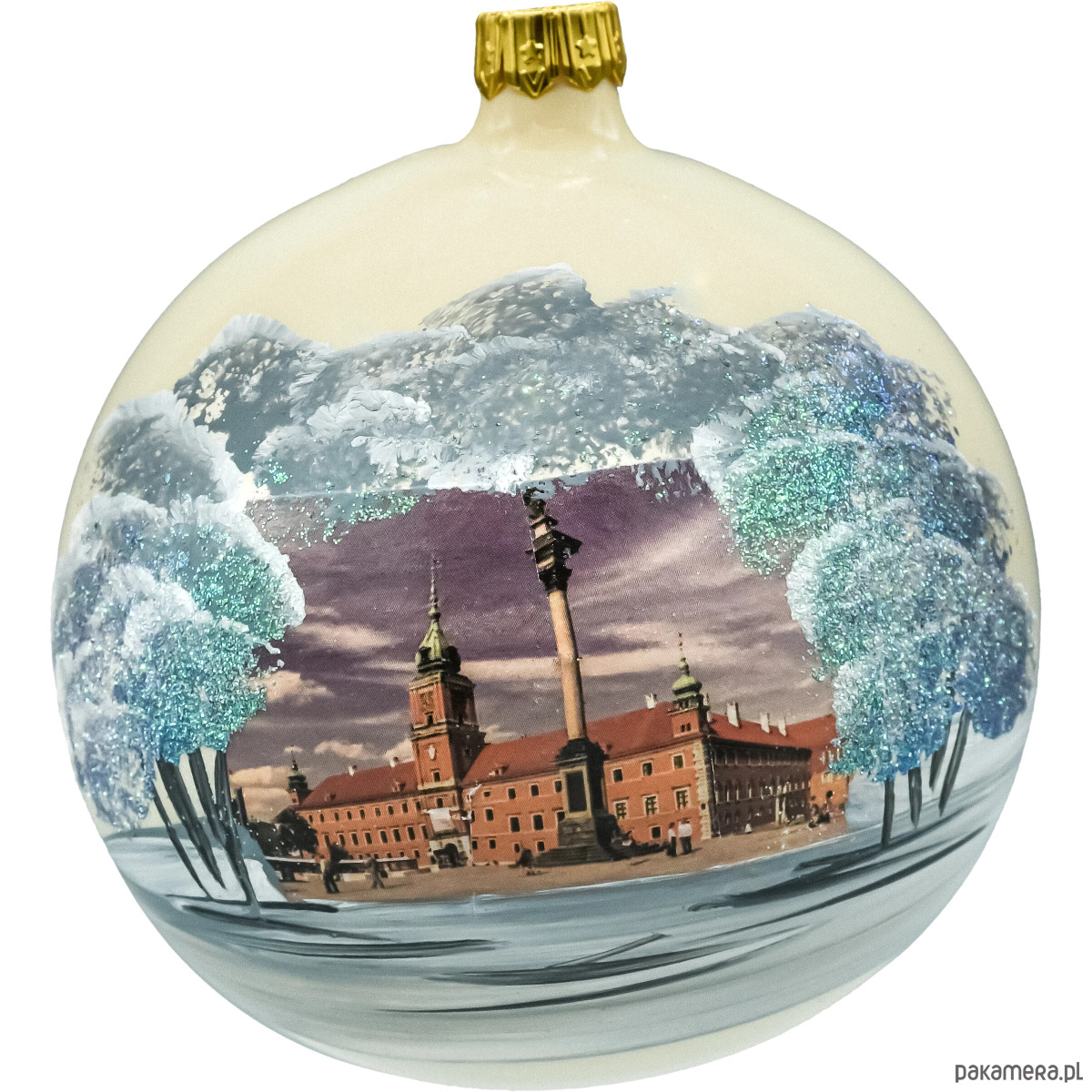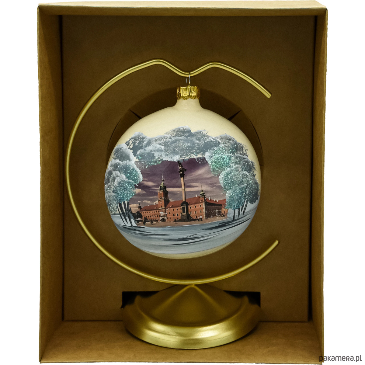 Wyjątkowa bombka „Warszawa” to ręcznie malowana, polska ozdoba z prawdziwego szkła, prezentująca najpiękniejszą wizytówkę stolicy – Zamek Królewski i Kolumnę Zygmunta. Scena zamknięta jest w zimowej ramie: połyskujące śniegiem korony drzew, subtelne cienie i migotliwy brokat dodają głębi oraz efektu „śnieżnej kuli”. Kremowo-perłowe tło ociepla kompozycję, a złota korona (zawieszka) harmonizuje ze złotym stojakiem dołączonym do zestawu. To gotowy, elegancki upominek – zarówno jako bombka na choinkę, jak i dekoracja całoroczna wyeksponowana na półce, komodzie czy biurku.